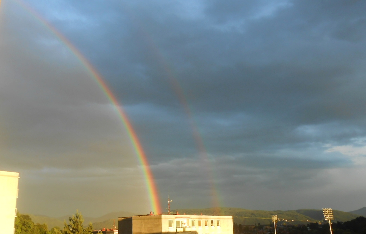 Na zpáteční cestě jsem ještě vyfotila zřícenu hradu Skalka a pak už jsme se vydali na něco dobrého do Opárenského údolí. O tom jsem psala loni. Tam už nás zastihl docela slušný slejvák, takže jsme se rozloučili s ostatními a jeli směr domov. Ještě zmíním zajímavé názvy vesniček a vesnic kolem hradu, jako je Košťálov, dále např. Sutom, Vlastislav, Klapý, Úpohlavy, Režný Újezd. Ono jich je určitě víc, napsala jsem jen ty, co mi padly do oka. Nakonec fotka duhy po nedělní bouřce.
