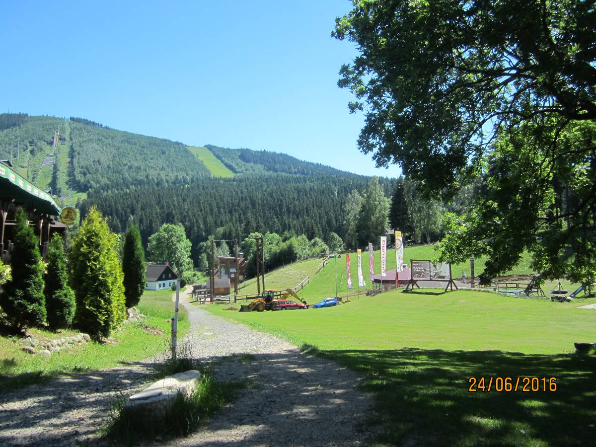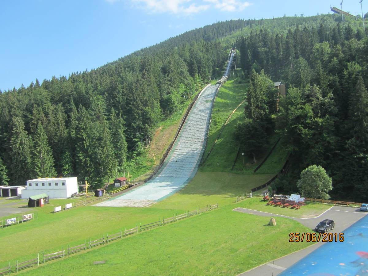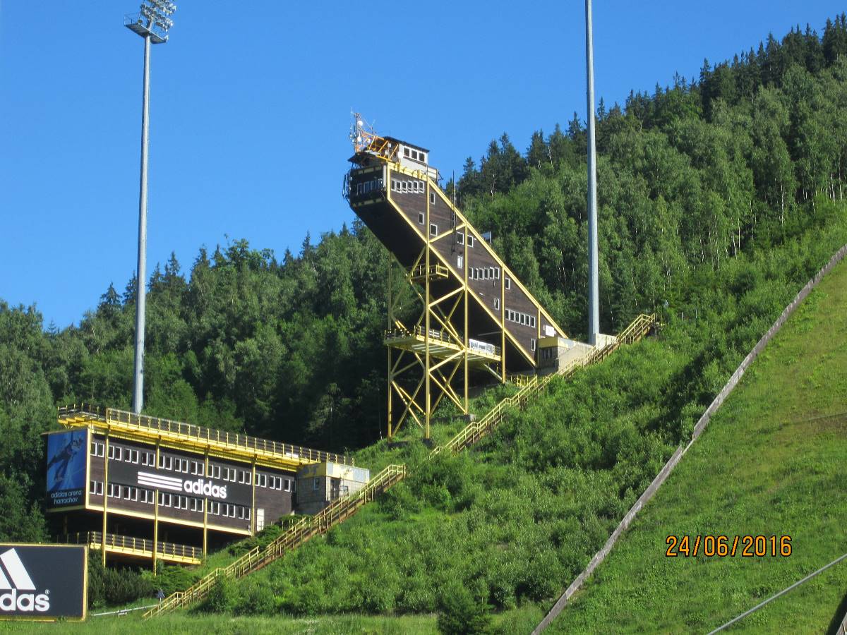 Čertova hora je opravdu obrovský kopec ve výšce 1 020m, na kterém se nachází největší mamutí můstek pro lety na lyžích v České republice. První můstek zde byl postaven v r. 1920 a "Mamut" byl vybudován v r. 1980. Na Mamutovi se uskutečnila řada vrcholových soutěží včetně mistrovství světa. Vrchol hory poskytuje krásné vyhledy do okolí a je skvělým výchozím místem por pěší turistiku. Na Čertově hoře je také startovací plocha pro vyznavače létání na padácích a závěsných kluzácích. Na vrchol hory jezdí lanovka a tou jsme i my jely. Bohužel jsme špatně vyhodnotily situaci, protože jsme na vrchol jely až v 17 hod. A tak zpět dolů jsme musely šlapat pěšky. Jednalo se o úzkou cestičku, na které byly velké šutry a sešup byl velmi příkrý. Přiznám se, že jsem si sáhla na dno sil, a když jsme se dostaly po značném úsilí a vyčerpání do hotelu, každá jsme vypila 2 piva.