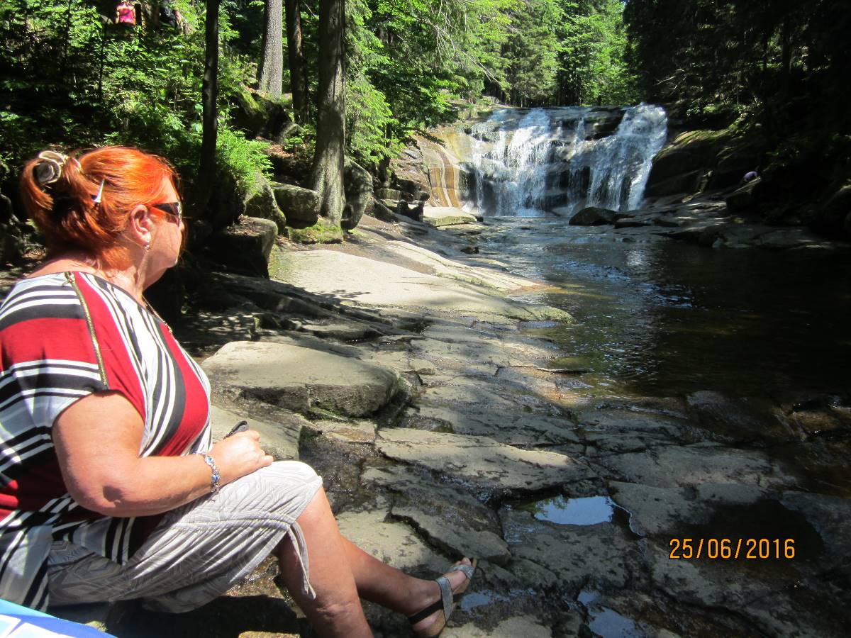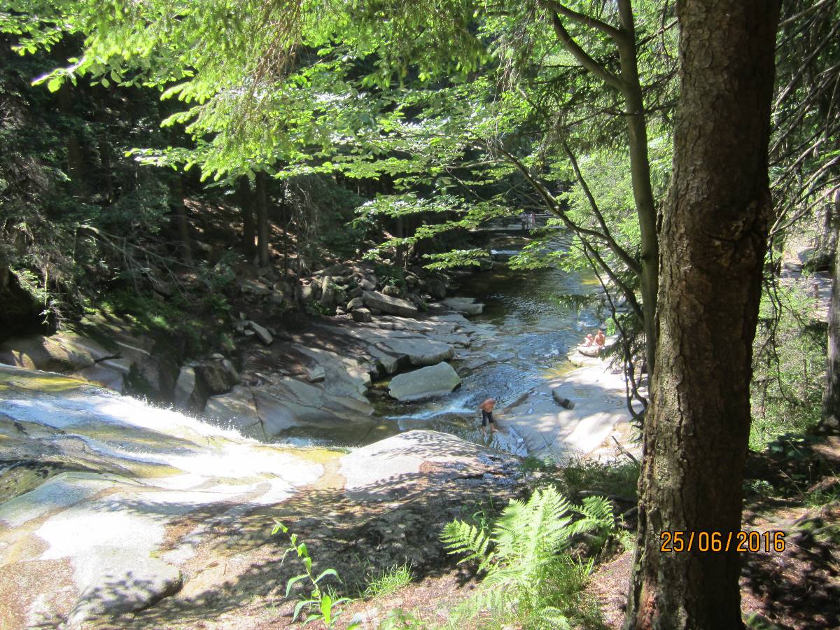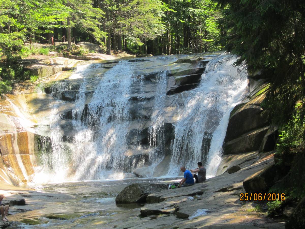 Druhý den jsme pojaly jako oddechový, vypravily se jen tak procházkou na Mumlavský vodopád. Od města je vzdálen cca 2 km. Řeka Mumlava tady padá přes stupňovitě uspořádané skalní bloky. V řečišti se nacházejí obří hrnce, tzv. Čertova oka, která dravý proud řeky Mumlavy vymlel v žulových stupních. Vodopád je vysoký cca 10 metrů a působí velmi mohutně. Vede k němu pohodlná cesta, u níž také stojí Mumlavská bouda (původní hájovna), kde jsme se zastavily na jídlo.