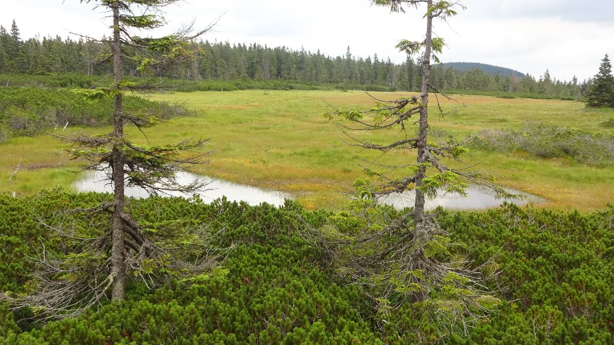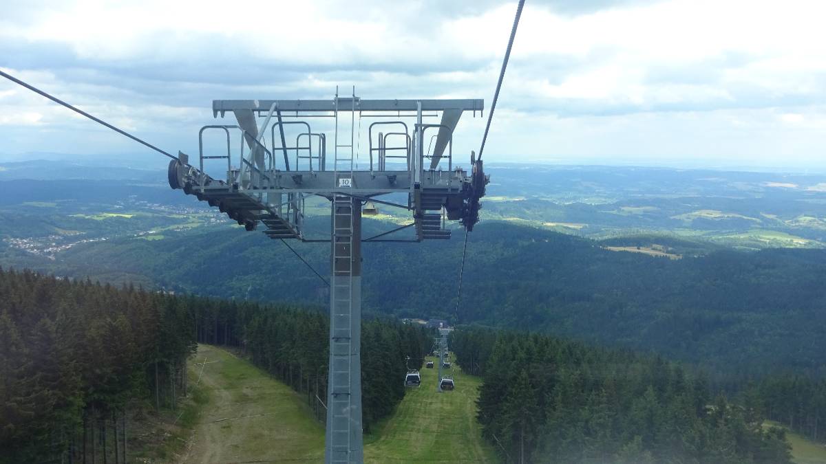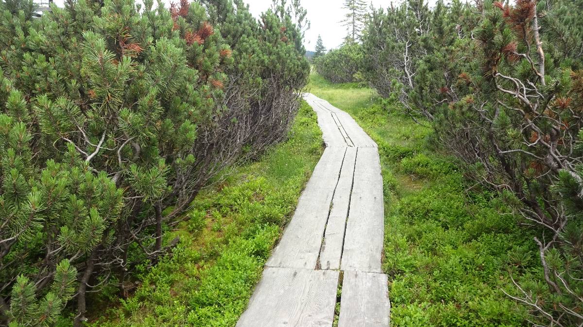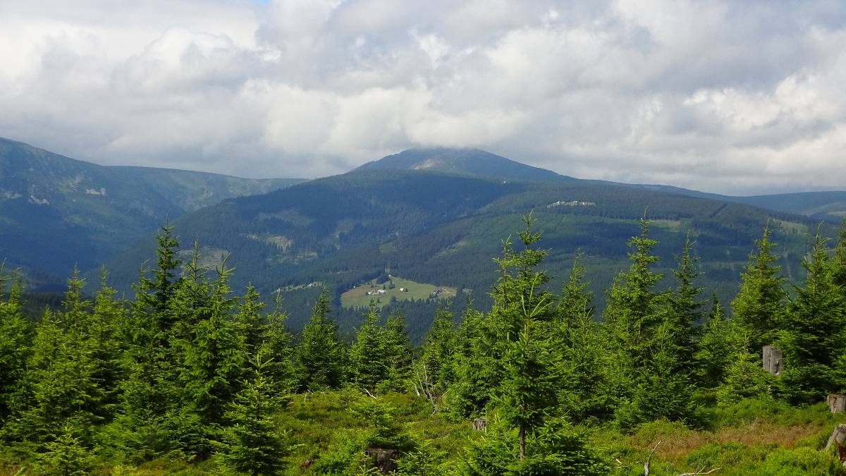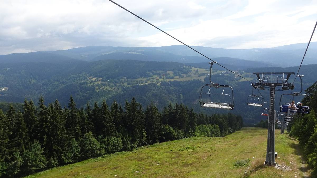 Další lanovka zvaná Černohorský expres nás vyvezla z Janských Lázní na Černou horu. Jízda přes sloup č. 10 mi připomněla, jak jsem se dole před 4 roky šťastně drápala do svahu. Černé nízko letící mraky naznačovaly, že každou chvíli začne pršet, ale mě neodradily od toho, abych si aspoň neobešla Černohorské rašeliniště. Nakonec se docela vyčasilo a 3,5 km procházka po dřevěných lávkách vedoucích rašeliništěm plným kvetoucích rašeliníků se vydařila. Také tato vycházka má moje doporučení. Sněžka sice nesundala mrakovou čepici, ale ovečky zapózovaly a poslední lanovku směr dolů jsme stihli.