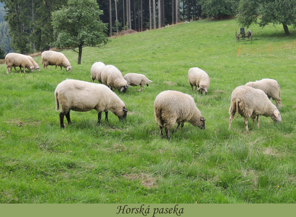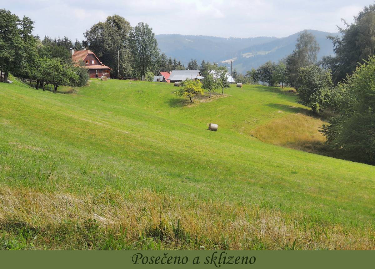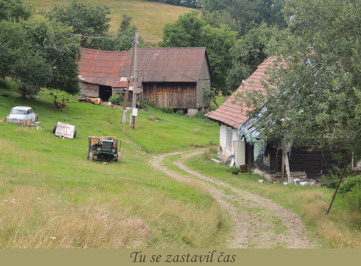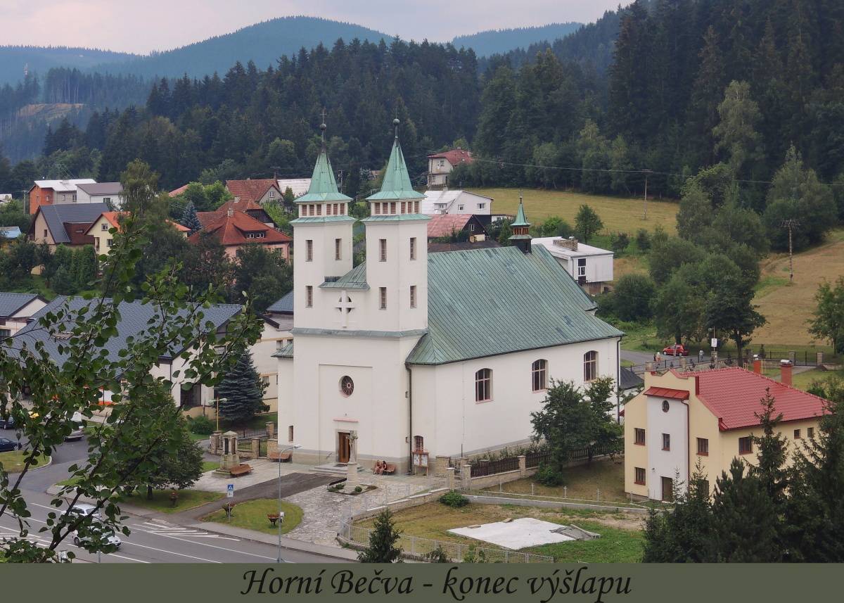 Bufet hotelu Martiňák byl otevřený, posezení při pivě a kávičce přišlo vhod. Před námi byl sestup do vesnice Horní Bečva. A byla to nejzajímavější část našeho výšlapu. Střídaly se lesní úseky s úseky pasek. Největším zážitkem byla zemědělská usedlost, kde ve svahu pod stromem odpočíval staříček, kousek od něho držel siestu statný býk a kolem nich staré stroje, vozy, dokonce i auto. A na chalupě byla část střechy nahrazena plachtou. Podmínky k životu mizerné, ale ta krásná příroda kolem.