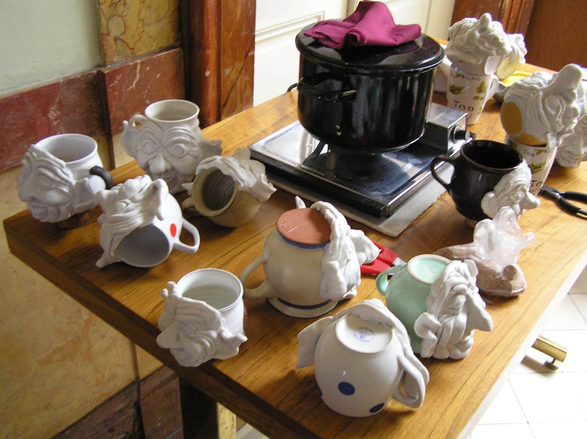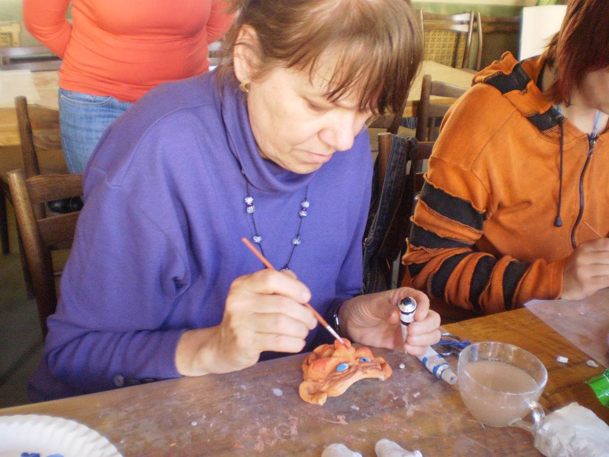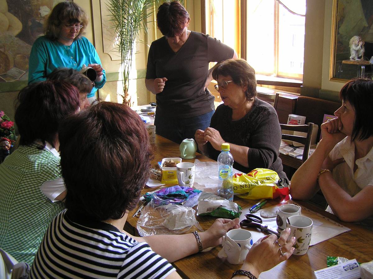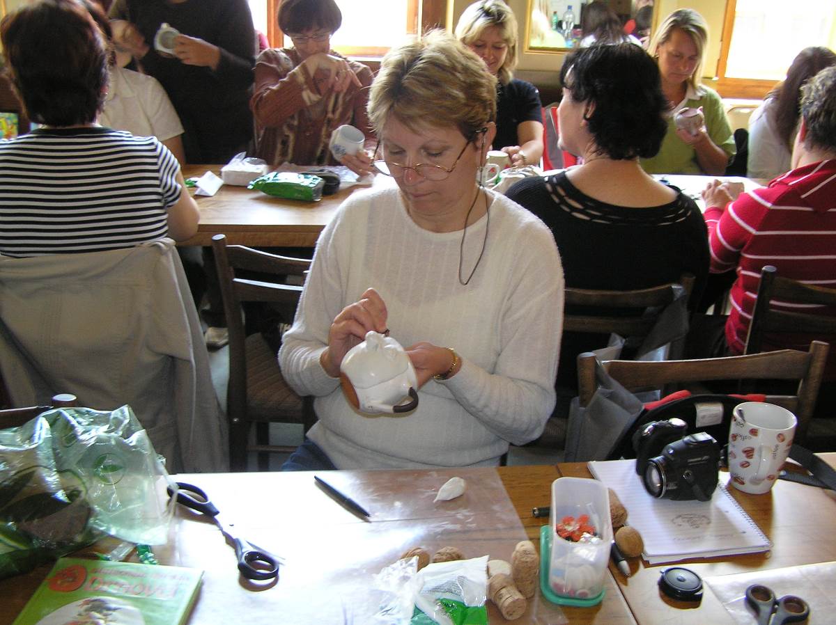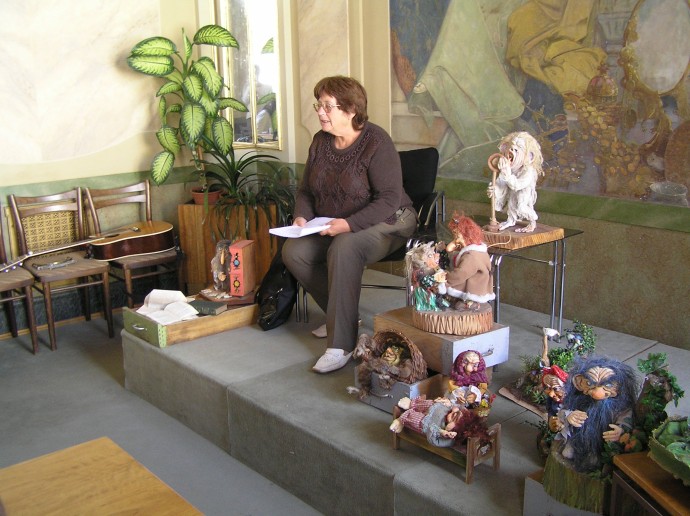 Nejzajímavějším a nezapomenutelným setkáním se stala tvůrčí dílna pro nás knihovníky, kdy jsme měli  možnost „nahlédnout pod pokličku“ a nejen poodhalit tajemství vzniku pohádkového skřítka, ale také si ho vytvořit vlastníma rukama. To se vezme kousek moduritu, rozválí  se a připlácne na porcelánový čajový hrnek. To je základ budoucího obličeje. Postupně se z malých válečků hmoty vytvarovaných podle potřeby přilepuje nos, oči, obočí, rty a nakonec i tváře a brada. A obličej dostává svůj výraz. Celá „tvář“ se pak společně s hrnkem několik minut vytvrdí ve vařící vodě a po vychladnutí  se skelet sloupne a vybarví podle fantazie tvůrce. To vše jsme se naučili a zvládli to všichni. (viz obrázky v galerii) Nebudu popisovat, jak se při výrobě loutky postupuje dál. Jen, že je k tomu třeba ještě drátěná konstrukce na tělíčko, dřevěný špalík na hlavičku, molitan , gáza, obinadlo a látka na obleček. A k tomu samozřejmě hodně trpělivosti  i fantazie tvůrce. Byli i tací mezi námi, kteří se do toho individuálně pustili, a výsledky nebyly zas tak nejhorší. Hlavně se přitom každý dobře pobavil.