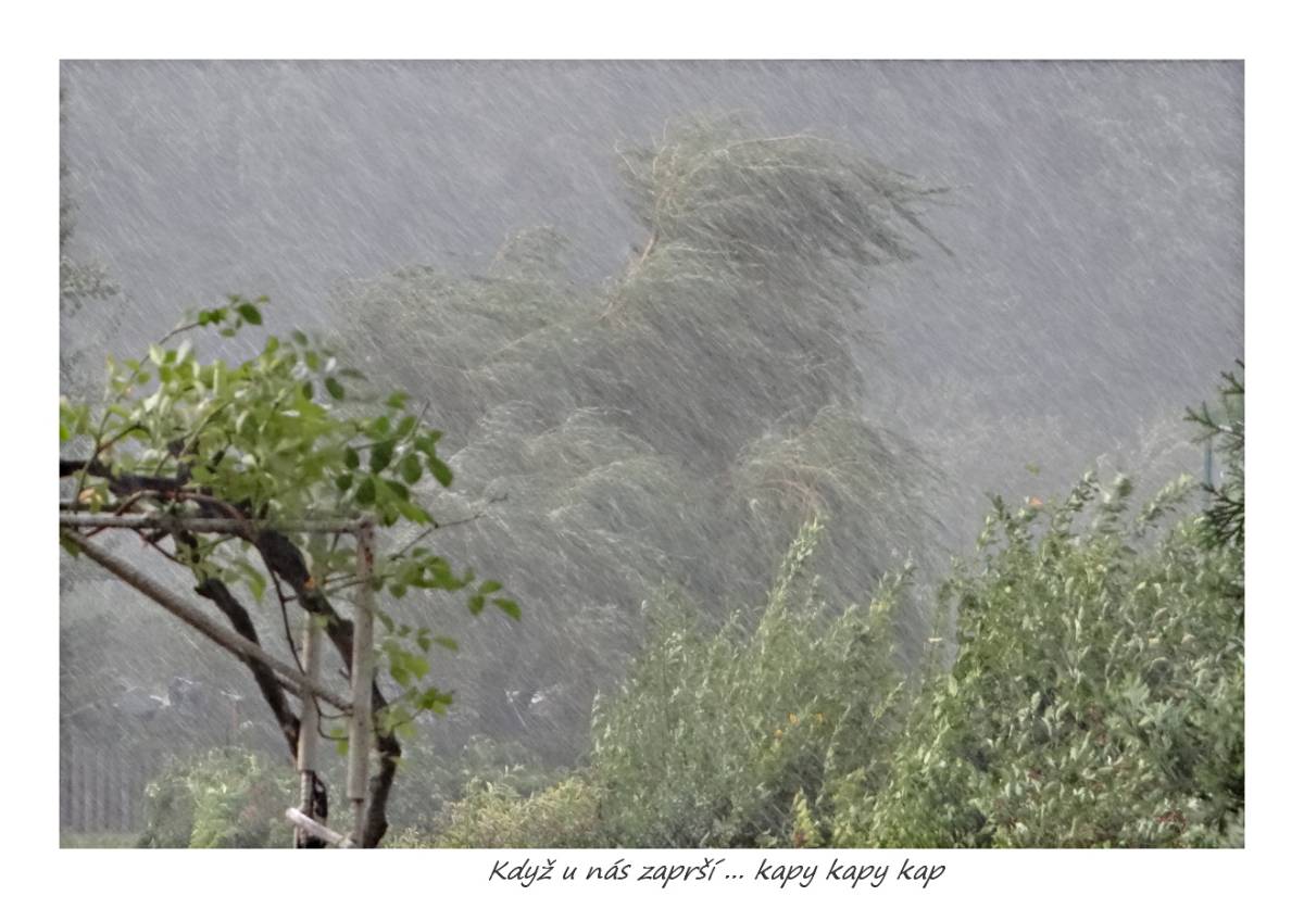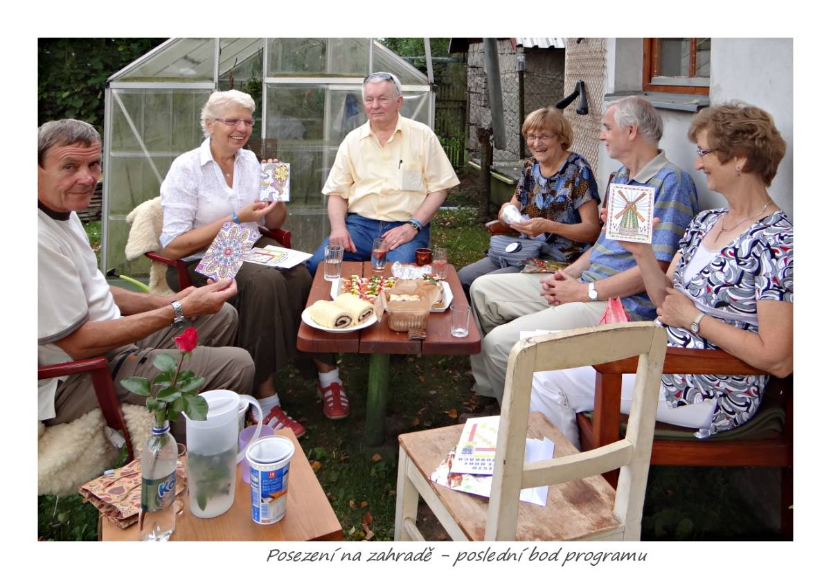 Čeká nás poslední bod programu. Přesun na naši zahradu. Zdenka s Janou přispívají ke společnému pohoštění svým dílem a je nám prostě skvěle. Konečně můžeme připít Jitce k narozeninám – připíjíme vodou!!! Ta je přece silná, užene i mlýn. K dobré náladě alkohol nepotřebujeme, bavíme se i bez něj, nikomu nechybí. Povídáme si, pojídáme dobroty a tu z ničeho nic začne lít. Honem vše nastěhujeme do chatky. Věřte nevěřte i ten liják jsme pro naše hosty naplánovali, ať vidí, že Jeseníky mají i drsnou tvář. Nechce se nám loučit, ale čas je neúprosný.