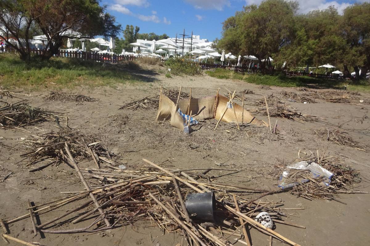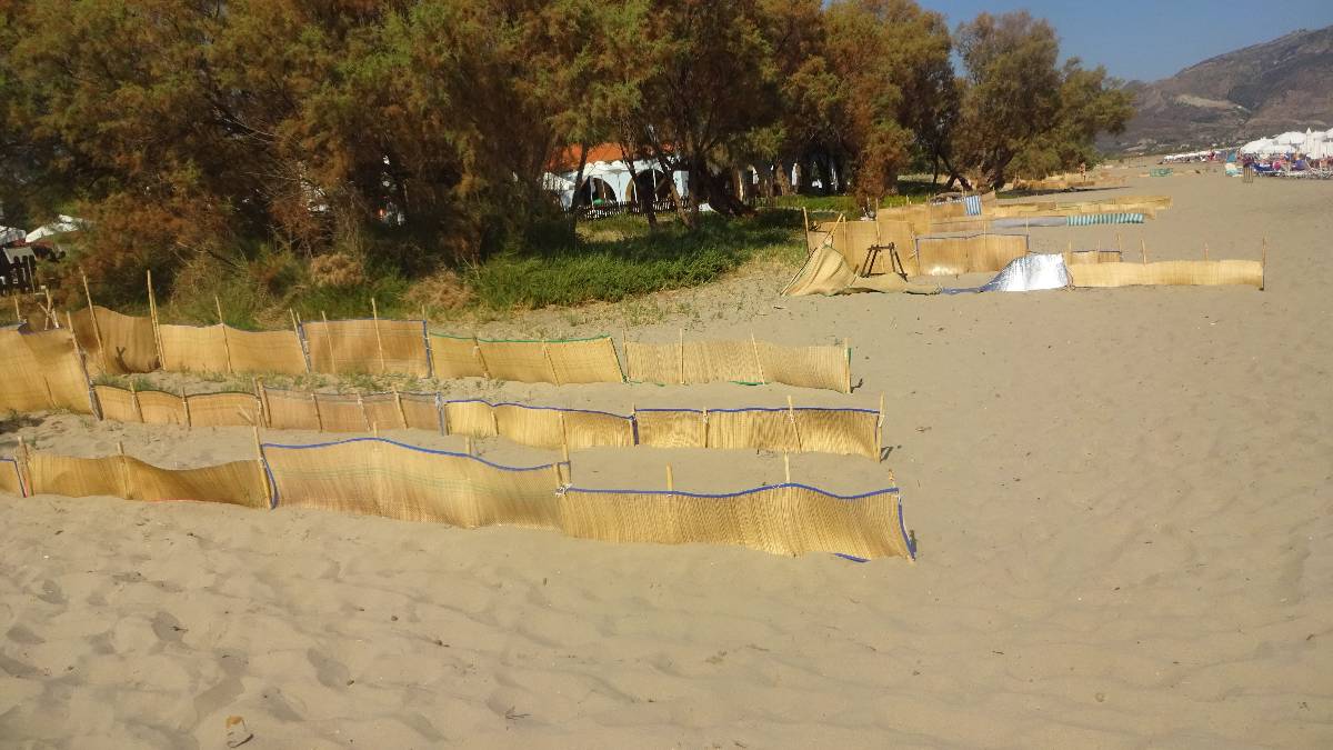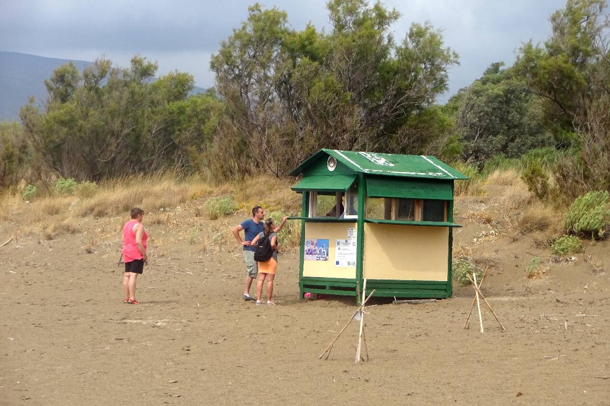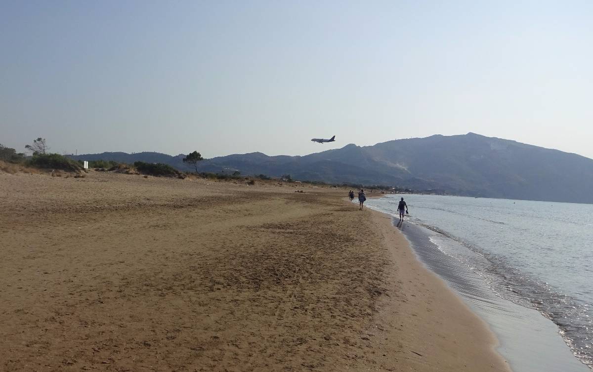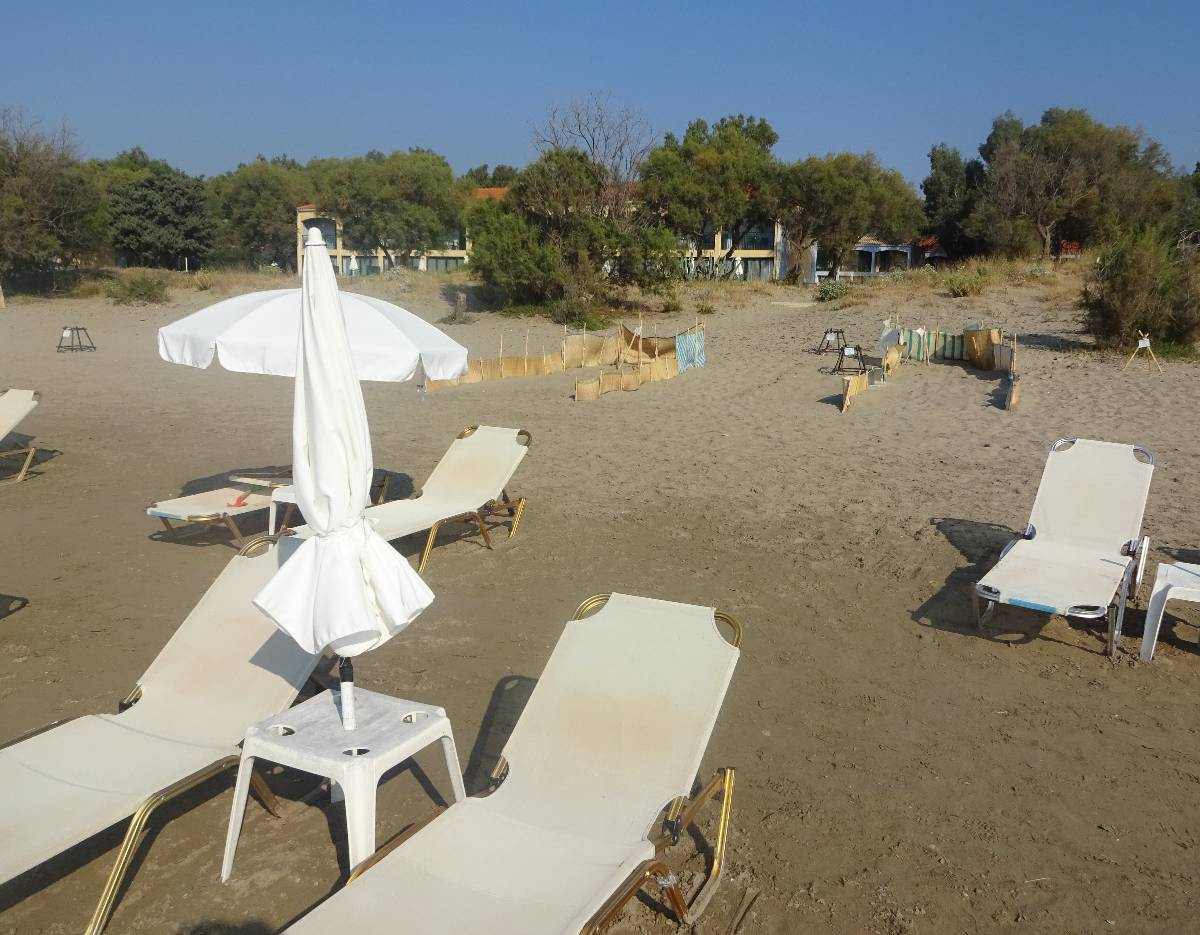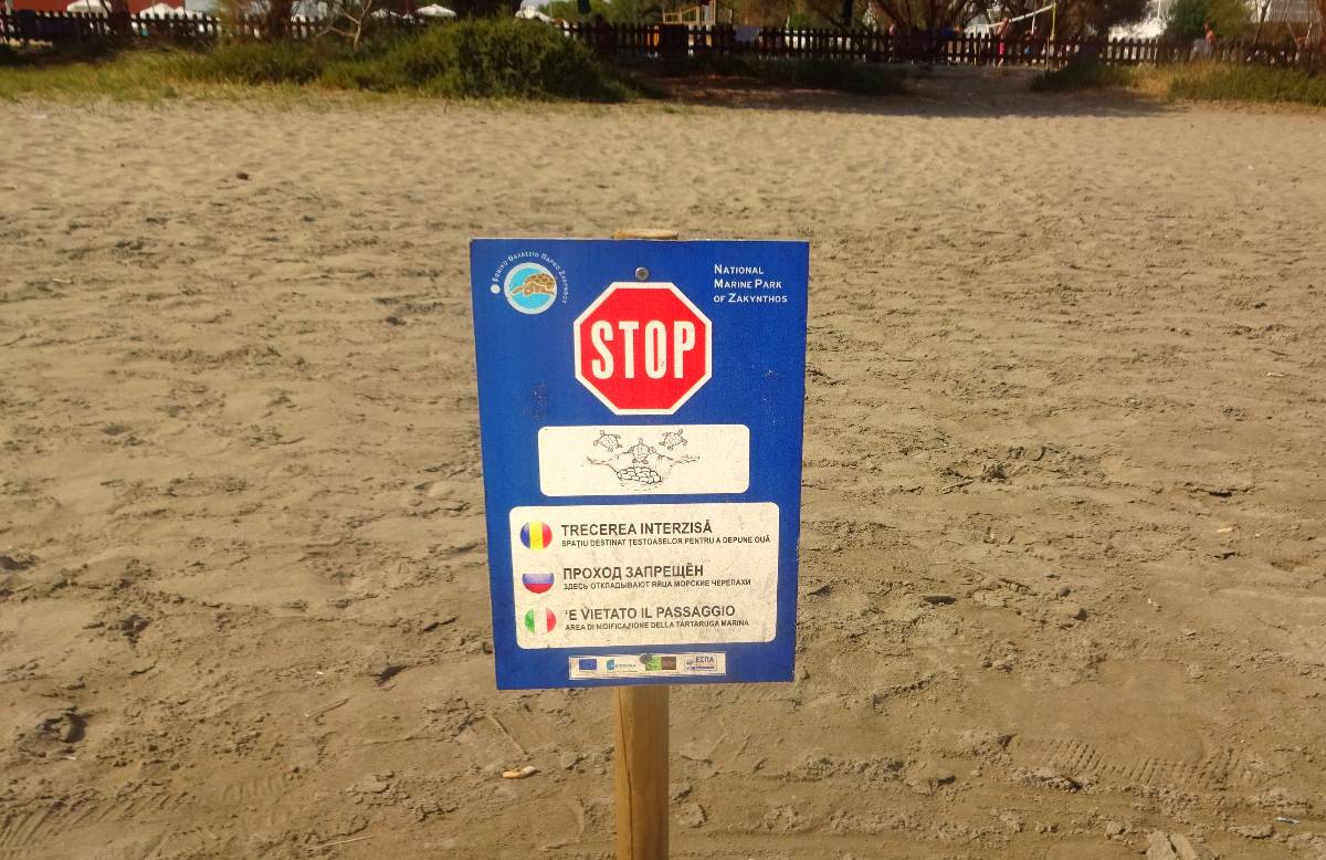 Teď však něco k želvám opravdovým. Mezi Laganas a Kalamaki se táhne několikakilometrová pláž, zasažená "želví invazí". Hned za říčkou Laganas stream, která se zde vlévá do moře, začíná území patřící želvám, přírodní park... Ještě na začátku pláže za říčkou jsou sice lehátka se slunečníky, ale po pár metrech je tu už nenajdete. Ne, že byste se zde nemohli v čisťounské vodě koupat, to ano. Ale můžete si jen položit osušku ke slunění na okraj moře. Jakmile ji totiž dáte dál, tedy vlastně blíž k želvím hnízdům, je u vás strážce přírodní rezervace a vykáže vás i vaši osušku zase hezky zpátky blíž k moři. Na pláži mají svůj kiosek, kde odpoví na různé otázky a mají k dispozici informační materiál.