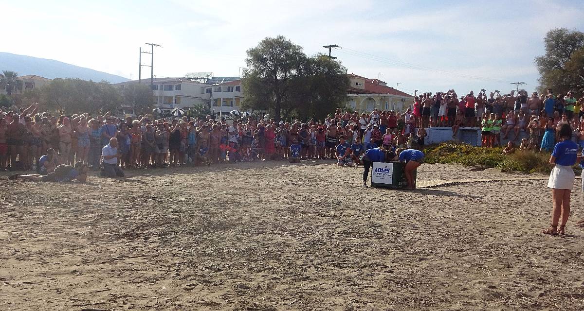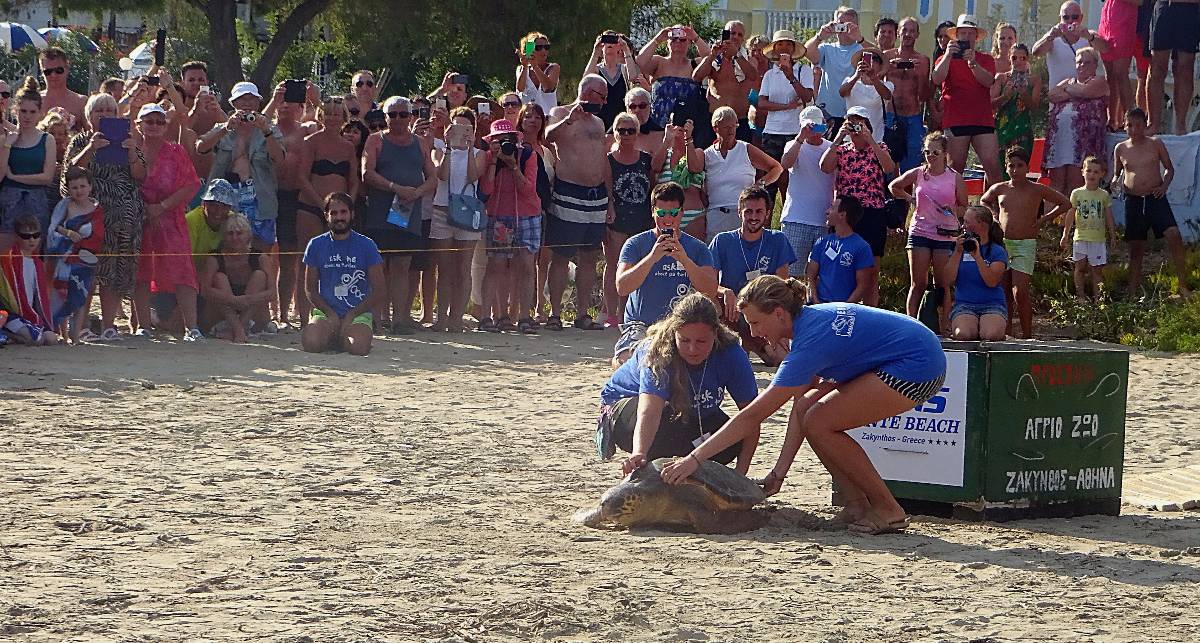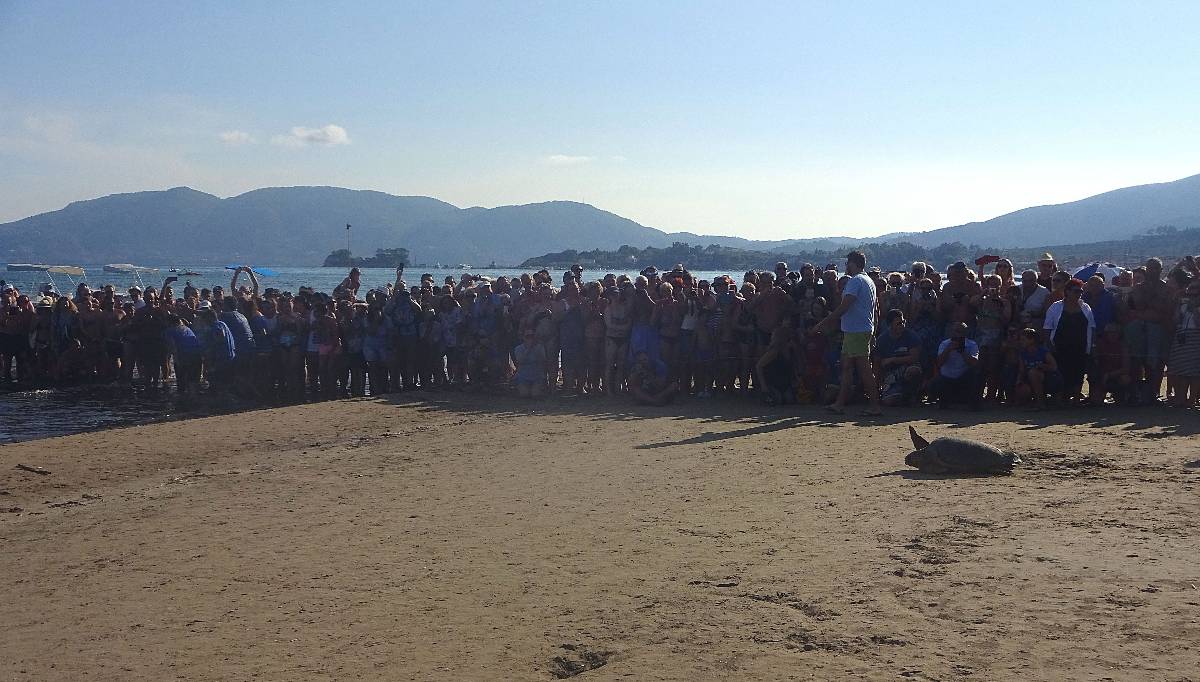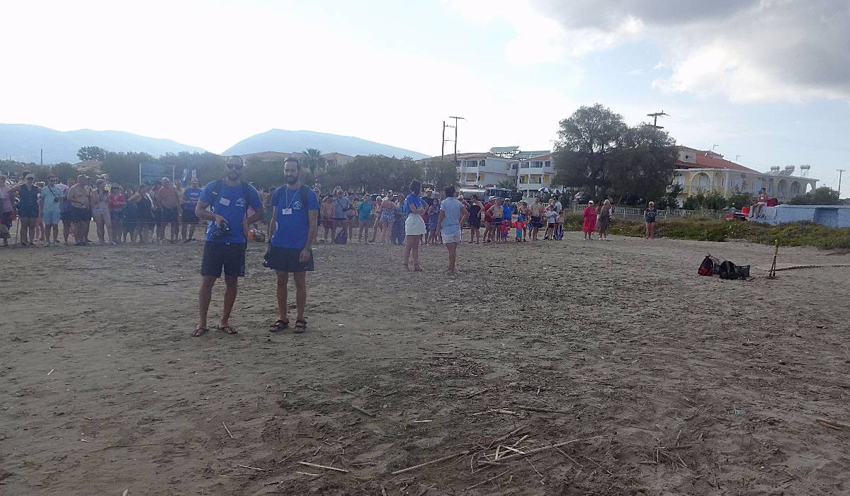 Ještě pár okamžiků a zmizela pod hladinou. Špalír ve vodě na pravé straně postoupil jako jeden muž stranou, neb želva se asi rozhodla plavat k ostrůvku Marathonisi (Želví ostrov), který je tím směrem. Zatleskali jsme a dojati se rozešli ke svým plážovým taškám a barům s občerstvením. Pro mě to byl krásný zážitek a připravila jsem krátké video, které zachycuje právě poslední metry putování želvy do moře.