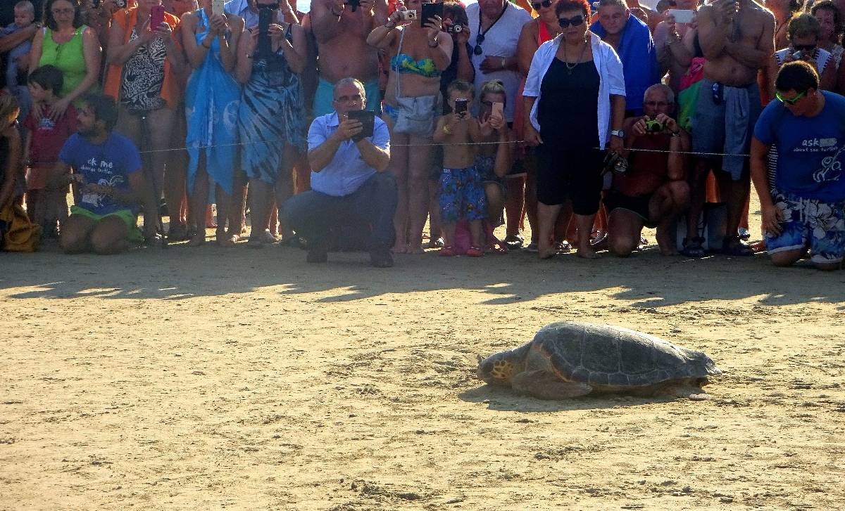 V neděli odpoledne jsme se zúčastnili události, při které byla slavnostně vypuštěna zpátky do moře zraněná želva, kterou se podařilo vyléčit. Chlapci a dívky z ochranářské organizace vytyčovali koridor od jednoho z hotelů přímo do moře. Asi hodinu posunovali sloupky s lany tu pár centimetrů doprava, tu doleva. Zřejmě se snažili odhadnout, kudy se želva bude ubírat (nebo plnili nařízení EU?). Když už to vypadalo, že budu muset svou účast na prudkém slunci vzdát ve strachu v moji přeměnu v sušenku, zaujali fotografové svá místa ve svoje, vkleče i vleže. Byla přinesena velká bedna. Ještě nezbytný projev, který nikdo neslyšel a slavnostní chvíle nastala. Dvě dívky se sklonily nad bednu a vyzvedly velkou želvu. Pomalu ji položily do písku před bednu a nastala chvíle očekávání. Půjde? Nepůjde? Želva se chvíli rozhlížela - asi abychom si ji všichni mohli v krutém protisvětle vyfotit - a pomalu se dala do pohybu ve špalíru nadšených diváků v plavkách. Však špalír vedl až do moře. Mořská želva jaksi nemá nohy, ale ploutve, takže nešla, ale odstrkovala se ploutvemi. Vždycky kousek a zase oddych. Všichni jsme jí strašně fandili, takže nám vyhověla a po několika etapách se ocitla až na pokraji krásného moře, jejího domova.