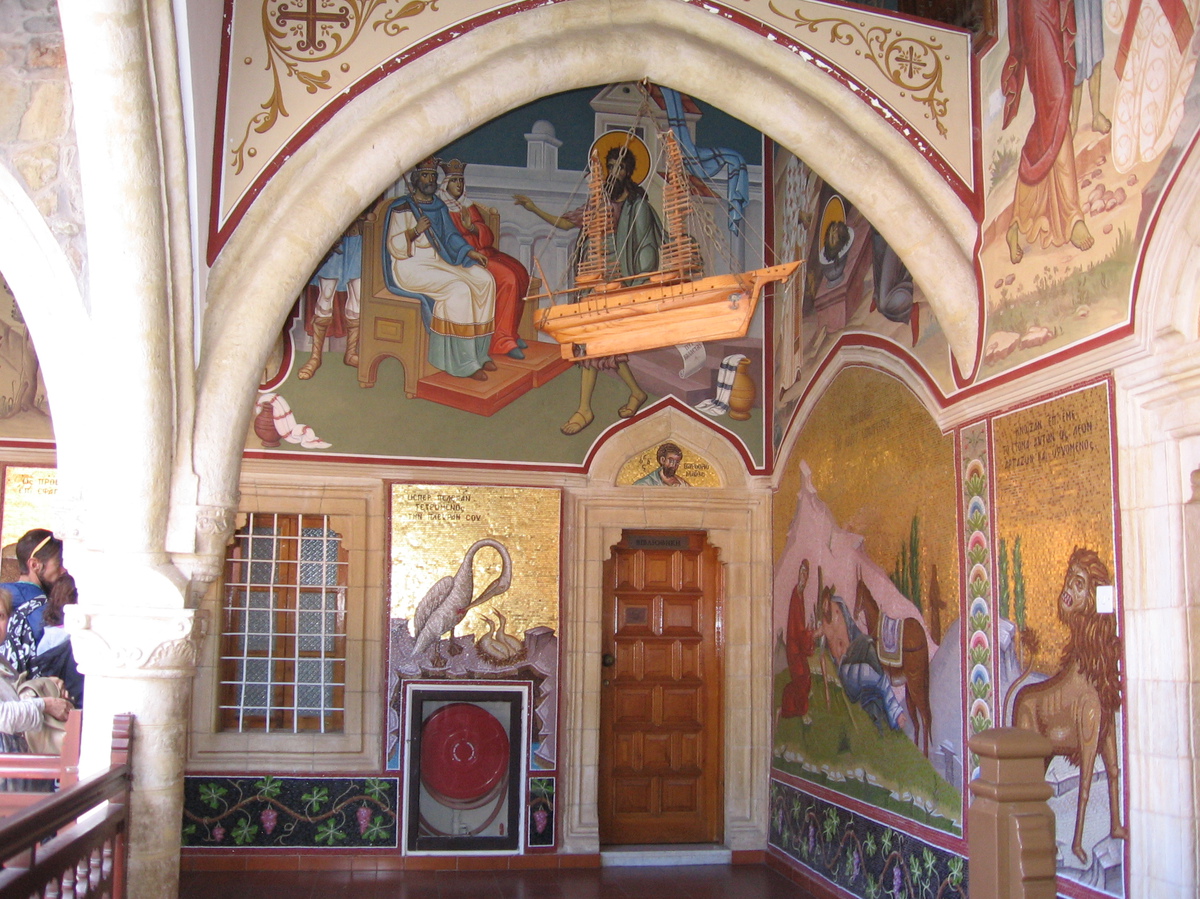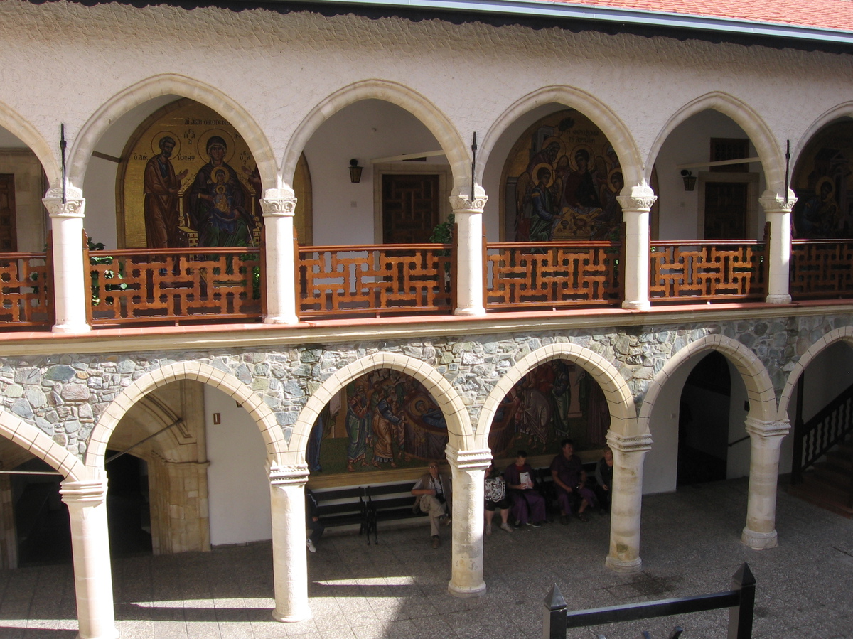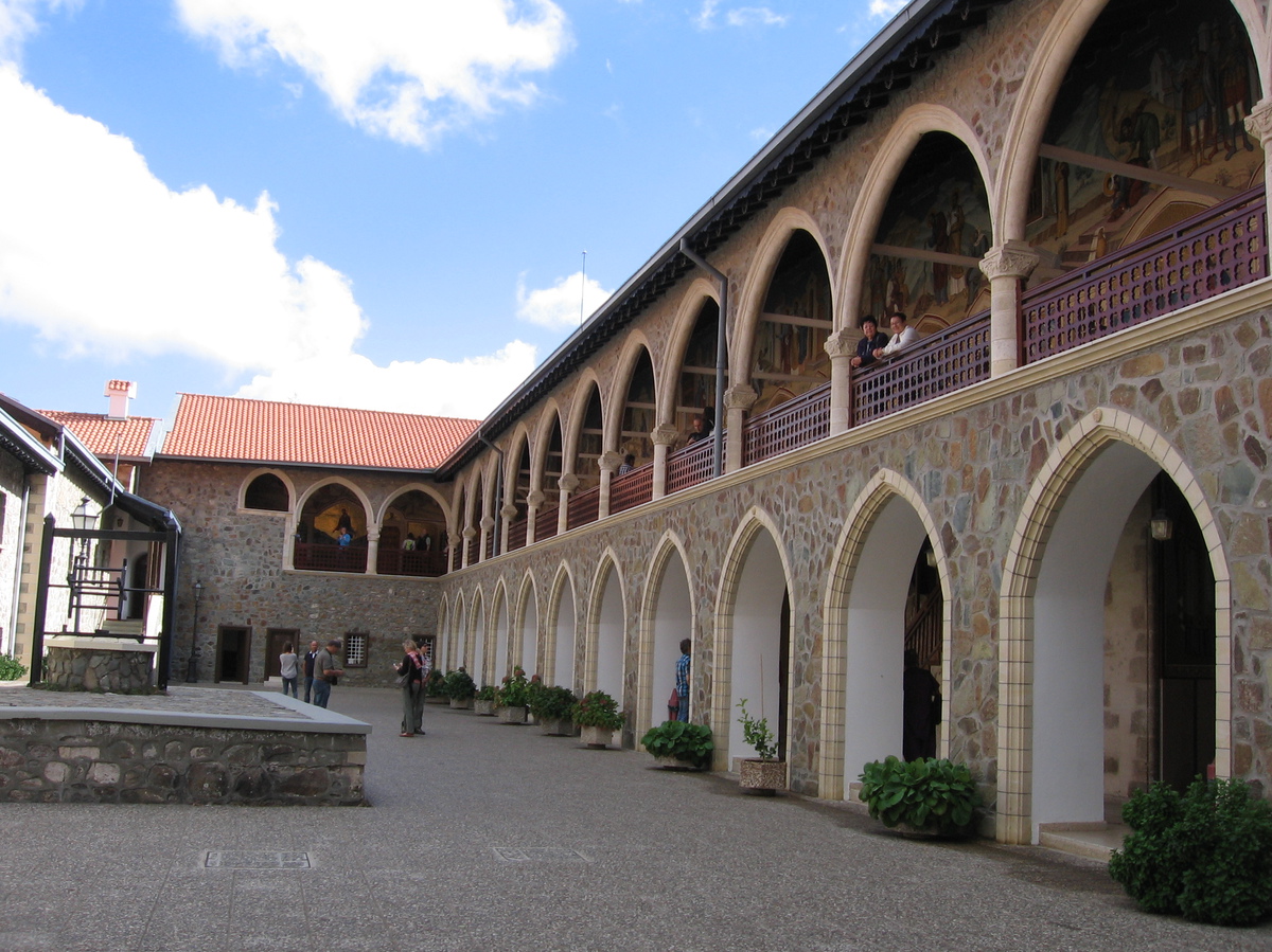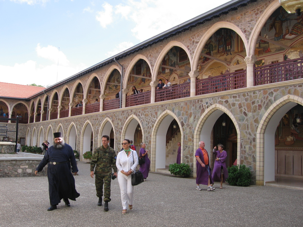 Další den po snídani, která byla na terase nad mořem, jsme jeli do jižní řecké části Kypru do pohoří Troodos. To dosahuje výšky až 2000 m. Jeli jsme dosti dlouho a stále stoupali. Už cesta byla zážitkem, hory, vesničky nalepené ve stráních nebo na skalách, kolem cypřiše, cedry a piniové borovice. V únoru prý tu kvetou opičí orchideje a tulipány, to teprve musí být krása. Naším cílem v Troodosu byl klášter Kykkos, který je moc krásný, ale hlavně nejbohatší na Kypru. Ten sponzoruje studenty teologie, ale i jiné chudé studenty. Klášter byl založen v r. 1092 a je stále aktivní, žije zde 20 mnichů a několik noviců. Celý areál je velmi krásný, je zde hodně nástěnných maleb, ikon, fresek. Mohli jsme si to projít a fotit. Vstup byl jen ve vhodném oblečení, kdo neměl, mohl si půjčit fialový plášť. Je zde také pravoslavný kostel, zde byl přísný zákaz focení. Při vstupu se nám zatajil dech a zůstali jsme stát jak sochy. Lustry, svícny, vše mohutné a ze zlata, ikony, obrazy. Krása nejde ani popsat, je třeba ji vidět. Zde je také velmi vzácná ikona Panny Marie Bohorodičky, kterou prý namaloval evangelista svatý Lukáš. Tu střežil mnich.