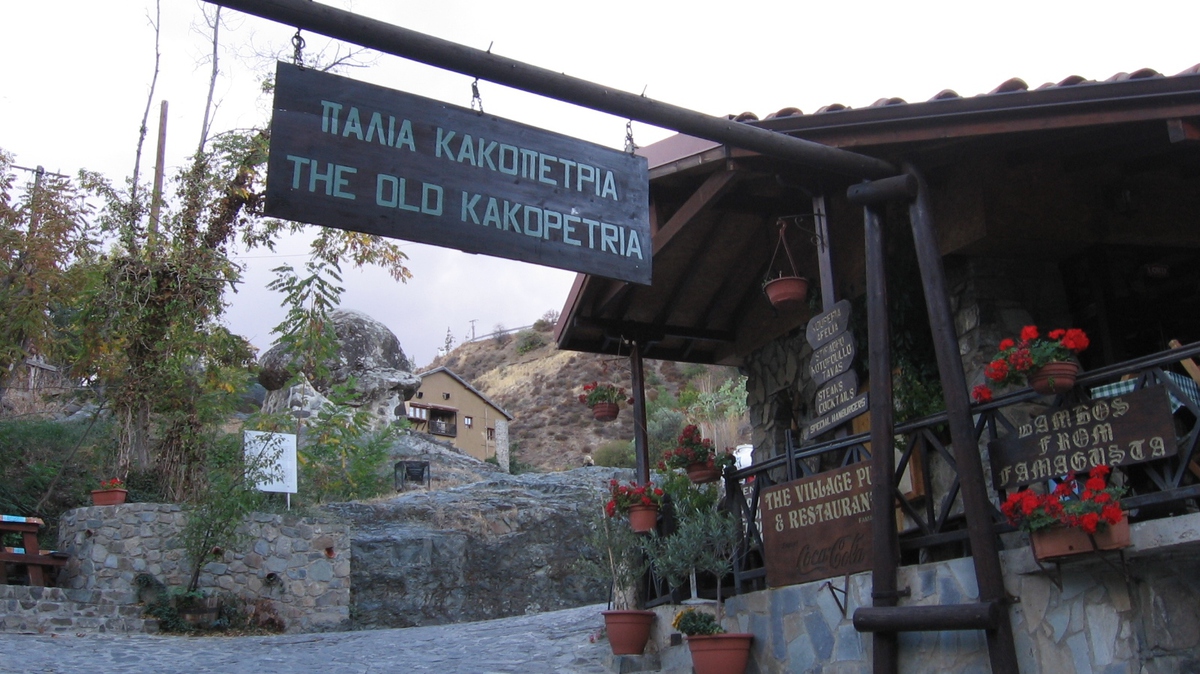 Při cestě zpět jsme se zastavili ve vesničce Kakopetria, kde jsme se prošli starou uličkou ze 14. století. Některé domy jsou upravené na hotýlky, v jiných ještě bydlí staří lidé a nabízejí med, zavařeniny. Před uličkou je zabetonovaný velký balvan. Kdysi tu byla Skála štěstí, lidé si k ní pro něj chodili. Ale jednou na dvojici skála spadla a od té doby je to Zlá skála – Kakopetria. Bylo to asi zemětřesení.