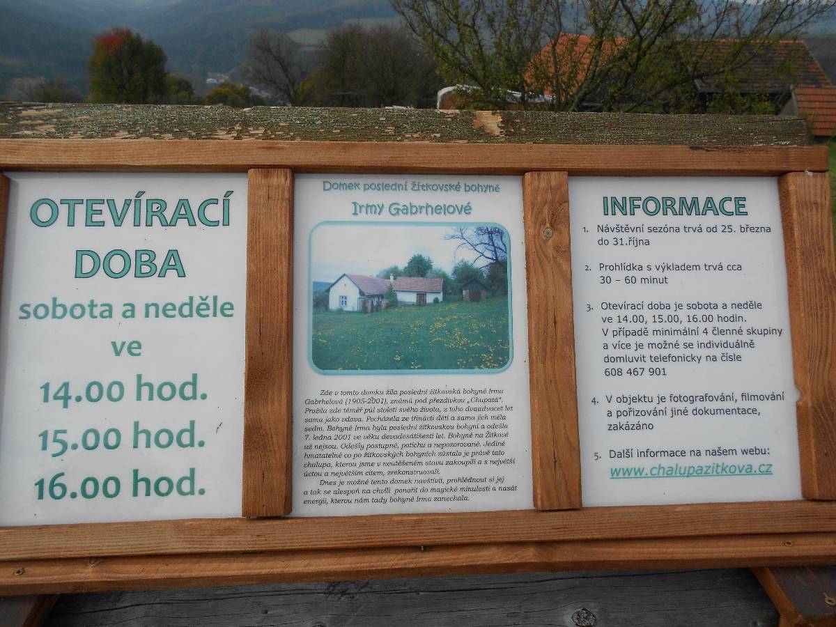 Letos na podzim jsme se do obce zajeli podívat. Domky rozsypané po stráních jednoho z kopců Bílých Karpat, krásné místo, kam se určitě ještě někdy vrátíme. Při procházce obcí jsme narazili na domek poslední bohyně Irmy Gabrhelové (1905 - 2001), který je citlivě zrekonstruován a zpřístupněn veřejnosti.