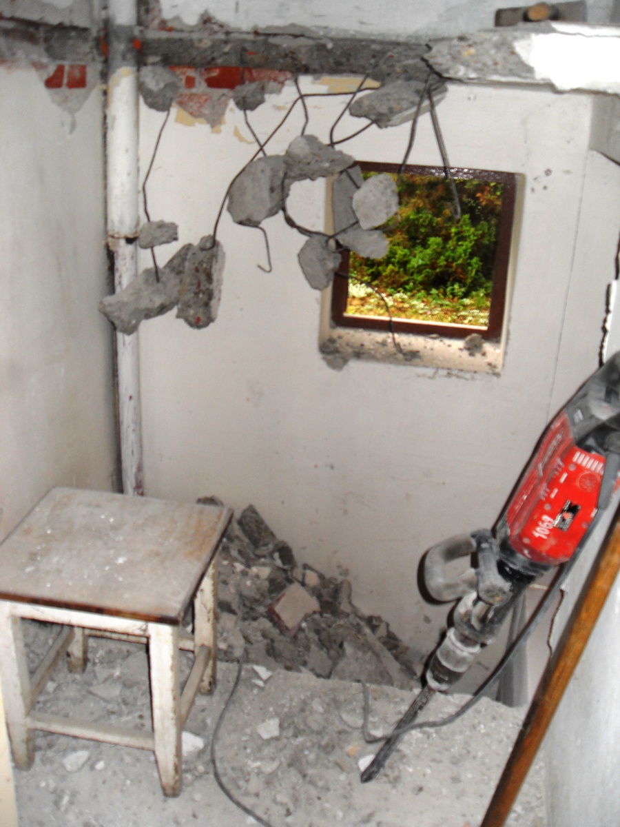 Loni se začalo něco měnit. Naše obec konečně rozhodla o kanalizaci i na naší cestě - podmínkou bylo připojení všech 8 domů v ulici. Kanalizace se řádně zkolaudovala a my stáli před otázkou "Co dál?" Protože se maminka, která v domě bydlela, této změny nedožila, dům byl obydlený námi jen občas, bylo rozhodnuto. Sháněli jsem nápady, jednou u piva našli ochotného človíčka. Slovo dalo slovo a on nám slíbil, že nám udělá slušné sociální zařízení. Ale kde? Ve sklepě je zima, navíc obavy z povodní a v neposlední  řadě i celkem hodně schodů. Nepřipadá v úvahu. Zůstalo jediné řešení. Zrušit špajz a tím vlastně i úložný prostor. Opět bylo rozhodnuto!
