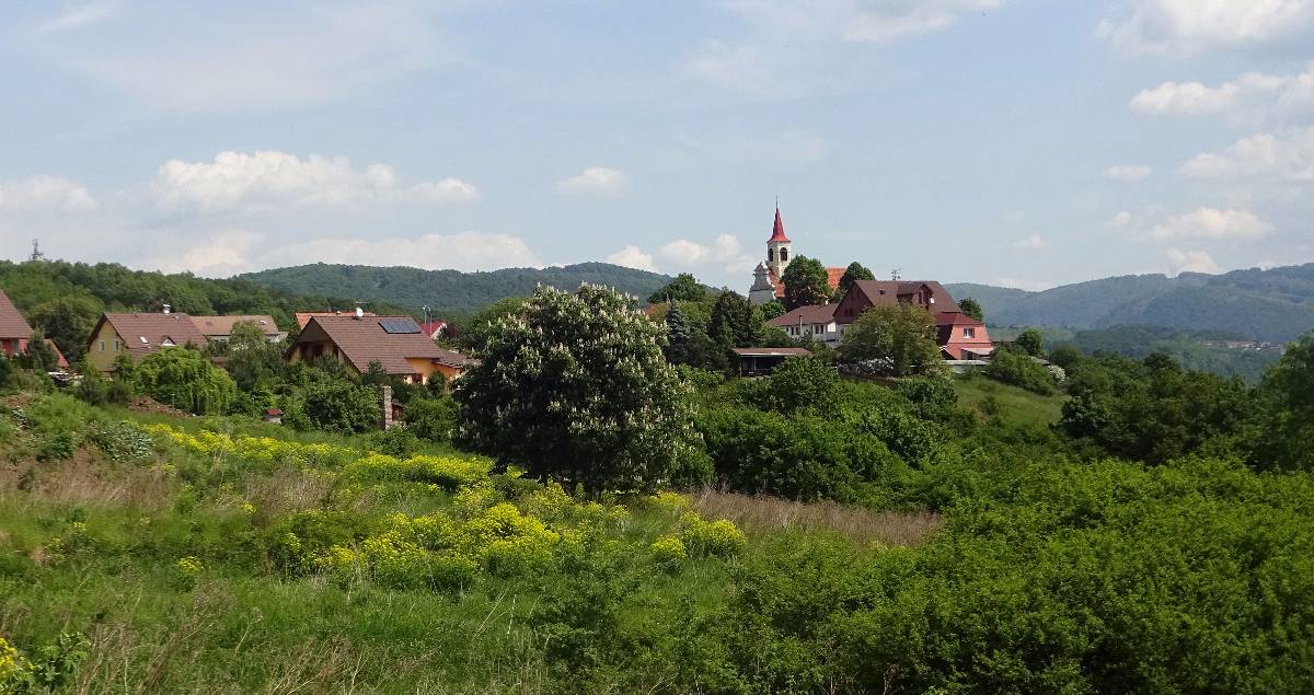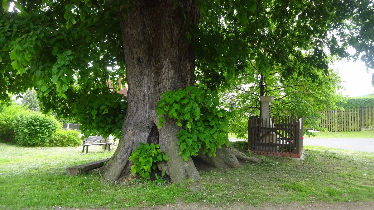 Odtud je to asi 400 m do obce Moravany, ležící na ostrohu vysoko nad Labem. Tam mě u křížku překvapila obrovská lípa.