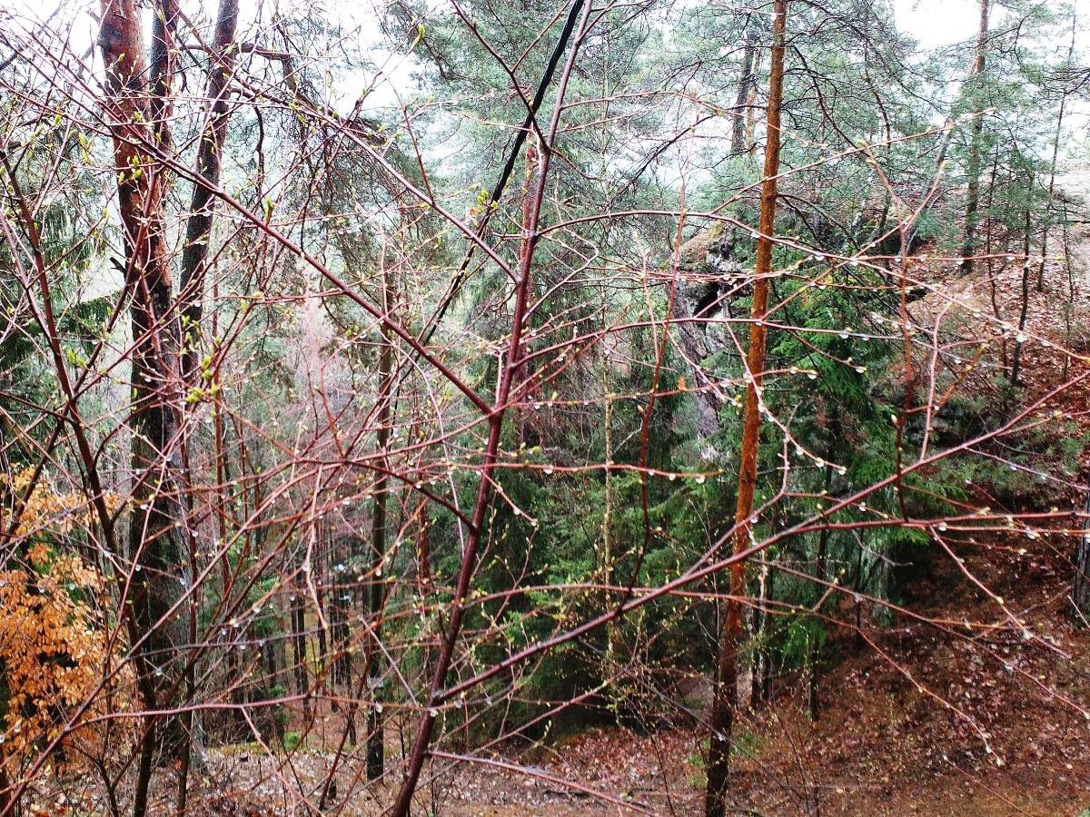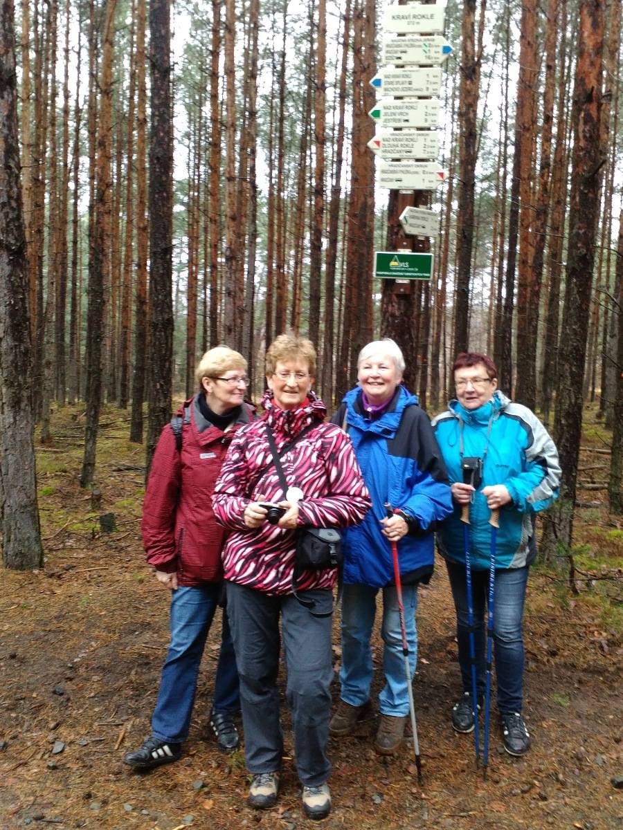 Na výchozí místo do Hradčan vás může dovézt i linkový autobus z Doks. Bohužel, frekvence spojů není tak častá a dostat se tam v sobotu nebo v neděli bývá spojeno s časovými problémy. Trochu lepší to je ve všedních dnech. Měly jsme štěstí, že aspoň jedna z nás přijela na zmíněný sraz do Doks autem. Tentokrát to byla Svatka, která nás ochotně vtěsnala do svého malého autíčka a veselá jízda mohla začít. Neodradila nás ani změna počasí k horšímu. Ochladilo se a začalo pršet. Stěrače stíraly a občasné dešťové přeháňky nás nevykolejily. Měla jsem radost, že čtveřice kamarádek Svatka, Hanka, Zdeňka a Maruška se nadšeně vydaly se mnou a společně jsme zastavovaly u rozličných divů přírody. Po dešti už zbyly na stromech jen drobné kapičky, rozvěšené jako blyštivé korálky.