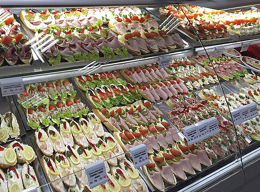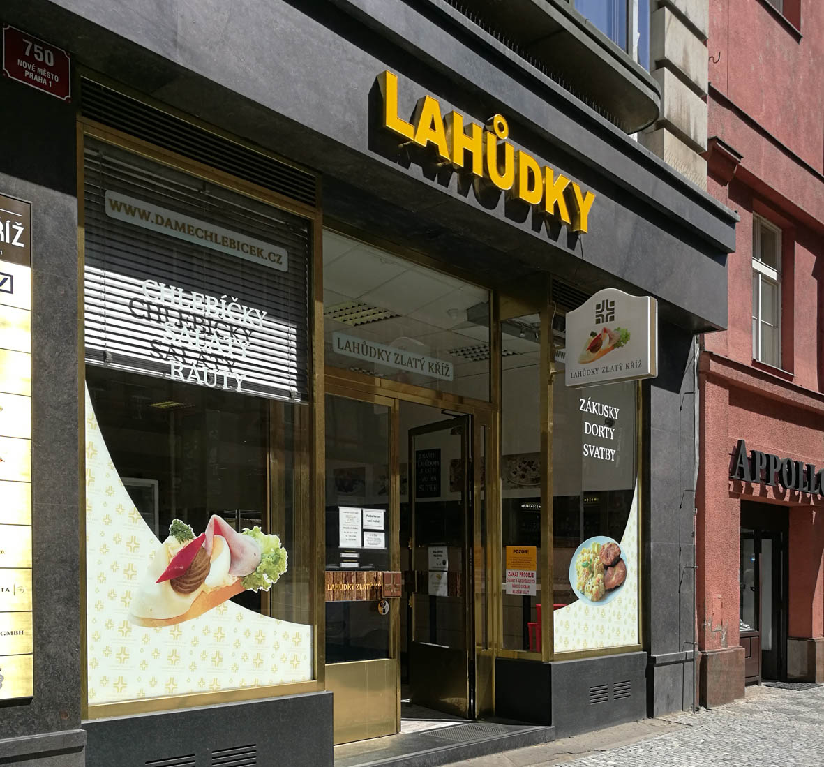 Zmenšila se také plocha, rozlehlá hala se dvěma prosklenými stěnami, kde při ostatních dvou a uprostřed stály pulty s jednotlivými druhy zboží, tu odnesl čas. Stolky na stojáka, spousta atraktivních položek jak v nápojích, tak především v lahůdkách, to však zůstalo. A fronty. Byly dřív a jsou i teď. Právem, možná se to tu tolik neblýská zlatými odlesky, jako v originální verzi, ale to nic nevadí. Vždyť zde nabízejí na padesát druhů chlebíčků ve dvou verzích, malé a větší. Krom těch „nesmrtelných“, se šunkou a salátem, jsou tu k mání třeba ovocný, s rostbeefem a já nevím jaké ještě. Také třicet druhů salátů, jinde už téměř neviděné aspiky a stále ještě vaječná tlačenka, sýrové či šunkové dorty…