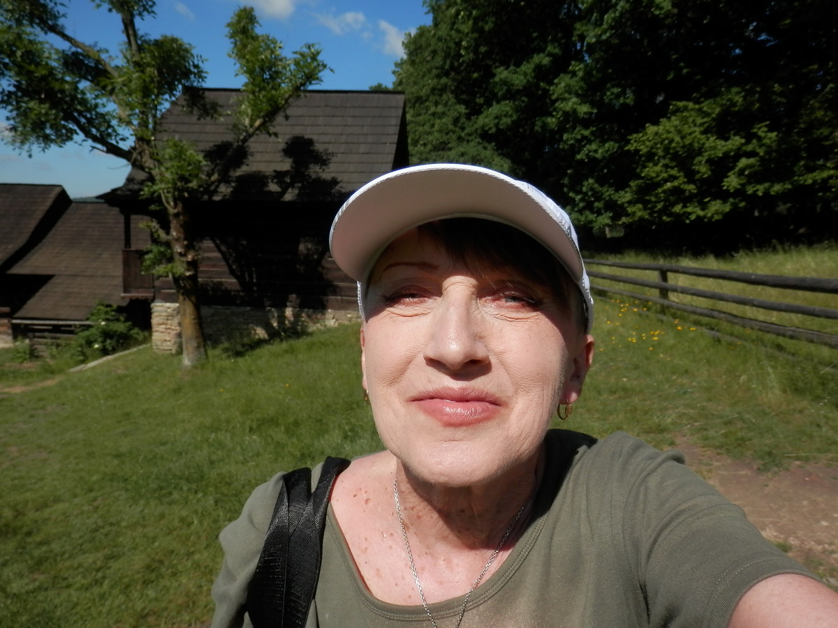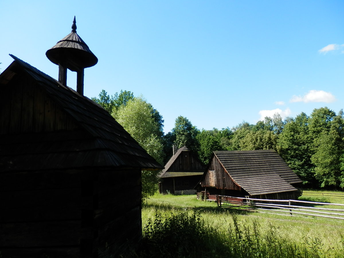 Rázovité roubené chalupy jsou rozesety hodně vysoko ve stráních. Je ale krásně, mám dobrou náladu a výstup mě vůbec nijak neunavuje. Dnes bych vyšplhala snad i na rozhlednu. Jsem asi jeden z prvních návštěvníků zde. Jdu si svým tempem, mhouřím oči ve slunci, pobrukuji si moravské lidové, které mě napadají, třeba Za tú horú za vysokú.... Obdivuji stavení, do některých mohu i nahlédnout, zdravím se s několika zdejšími lidmi, kteří tu ve skanzenu nejspíš hospodaří.