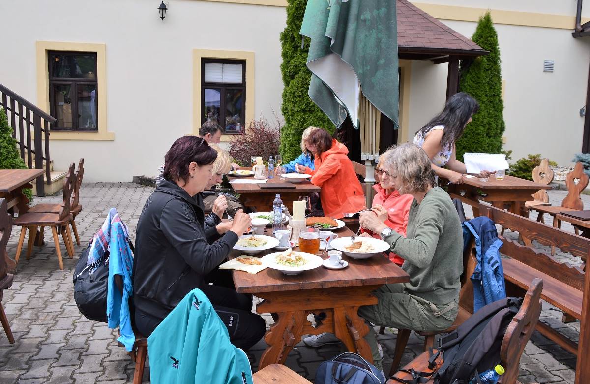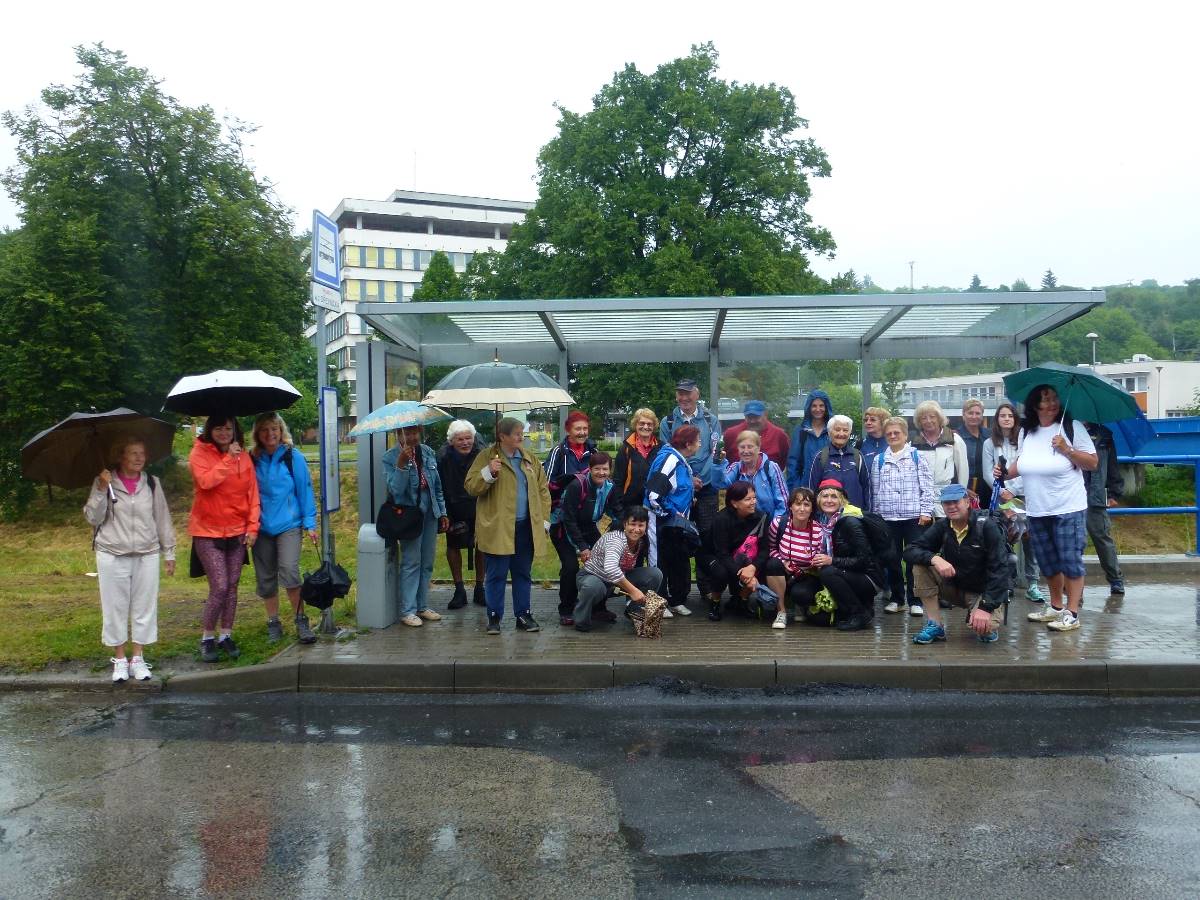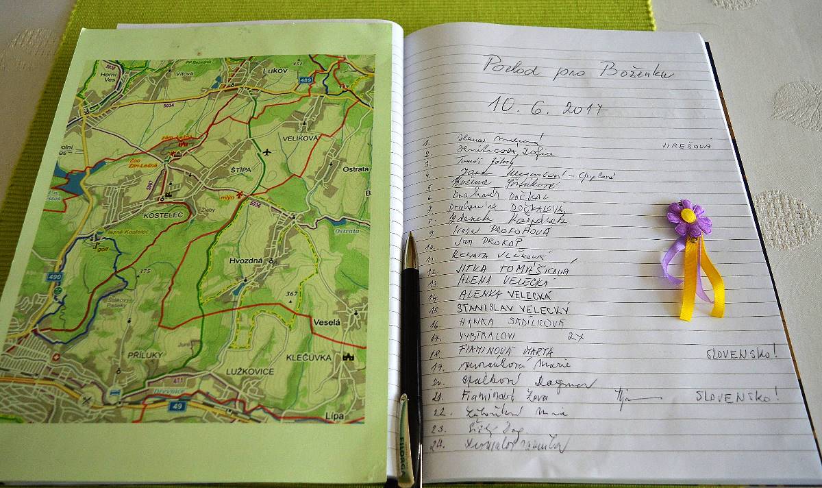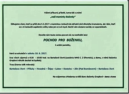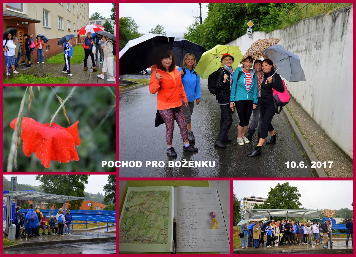 Když jsme byli zesardinkovaní na zastávce pod stříškou, do cvaknutí fotoaparátu zaburácel v tichu ospalého sídliště sborový pozdrav „…na Boženčin pochod – Z D A R!“ Byla odstartována  12ti kilometrová túra. Déšť opravdu nikoho neodradil. Všichni měli naši maminku moc rádi. Prošli jsme strmým kopcem přes Příluky na Štákovy paseky, pak zamířili s malými zastaveními a výhledy do Kostelce, kde v tamní restauraci, posíleni tu zelňačkou, tu bramborákem nebo dýňovým rizotem, rozcházeli se postupně domů.