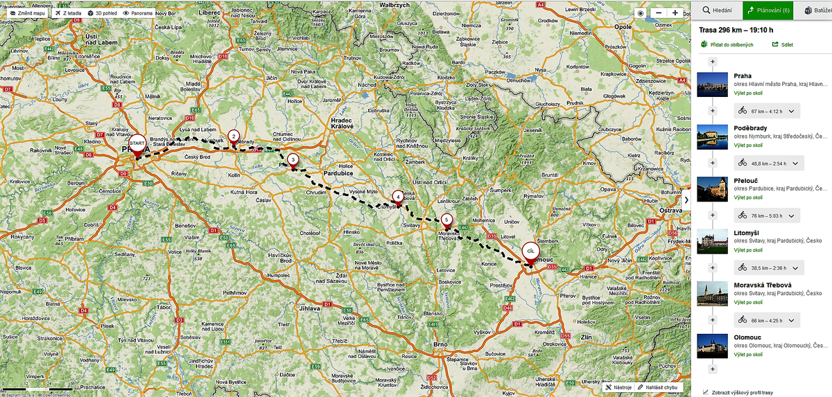 Celkem cyklisté podle plánovače Mapy.cz ujedou vzdálenost 296 km s převýšením cca 350 m. Oproti původnímu plánu jsme trasu o něco zkrátili, aby vzdálenosti mezi jednotlivými stanovišti (městy, kde cyklisté přenocují) byly kratší než 80 kilometrů. I tak bude trasa náročná, hned první den budou muset elektrocyklisté urazit vzdálenost kolem 70 kilometrů z Prahy do Poděbrad, největší porce kilometrů - celkem 76 km - čeká naše "vyslance" třetí den, a to z Přelouče do Litomyšle.