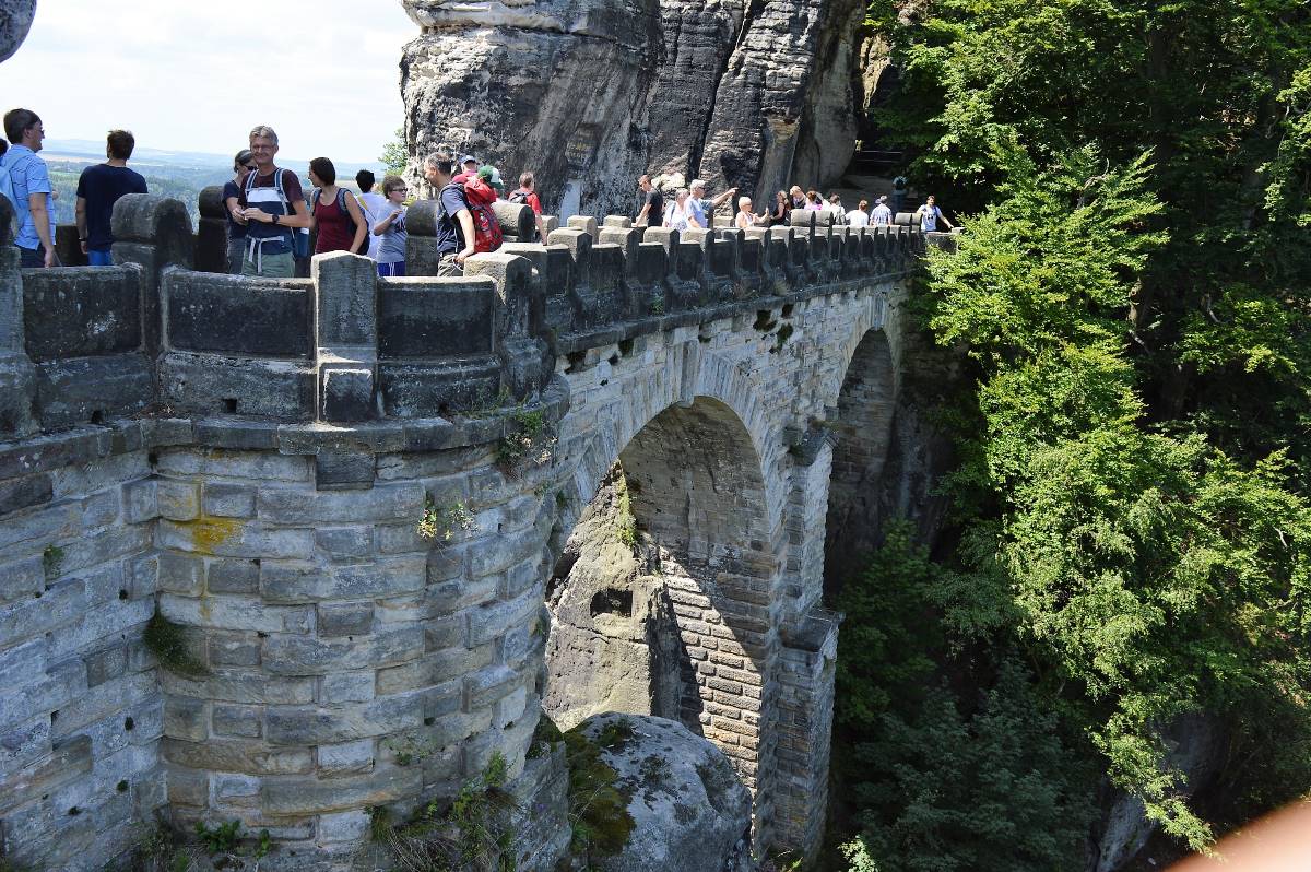 Stylový rozcestník nedaleko od výstupního mola přívozu nám s rozkošnou podbízivostí nabídl jednu z odpočinkových tras - trasu okolo Kosího jezera, jehož protáhlou hladinu sluneční paprsky prosvěcovaly až k bahnitému dnu, jak bylo mělké. U následujícího rozcestí jsme si to namířili k hospůdce u malého vodopádu a pokračovali zákoutími působivých pískovcových skal vzhůru do městečka Bastei. S překvapivým zjištěním, že nás pohltilo turistické středisko lemující asfaltku, jsme se protláčeli davy na skalní most. Ještě důrazněji jsme se prodírali tlačenicí na mostě, podobné té na našem Karlově mostě. Kontaminováni zklamáním z neuskutečněného katalogy avizovaného vizuálního zážitku jsme raději seběhli lesní cestičku a místy dlážděný chodník s téměř 600 schody opět k přívozu. Placený okruh s vyhlídkami na skalní scenérii jsme vzdali, neboť být součástí hutného lidského potoka proudícího v přísném směru úzkými pěšinami a kovovými mostky v úmorném vedru, nebylo by to pro nás šťastnou výhrou. Jednoduše, nechtělo se nám být součástí upocené kosmopolitní masy zvědavců.