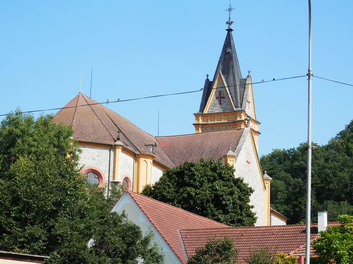 Novogotický kostel z let 1845 - 47, postavený Janem Adolfem, knížetem ze Schwarzenbergu, je na náměstí známého turistického centra. Od kostela k nejbližšímu rybníku je "coby kamenem dohodil". Myslím, že uhodnout je velmi snadné.