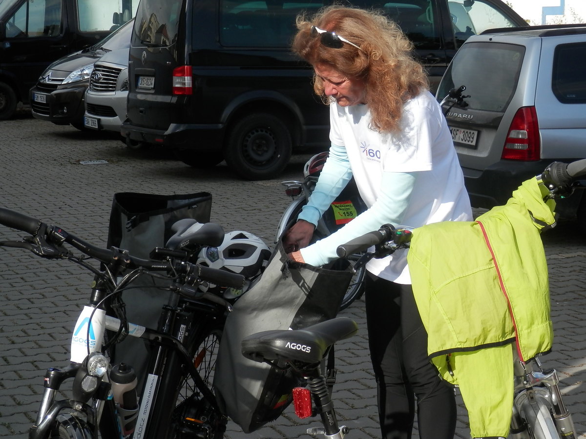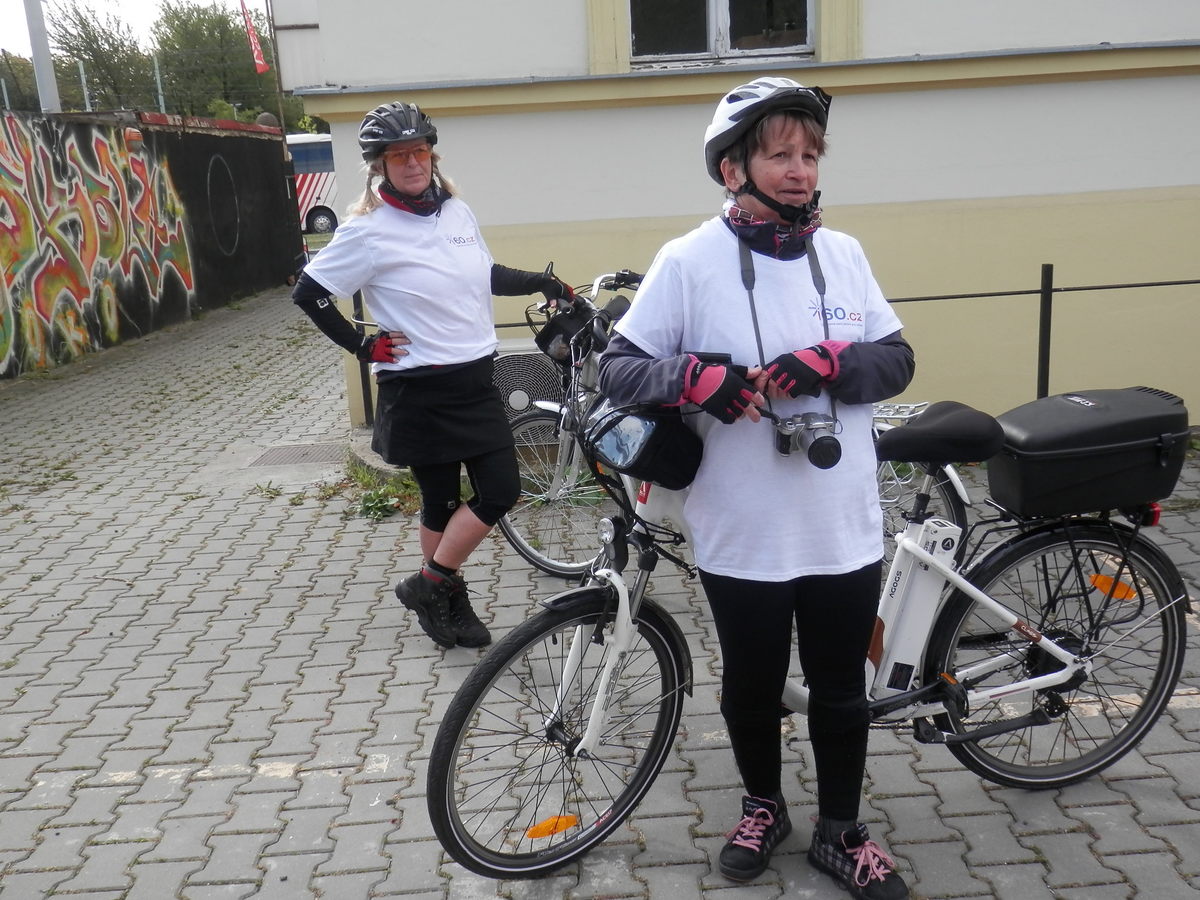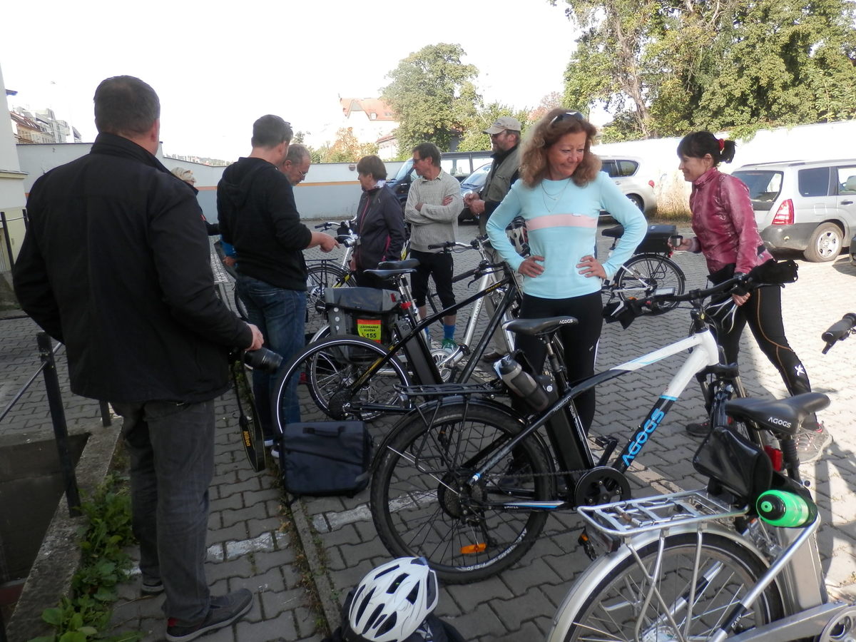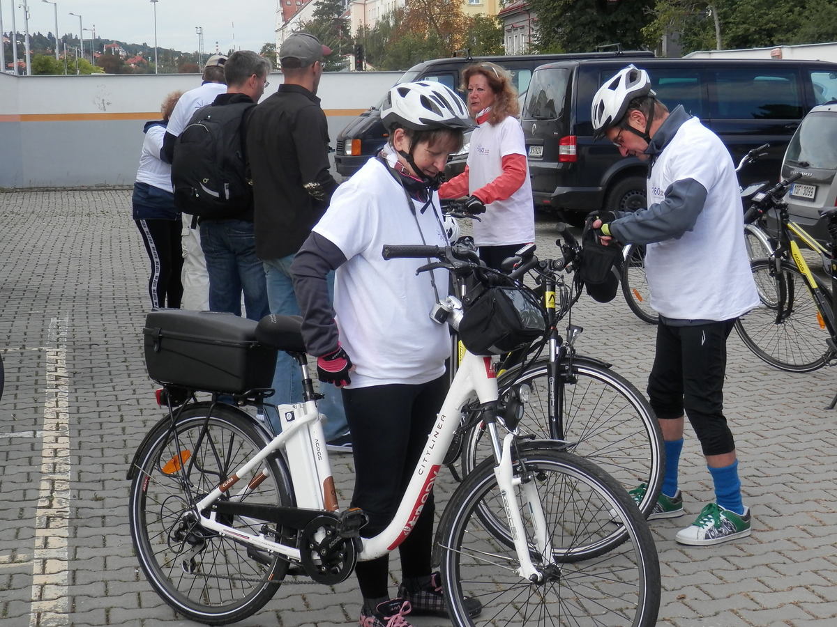 Když jsem těsně před půl desátou dorazila do půjčovny elektrokol, bylo na nádvoří vilky kousek od stanice Hradčanská směrem ke Spartě už pěkně rušno. Účastníci pelotonu se seznamovali se svými koly, pořadatelé dávali odborné pokyny a nakládali zavazadla do doprovodného vozidla. Pozdravila jsem se s Ilonou, kterou jsem kromě diskusí na portálu a hlavně cestovatelských článků znala od vidění už z loňské módní přehlídky ve Ville Pellé, osobně se představila s Oldou, ale samozřejmě se zajímala i o ostatní, které jsem dosud neznala jménem. Olda byl jmenován vedoucím celé skupiny, což vzal velmi zodpovědně a hned stanovil cíl "mezipřistání" během cesty, kde se všichni sejdou a zhodnotí dosavadní jízdu. Ilona, zvyklá na vysokohorské túry, odmítla dát svůj docela těžký baťoh do auta a dala si ho na záda. Druhá Ilona se svou superštíhlou postavou bez gramu tuku by nejraději jela jen v tričku. A rozesmála nás Maruška M. svým konstatováním, kterak se dala celkově pojistit......co kdybych třeba někomu přejela husy....!
