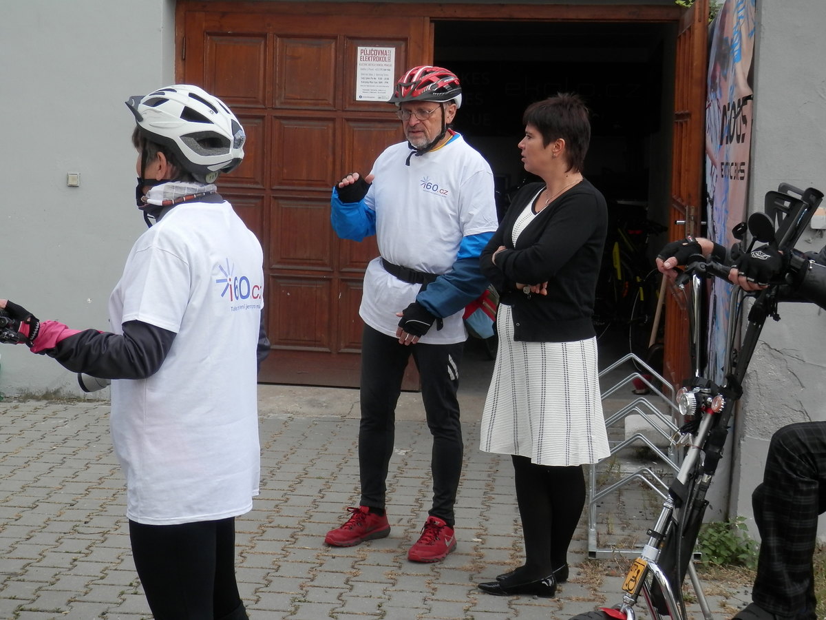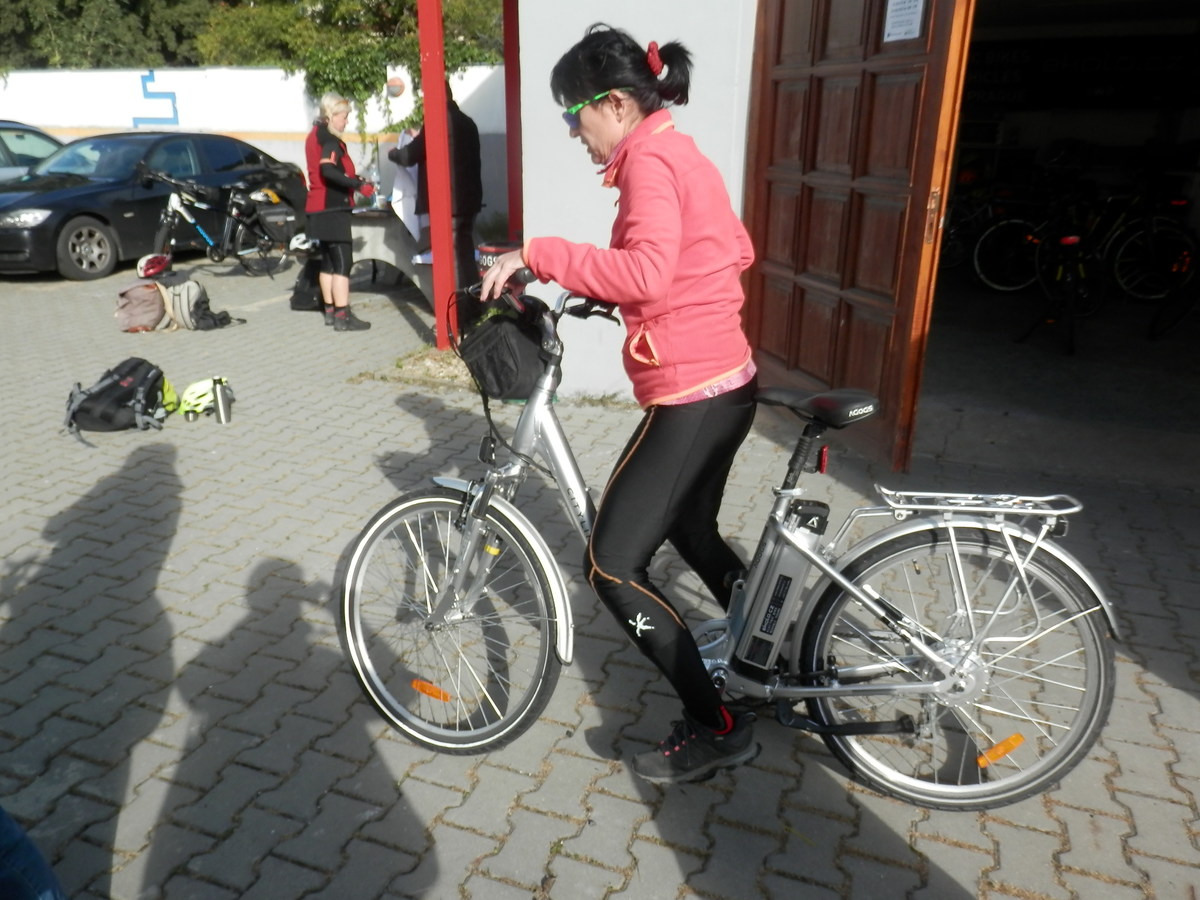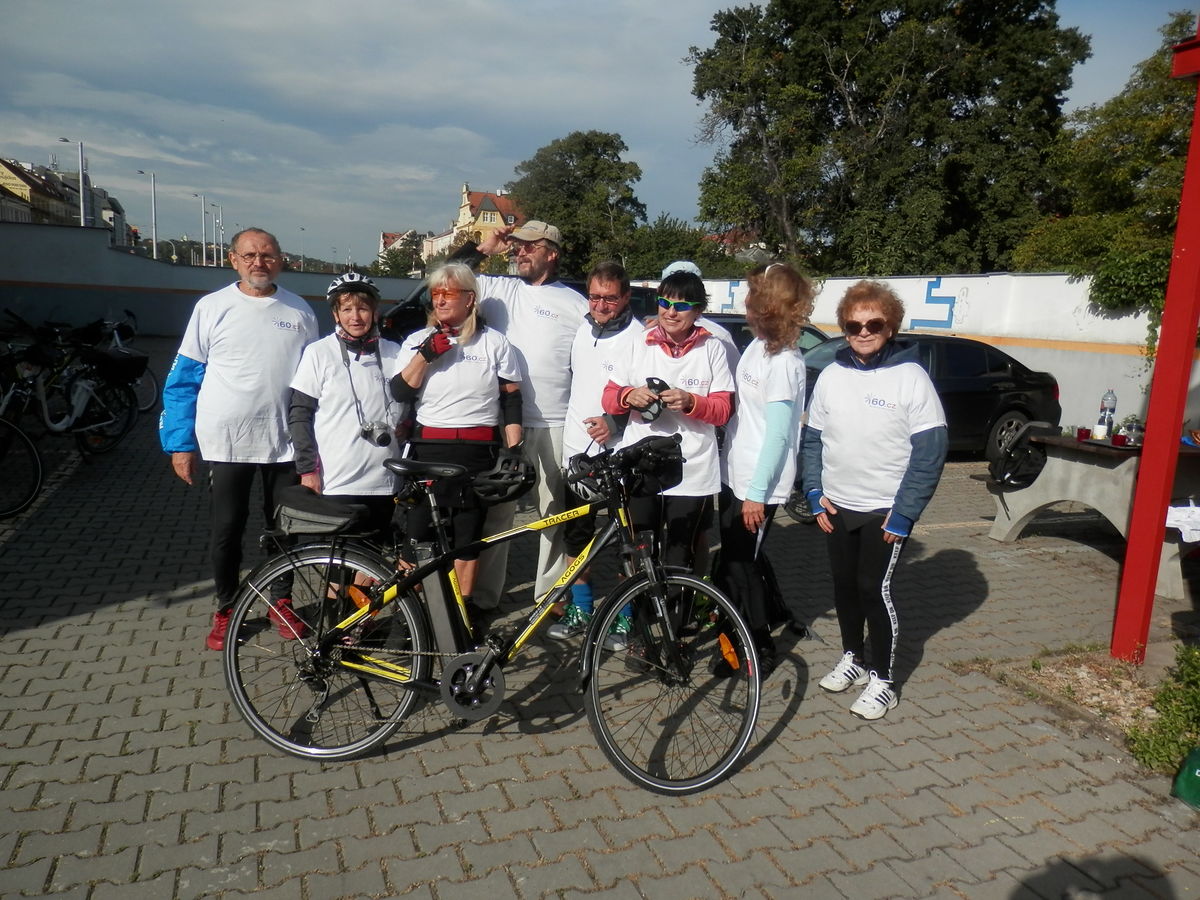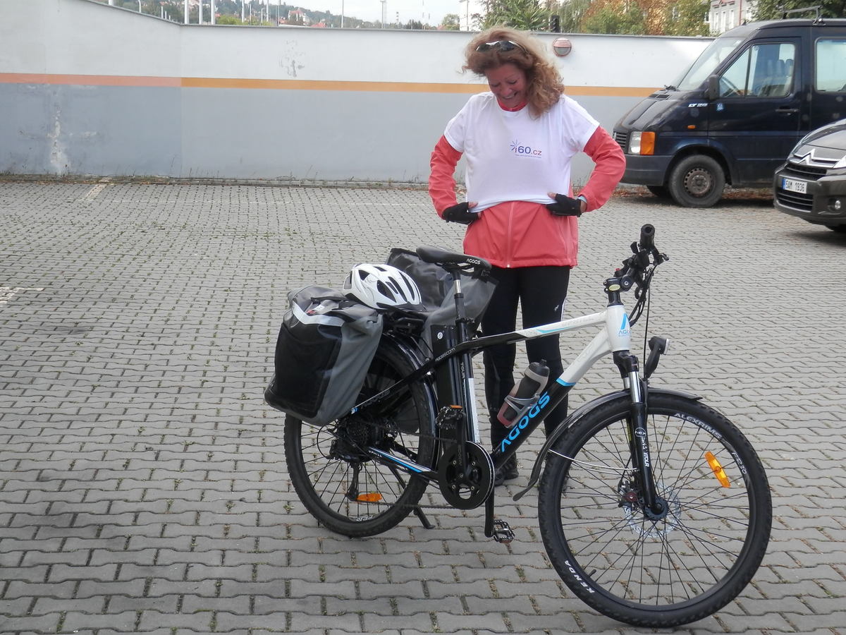 Když jsem těsně před půl desátou dorazila do půjčovny elektrokol, bylo na nádvoří vilky kousek od stanice Hradčanská směrem ke Spartě už pěkně rušno. Účastníci pelotonu se seznamovali se svými koly, pořadatelé dávali odborné pokyny a nakládali zavazadla do doprovodného vozidla. Pozdravila jsem se s Ilonou, kterou jsem kromě diskusí na portálu a hlavně cestovatelských článků znala od vidění už z loňské módní přehlídky ve Ville Pellé, osobně se představila s Oldou, ale samozřejmě se zajímala i o ostatní, které jsem dosud neznala jménem. Olda byl jmenován vedoucím celé skupiny, což vzal velmi zodpovědně a hned stanovil cíl "mezipřistání" během cesty, kde se všichni sejdou a zhodnotí dosavadní jízdu. Ilona, zvyklá na vysokohorské túry, odmítla dát svůj docela těžký baťoh do auta a dala si ho na záda. Druhá Ilona se svou superštíhlou postavou bez gramu tuku by nejraději jela jen v tričku. A rozesmála nás Maruška M. svým konstatováním, kterak se dala celkově pojistit......co kdybych třeba někomu přejela husy....!