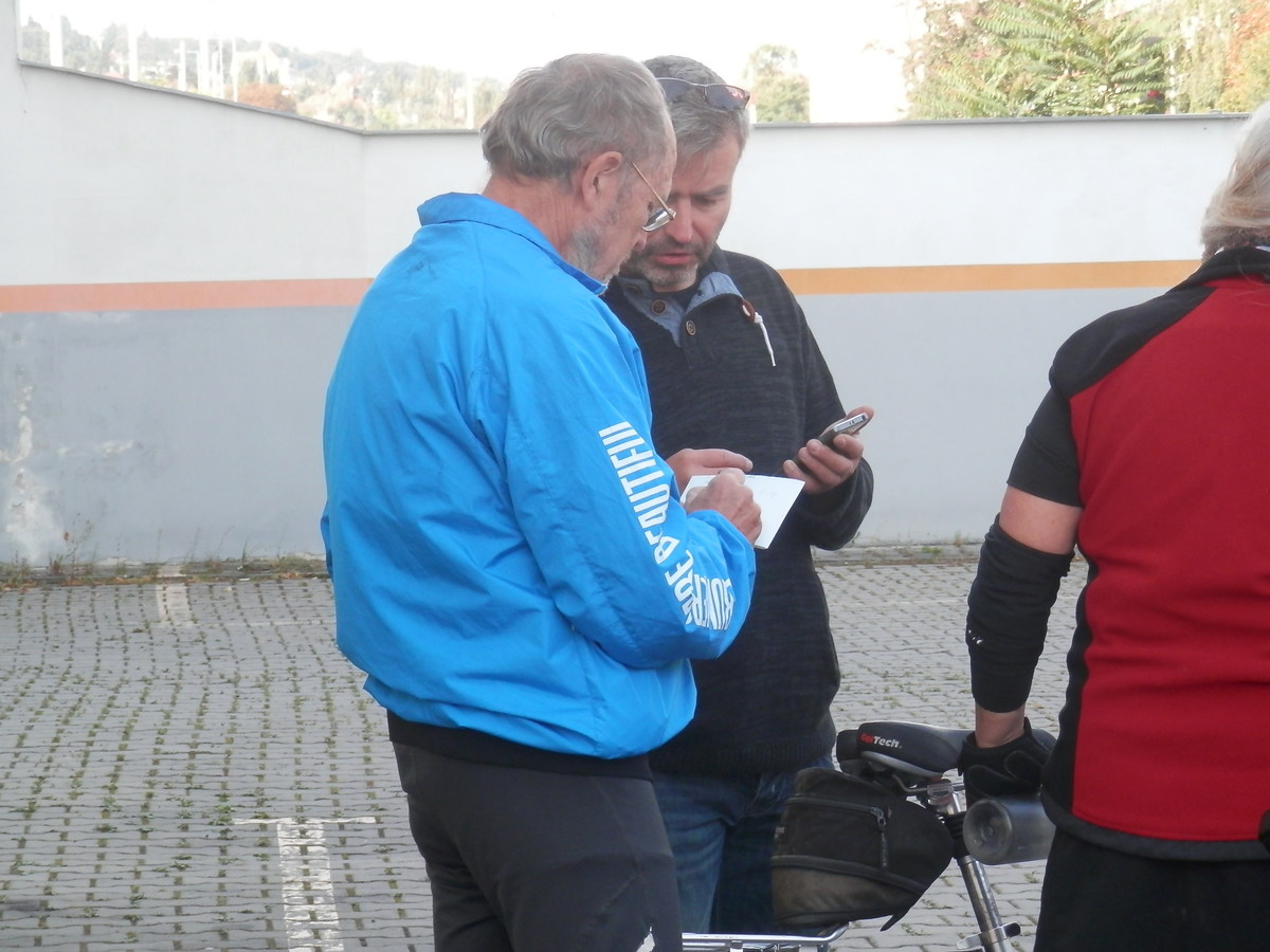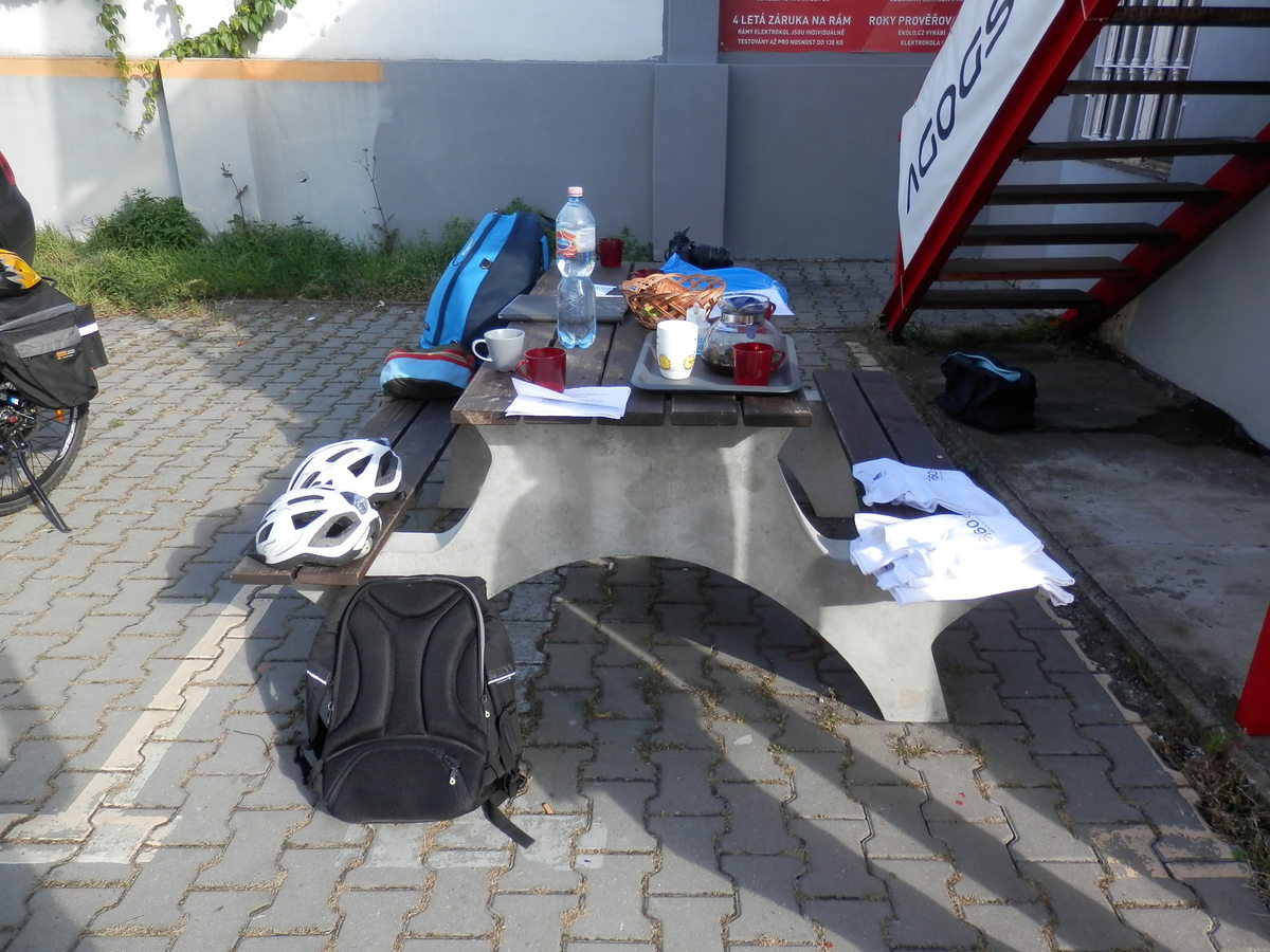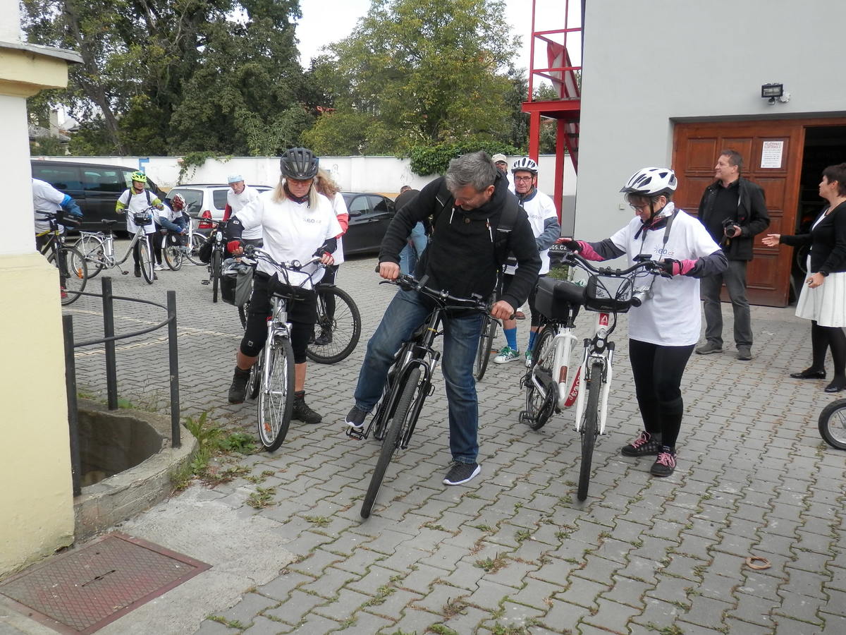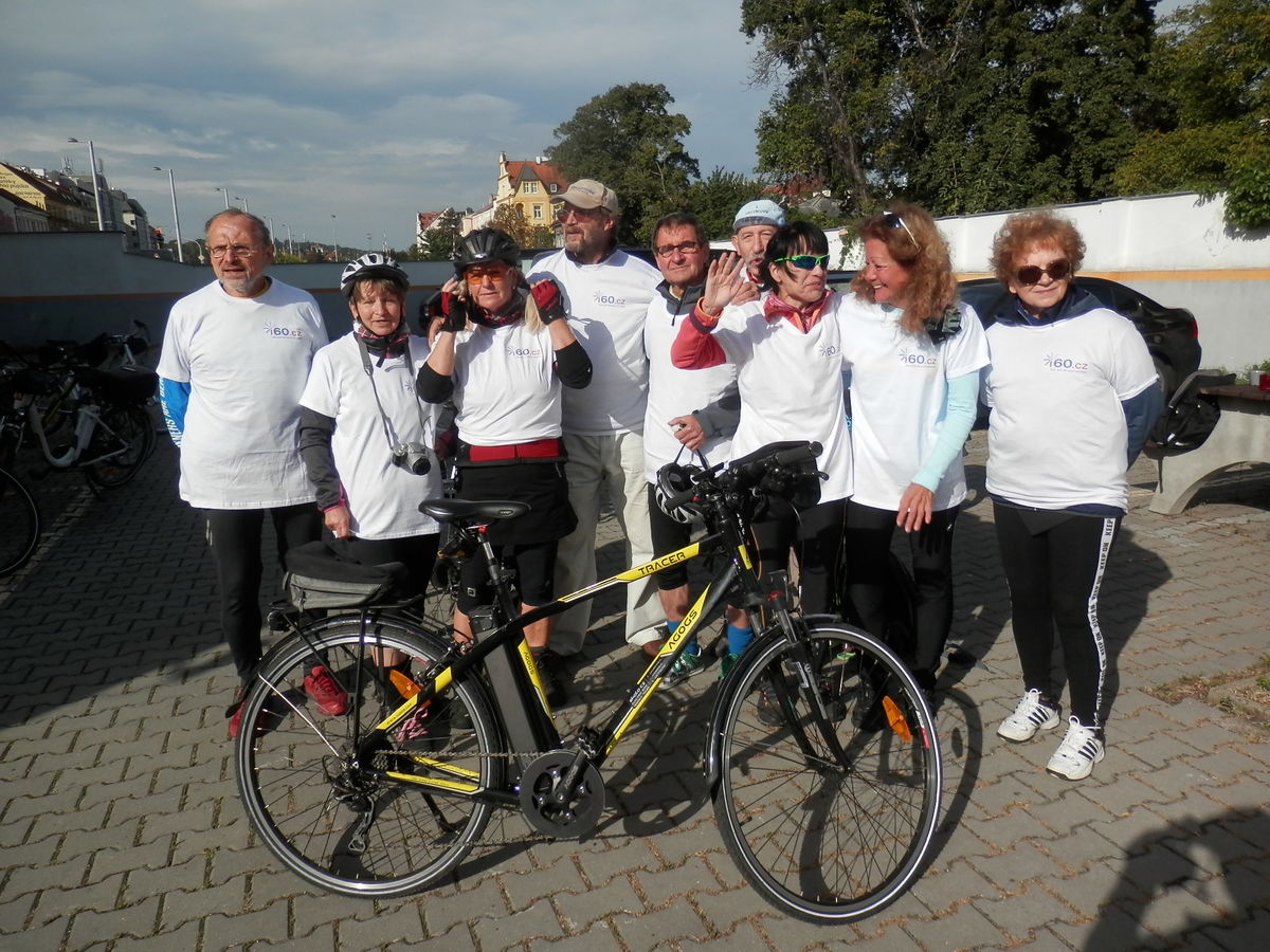 Když jsem těsně před půl desátou dorazila do půjčovny elektrokol, bylo na nádvoří vilky kousek od stanice Hradčanská směrem ke Spartě už pěkně rušno. Účastníci pelotonu se seznamovali se svými koly, pořadatelé dávali odborné pokyny a nakládali zavazadla do doprovodného vozidla. Pozdravila jsem se s Ilonou, kterou jsem kromě diskusí na portálu a hlavně cestovatelských článků znala od vidění už z loňské módní přehlídky ve Ville Pellé, osobně se představila s Oldou, ale samozřejmě se zajímala i o ostatní, které jsem dosud neznala jménem. Olda byl jmenován vedoucím celé skupiny, což vzal velmi zodpovědně a hned stanovil cíl "mezipřistání" během cesty, kde se všichni sejdou a zhodnotí dosavadní jízdu. Ilona, zvyklá na vysokohorské túry, odmítla dát svůj docela těžký baťoh do auta a dala si ho na záda. Druhá Ilona se svou superštíhlou postavou bez gramu tuku by nejraději jela jen v tričku. A rozesmála nás Maruška M. svým konstatováním, kterak se dala celkově pojistit......co kdybych třeba někomu přejela husy....!