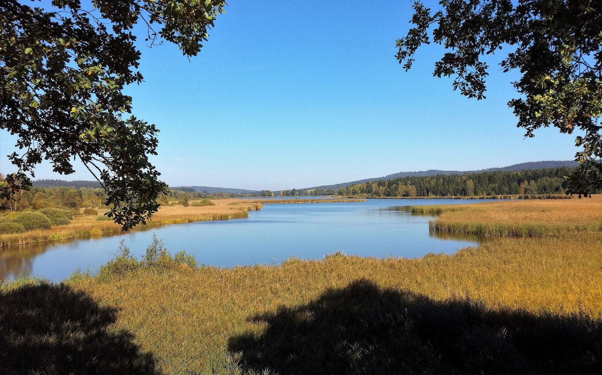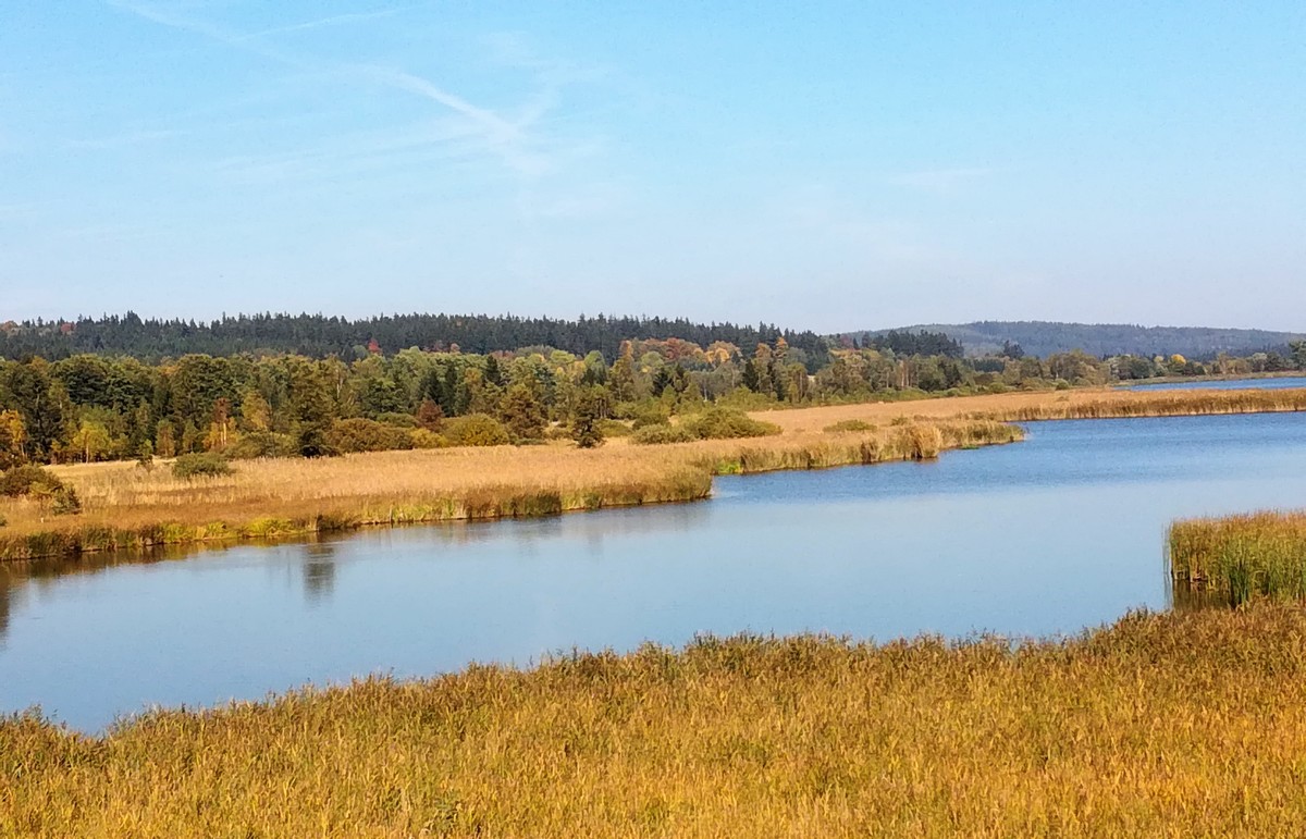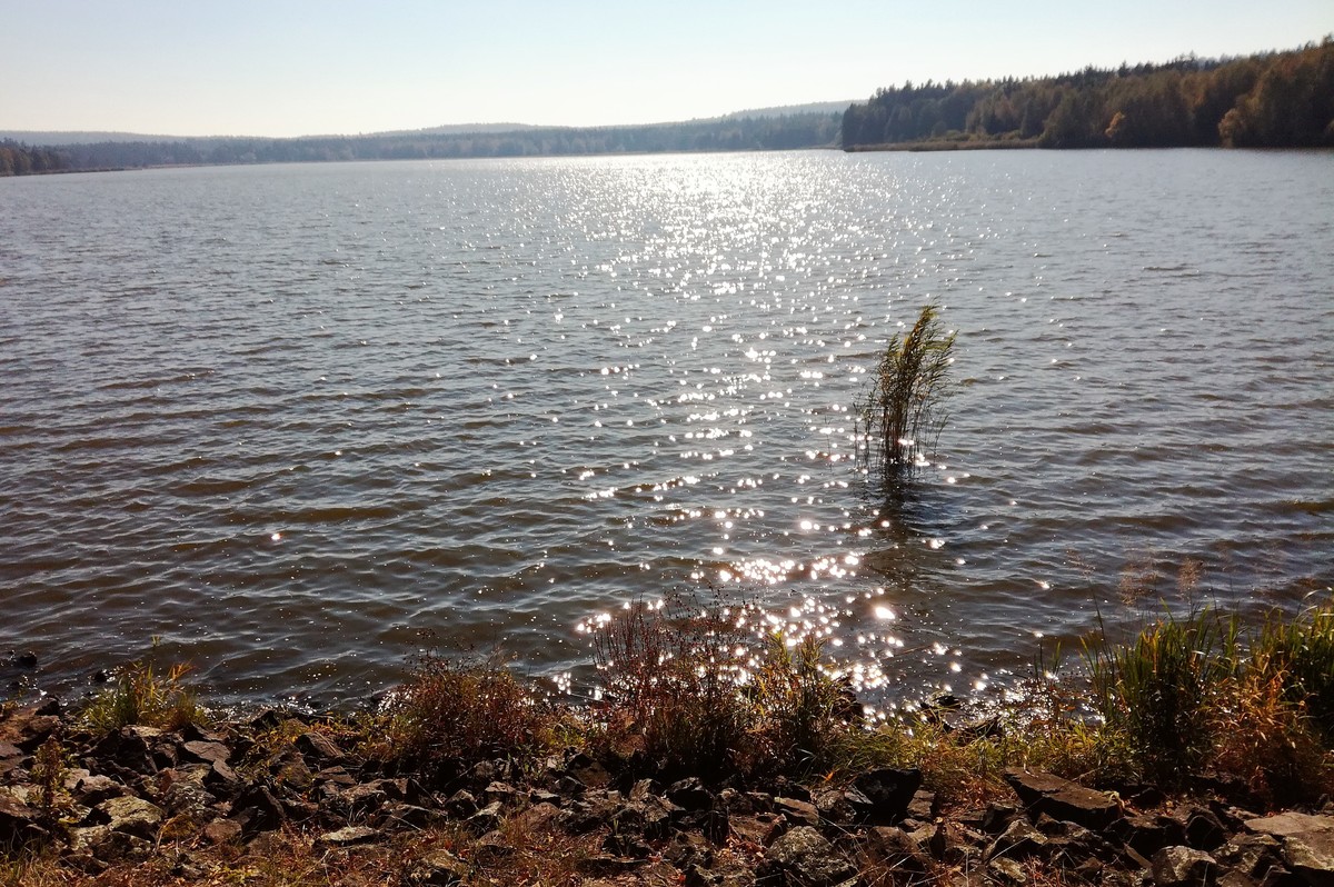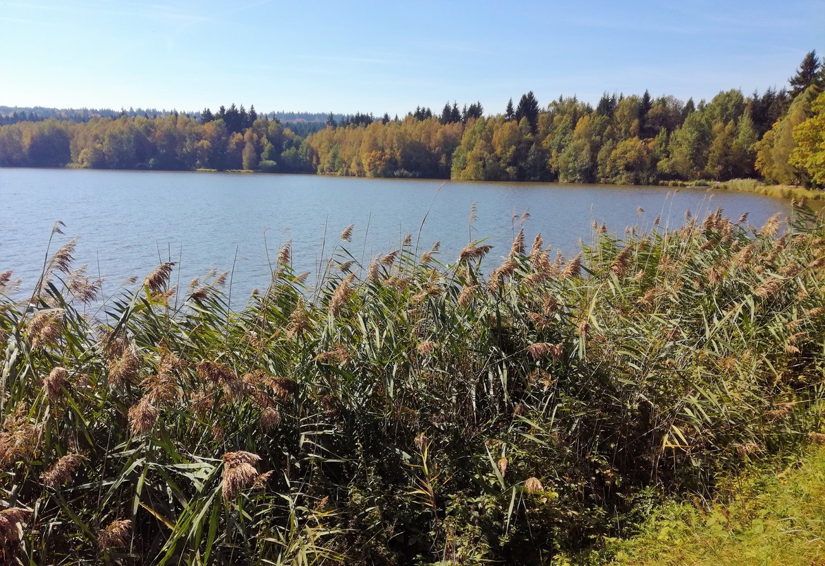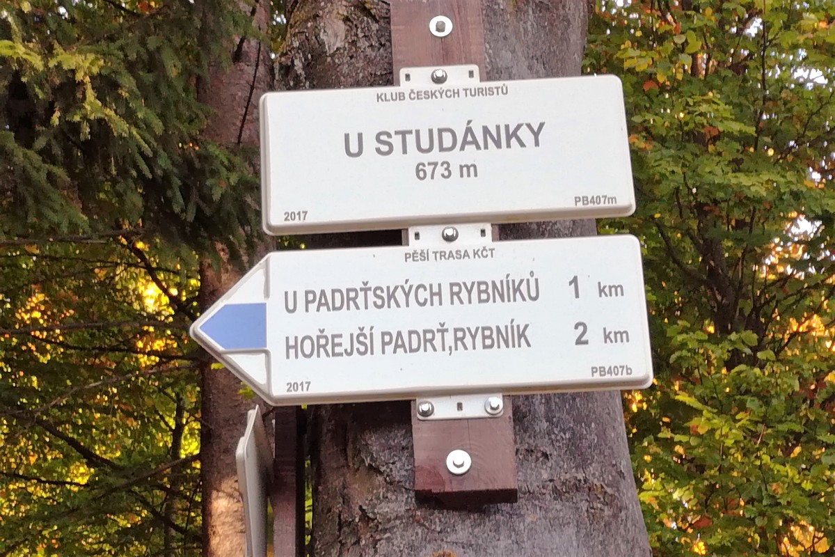 Po dvou kilometrech přicházíme na rozcestí Břízkovec, kde se na chvíli usazujeme na lavičkách pod přístřeškem, dále pak klesáme z prudkého kopce po červené až k Padrťským rybníkům. Je to moc pěkné místo. Hořejší a Dolejší rybník od sebe odděluje hráz, oba lemuje rákosí, které podzim vybarvil do žluta. Je poledne, slunce se odráží od hladiny a vyzývá k posezení v trávě.