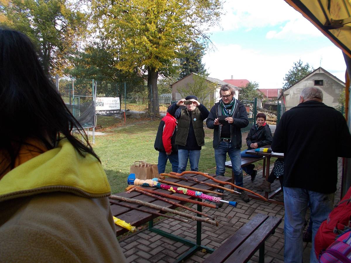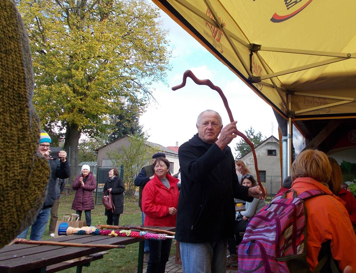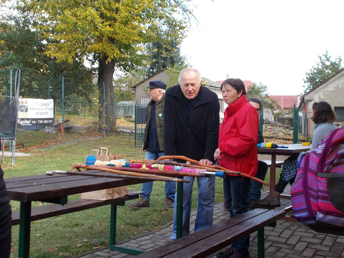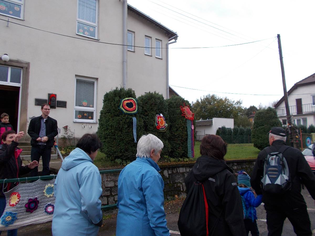 Letos jsou s námi i ženy ze skupiny "Motanice“. Ozdobily nám okolí školy svými výrobky .Ve městě Havlíčkově Brodě svými výrobky ozdobily cestu s názvem "Pletená stezka B. D. J.Reykových a Jana Zrzavého“. Chtějí tím připomenout tyto osobnosti. Asi v polovině špacíru na nás čekalo překvapení v podobě ohýnku s pečenými brambory - jako kdysi. Měli jsme štěstí, zrovna svítí slunko. Občerstvení v podobě pečených brambor a už putujeme dál, do vedlejší vesnice, kde na nás čekají pravé domácí bramboráčky a krátké počteníčko ze zápisků Jana Zrzavého v malé hospůdce. Počasí bylo jak načasované, právě prší, přímo leje. Schovat se a posvačit. Ano, tak to má být - přestává a my můžeme pokračovat na zpáteční cestu. Ještě přejdeme mostek přes Sázavu - právě tu, kde se každoročně pořádají "Neckyády“, a již nás vítá u sokolovny připravený stan s obědovým gulášem a pozdějí opečená kýta. K poslechu hrají Harmonikáři.