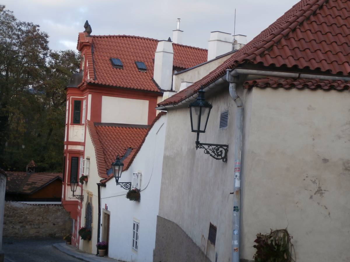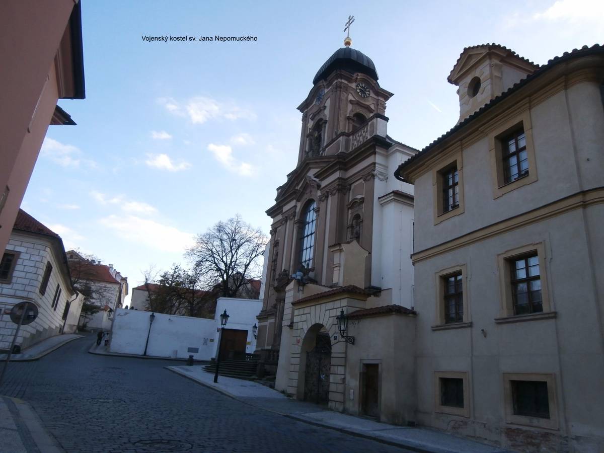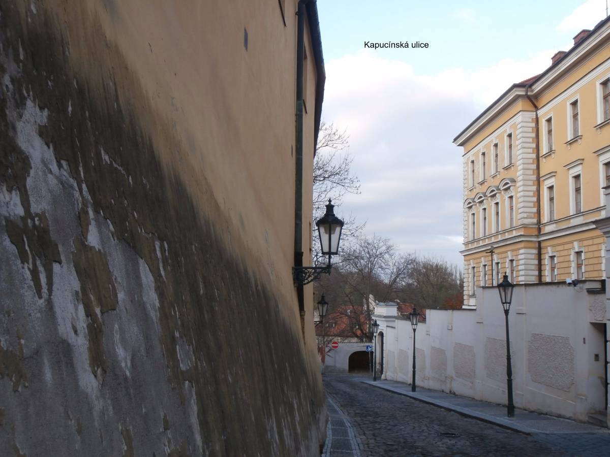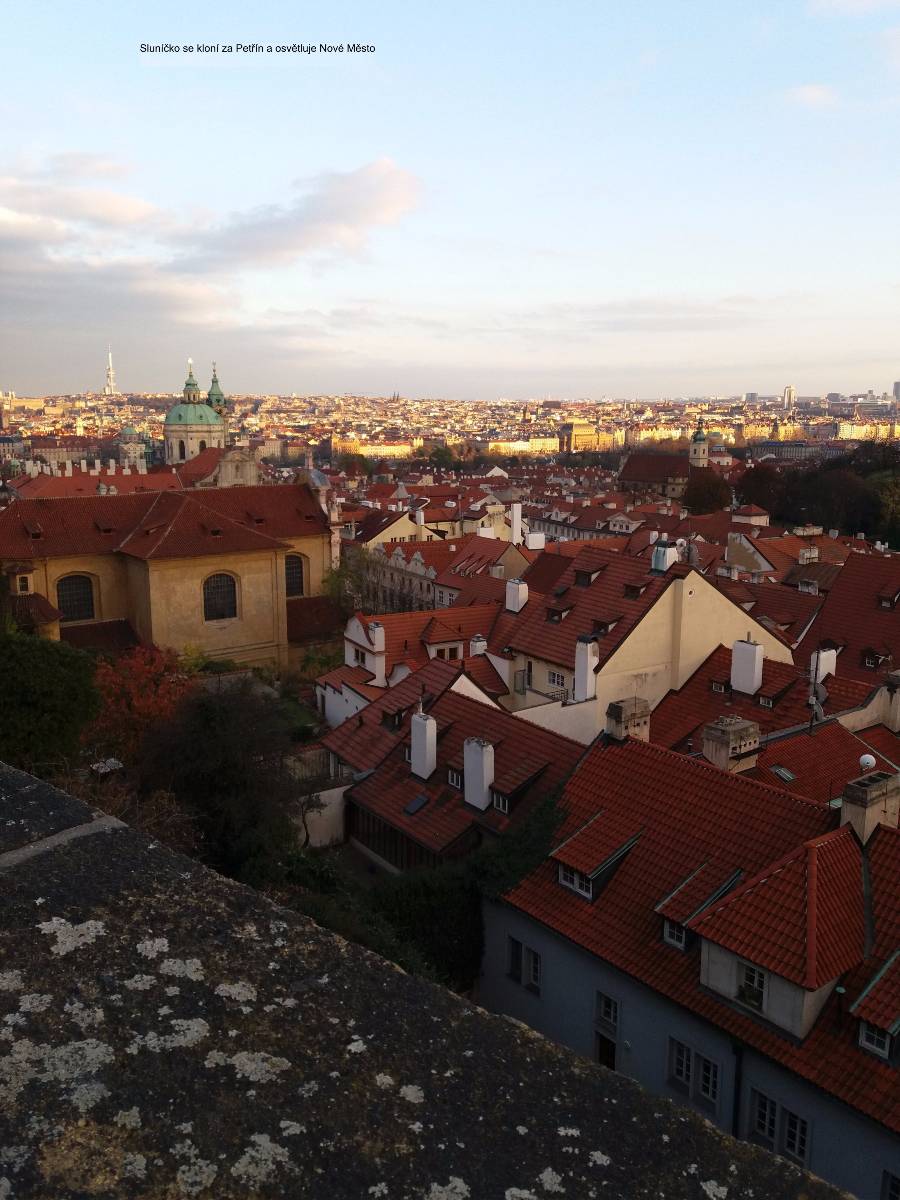 Nechám se tramvají vyvést na Pohořelec a jdu směrem k Pražskému hradu. Ne přímo. Na Loretánském náměstí projdu kolem Černínského paláce a Lorety, doslova se vnořím do Kapucínské ulice a začínám vychutnávat malebnost uliček, střech a komínů. Kapucínskou ulicí dojdu na Nový svět, kolem letní scény divadla Ungelt a restaurace U zlaté hrušky do Kanovnické ulice. Přes plot mrknu na Chrám sv. Víta, a na křižovatce ulic Kanovnické a U kasáren se zastavím u kostela sv. Jana Nepomuckého. Těžké dveře jsou zavřené. Otvírají se málokdy. Kostel byl součástí kláštera voršilek a je první sakrální stavbou Kiliána Ignáce Dientzenhofera. Po zrušení kláštera (1784 – Josef II.) sloužil jako vojenský sklad soli a po sto letech se z něj stává vojenský kostel. V současné době je využíván pro vojenské svatby, křty, pohřby, oslavné akce typu Den veteránů a i pro koncerty – nejbližší bude 15. listopadu, a to violoncellový koncert Dua Brikcius. Civilní veřejnost má možnost nahlédnout do interiéru při pravidelných čtvrtečních bohoslužbách. Po tomto krátkém zastavení minu vyznání lásky na oprýskané zdi a už se přede mnou otevírá Hradčanské náměstí. Pohledem vpravo zkontroluji Petřínskou rozhlednu, projdu kolem staronových autíček pro turisty a už se těším na výhled, který snad nikdy neomrzí. Koukám přes střechy, komíny, okna a okýnka Malé Strany na Nové Město. Když se dost vynadívám, pomalu sestupuji ulicí Ke Hradu, juknu na Radnické schody, otočím se na sluneční hodiny – jedny z nejstarších v Praze (1567), jsou na jižní straně komína Schwarzenberského paláce. Jánským vrškem, kolem muzea alchymie, kde snad prováděl pokusy i magistr Kelly, a úzké Břetislavovy uličky seběhnu do ulice Vlašské. Ta mě zavede na Tržiště, kam už doléhá hluk tramvají a aut z Karmelitské ulice. Pokud bych ji přešla, mohla bych se zatoulat dál přes Velkopřevorské náměstí až na Kampu. Dnes ale už ne. Pomalu se stmívá, a tak se nechám odvézt do centra velkoměsta……