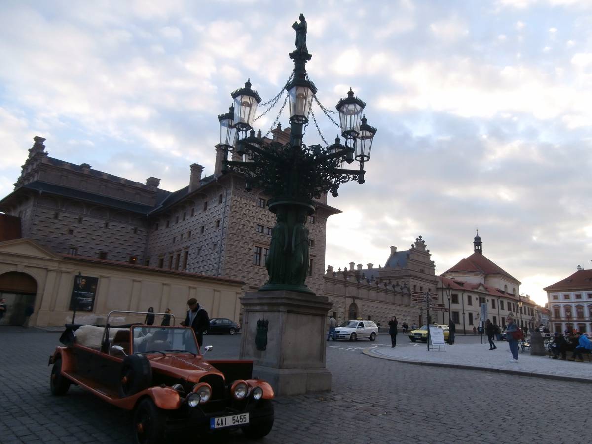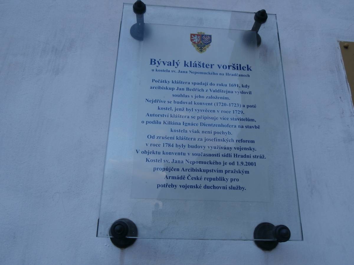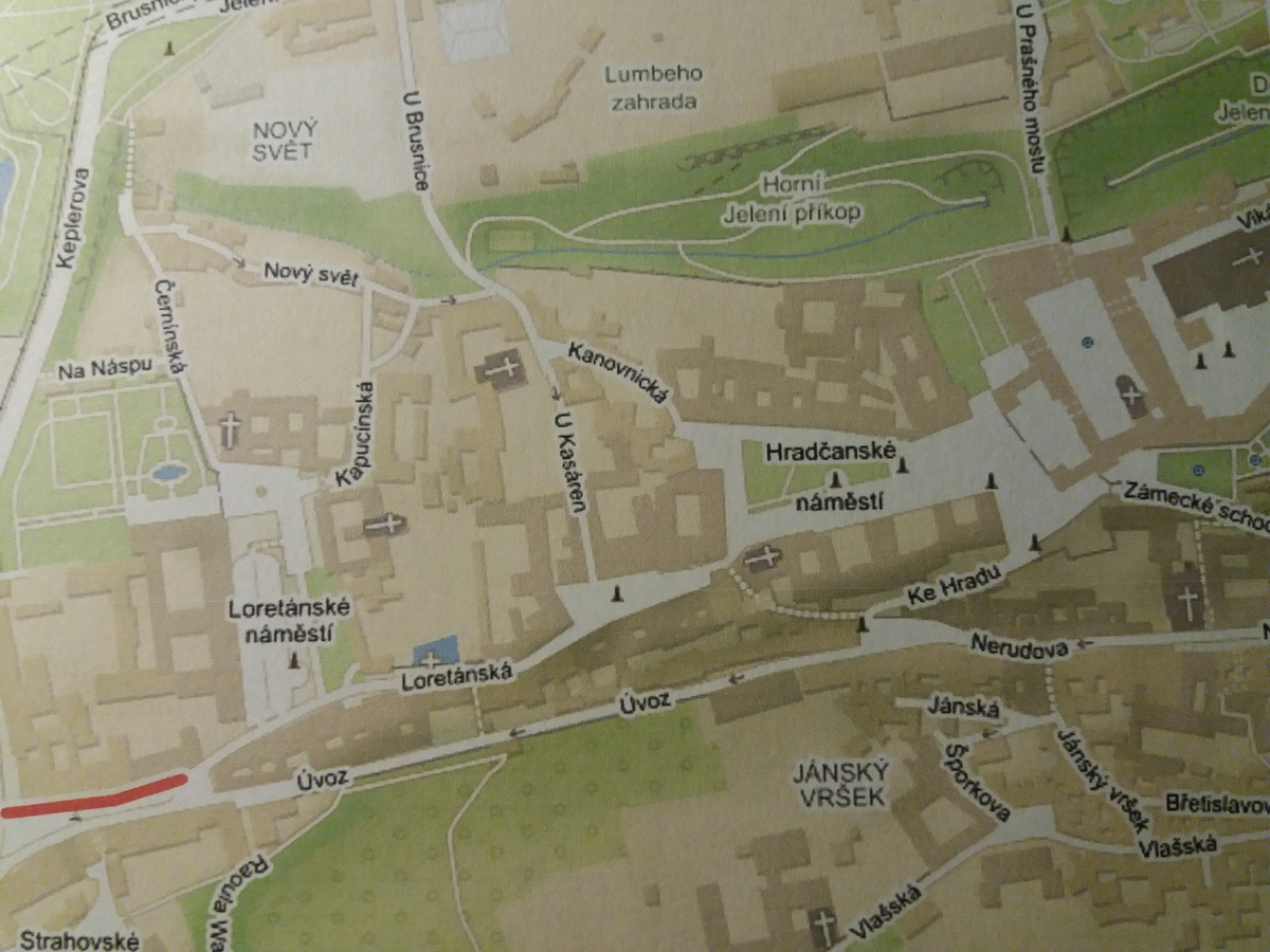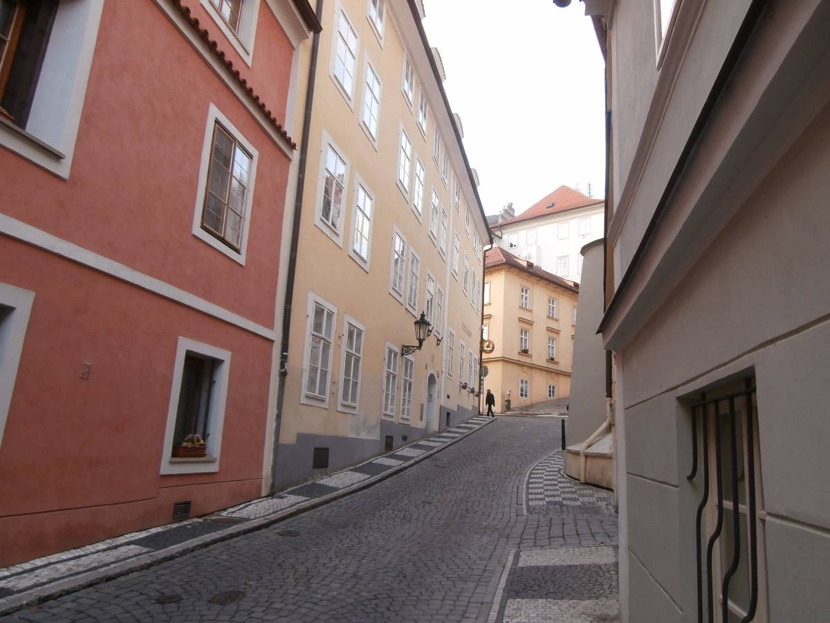 Nechám se tramvají vyvést na Pohořelec a jdu směrem k Pražskému hradu. Ne přímo. Na Loretánském náměstí projdu kolem Černínského paláce a Lorety, doslova se vnořím do Kapucínské ulice a začínám vychutnávat malebnost uliček, střech a komínů. Kapucínskou ulicí dojdu na Nový svět, kolem letní scény divadla Ungelt a restaurace U zlaté hrušky do Kanovnické ulice. Přes plot mrknu na Chrám sv. Víta, a na křižovatce ulic Kanovnické a U kasáren se zastavím u kostela sv. Jana Nepomuckého. Těžké dveře jsou zavřené. Otvírají se málokdy. Kostel byl součástí kláštera voršilek a je první sakrální stavbou Kiliána Ignáce Dientzenhofera. Po zrušení kláštera (1784 – Josef II.) sloužil jako vojenský sklad soli a po sto letech se z něj stává vojenský kostel. V současné době je využíván pro vojenské svatby, křty, pohřby, oslavné akce typu Den veteránů a i pro koncerty – nejbližší bude 15. listopadu, a to violoncellový koncert Dua Brikcius. Civilní veřejnost má možnost nahlédnout do interiéru při pravidelných čtvrtečních bohoslužbách. Po tomto krátkém zastavení minu vyznání lásky na oprýskané zdi a už se přede mnou otevírá Hradčanské náměstí. Pohledem vpravo zkontroluji Petřínskou rozhlednu, projdu kolem staronových autíček pro turisty a už se těším na výhled, který snad nikdy neomrzí. Koukám přes střechy, komíny, okna a okýnka Malé Strany na Nové Město. Když se dost vynadívám, pomalu sestupuji ulicí Ke Hradu, juknu na Radnické schody, otočím se na sluneční hodiny – jedny z nejstarších v Praze (1567), jsou na jižní straně komína Schwarzenberského paláce. Jánským vrškem, kolem muzea alchymie, kde snad prováděl pokusy i magistr Kelly, a úzké Břetislavovy uličky seběhnu do ulice Vlašské. Ta mě zavede na Tržiště, kam už doléhá hluk tramvají a aut z Karmelitské ulice. Pokud bych ji přešla, mohla bych se zatoulat dál přes Velkopřevorské náměstí až na Kampu. Dnes ale už ne. Pomalu se stmívá, a tak se nechám odvézt do centra velkoměsta……
