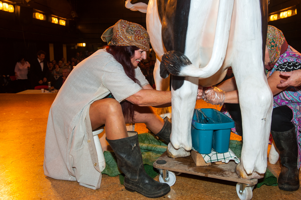 Třetí disciplína byla tajná pro všechny soutěžící a ta byla po přestávce. Asi jsme byly všechny překvapené, co si to na nás organizátoři Senzababči připravili. Na jeviště dovezli v původní životní velikosti maketu krávy. Našim úkolem bylo, vždy dvě soutěžící proti sobě se do 2 minut obout do gumáků, obléct si šatovou zástěru, zavázat šátek na hlavu, nasadit igelitové rukavice,přisunout stoličku a začít dojit,bez ohledu na to, která bude držet dřív hrotek a dojit, či nikoli.