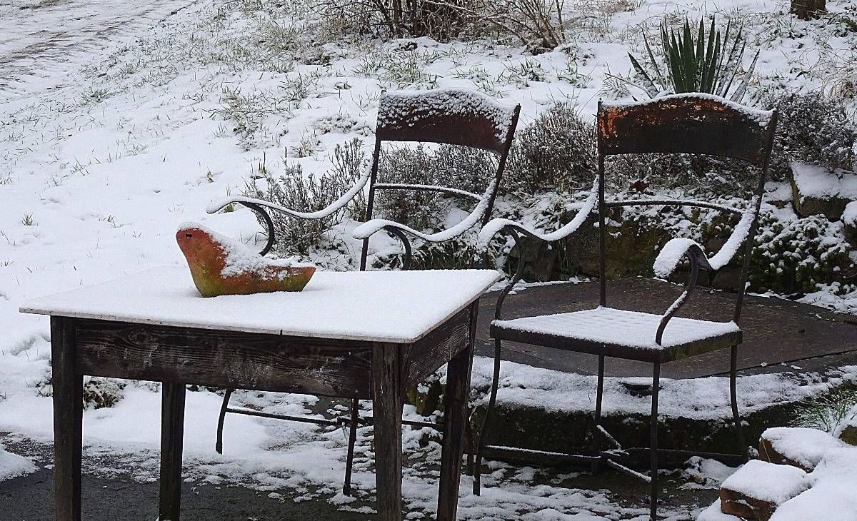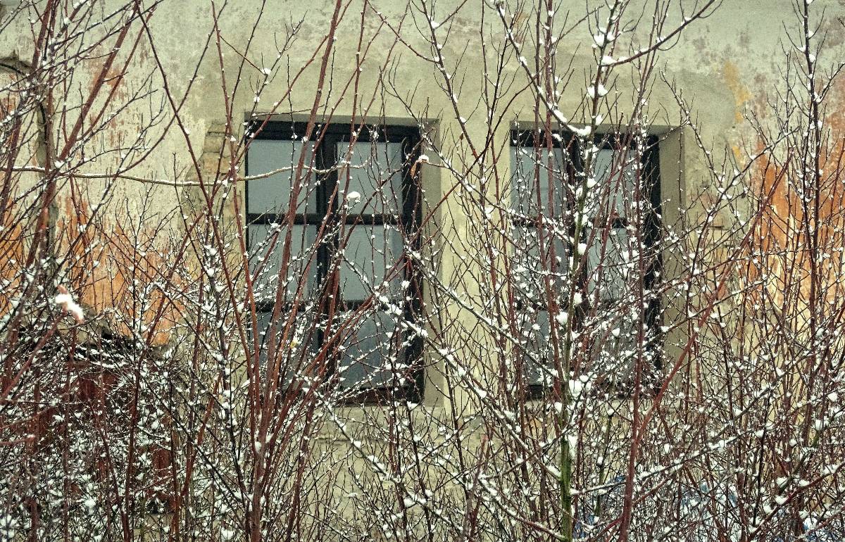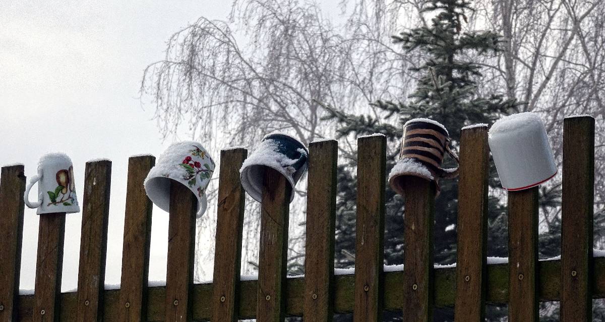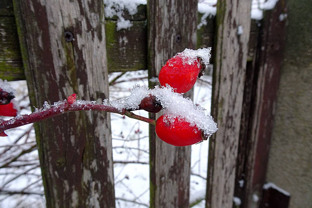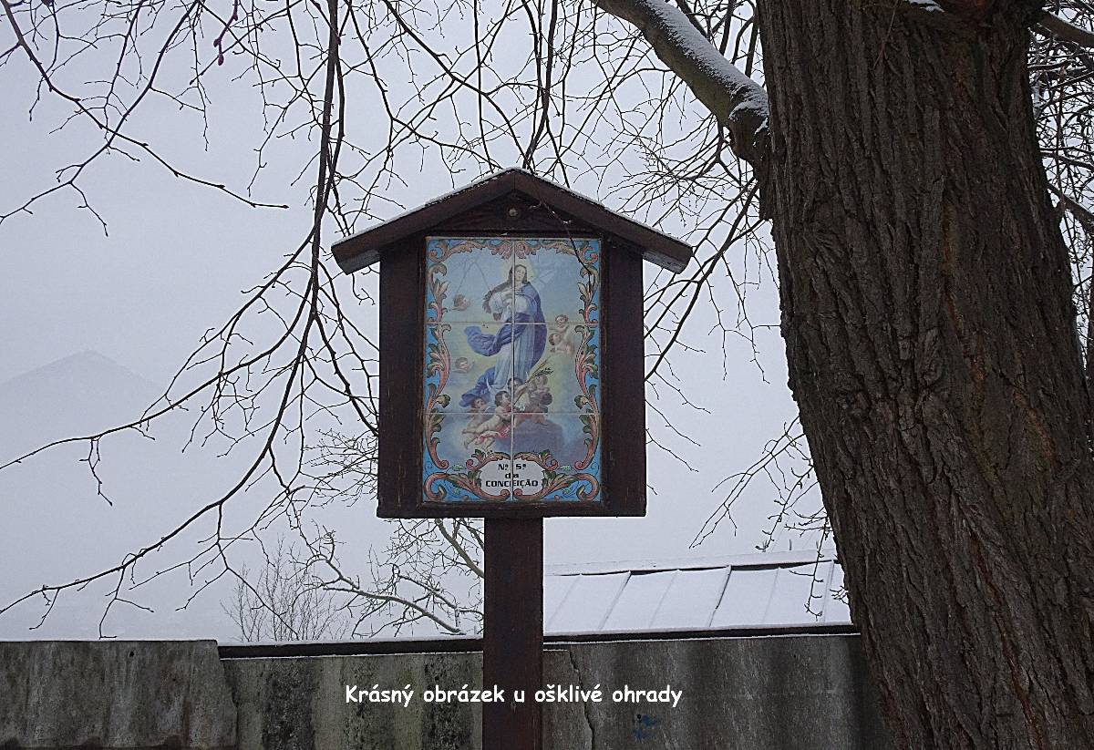 Naše cesta začíná na nádraží v Lovosicích. Po několika minutkách vystupujeme z autobusu v Režném Újezdu, tj. nejpříhodnějším startovním místě pro vycházku na Boreč. Zemi tu pokrývá max. 5 cm mokrého sněhu a viditelnost je téměř nula nula nic. Ale protože my dvě si říkáme bláznivé babky, radujeme se, jak jinak než jako bláznivé babky a vydáváme se na pochod. Ponejprv jsme ovšem odbočily k osadě s poetickým názvem Struženka. Čítá 4 obydlí, jednoho roztomilého pejska a bílého kohouta s harémem. Tady i v okolí se snažím ulovit záběry alespoň lehce zasněžené krajiny.