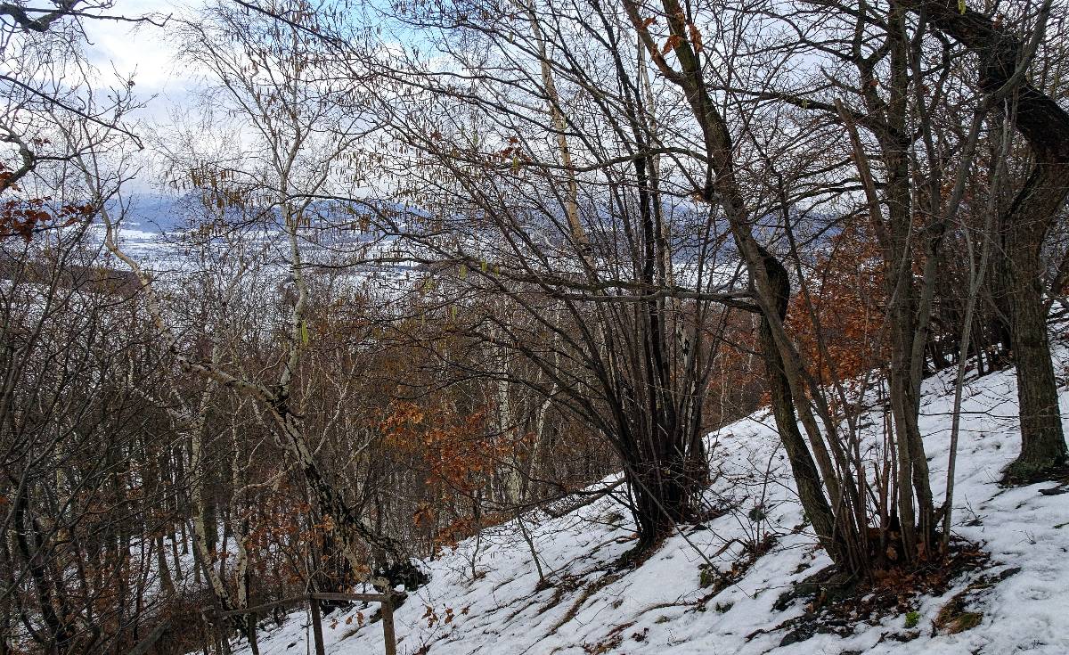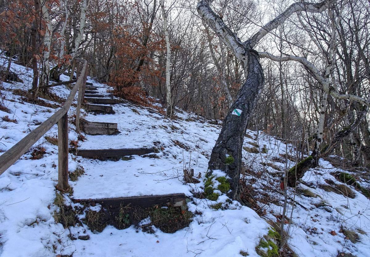 Vracíme se do Režného Újezda a vydáváme podle kapličky, studánky a plotu s hrníčky po zelené vzhůru naučnou stezkou Boreč. Dnes tu jdeme jako první a prošlapáváme mokrý sníh. Přesvědčujeme se, že vrch je opravdu teplý, protože jak stoupáme, sníh ubývá a přibývá zeleného mechu. Na schodech se zábradlím nabírám tempo, protože mlhavo prorazilo sluníčko a já prostě MUSÍM doběhnout na vyhlídku na České středohoří než se zase schová. To sluníčko. Zleva Košťálov, impozantní Lipská hora před námi, Milešovka schovává hlavu v mraku. Tady už není žádný, vůbec žádný, jen blátivá kamenitá cesta. Páry vystupující jak z drobných skulin v zemi, tak z větších děr, upravených lidmi, jsou viditelné i za teploty nad nulou. Přesvědčujeme se tedy, že stojí za to vypravit se sem, i když počasí není zrovna ideální. Máme radost. Úplně cítíme, jak z nitra země vychází teplo. Skláníme se nad průduchy a okamžitě ztrácíme přehled, neboť brýle se zamlžují rychlostí blesku.