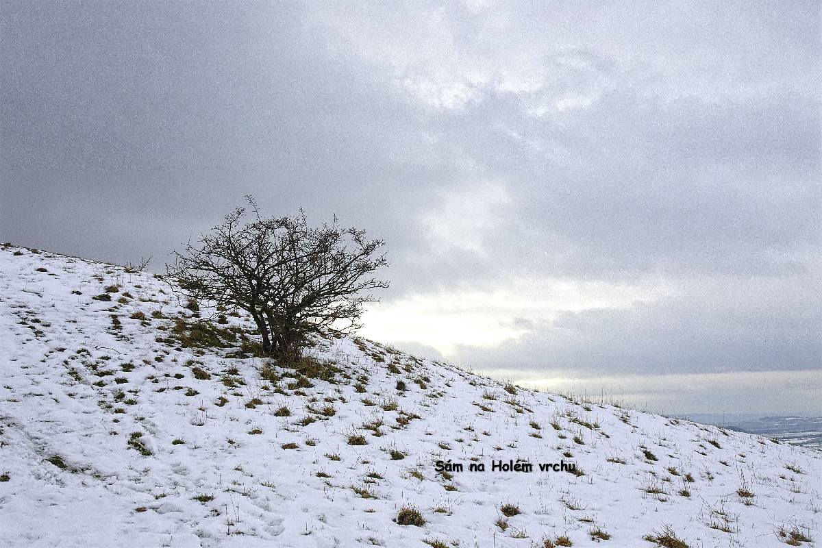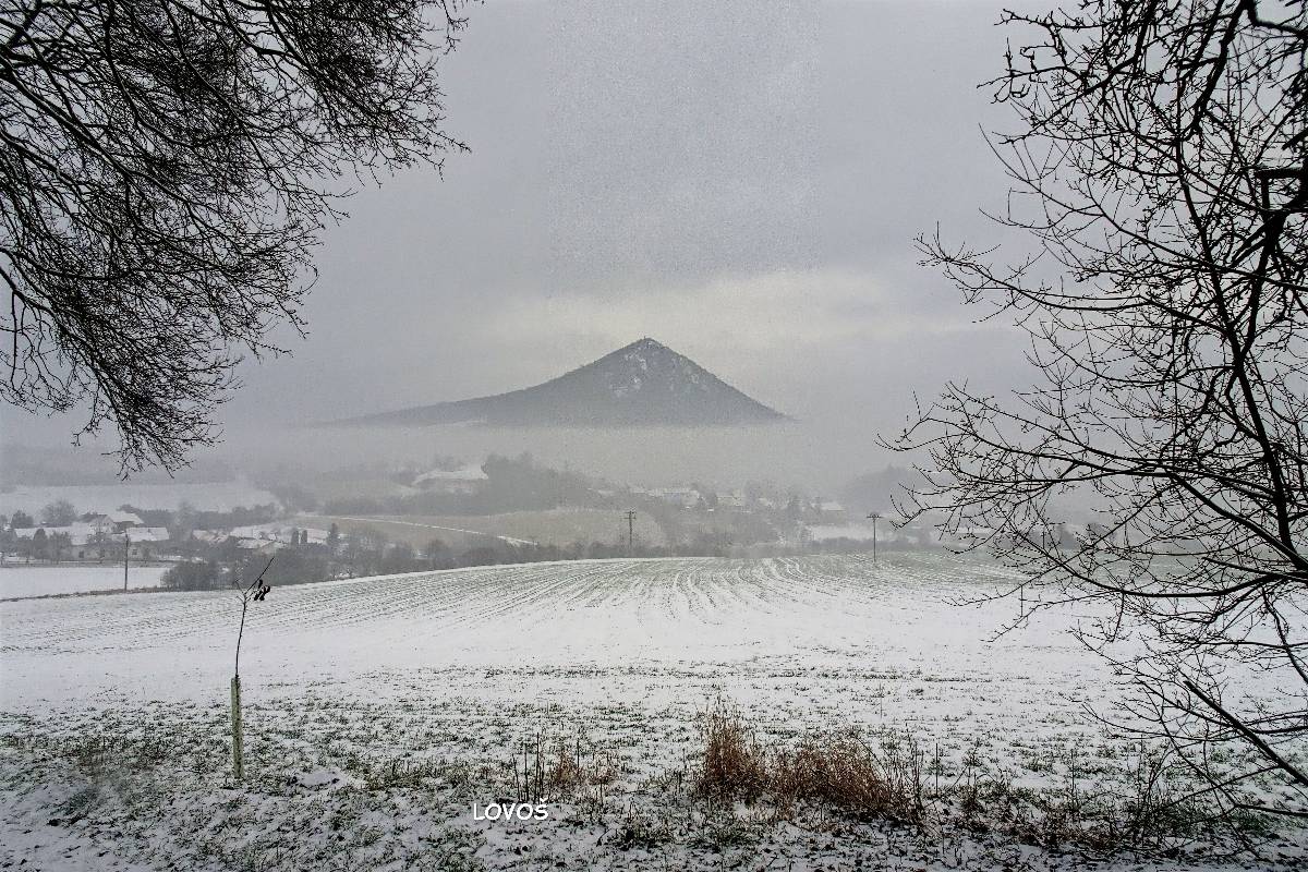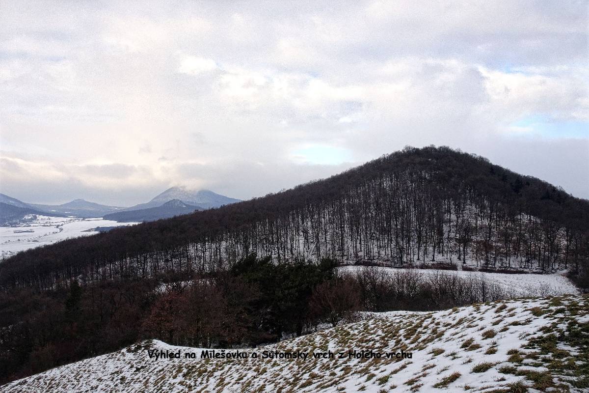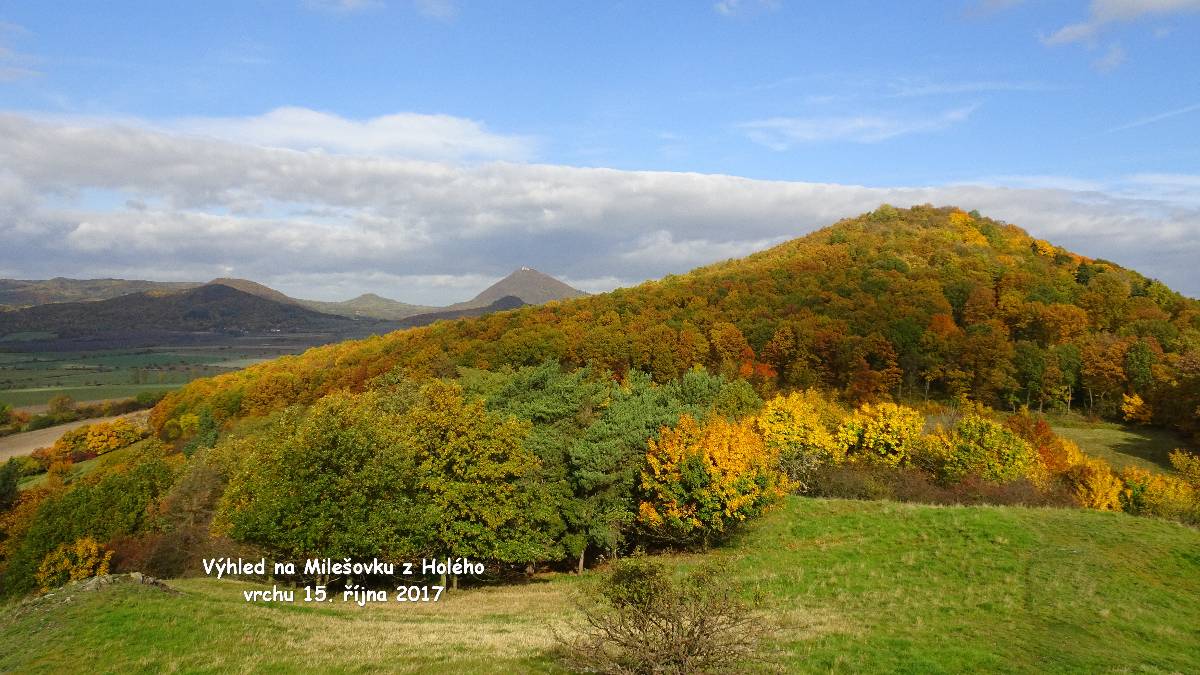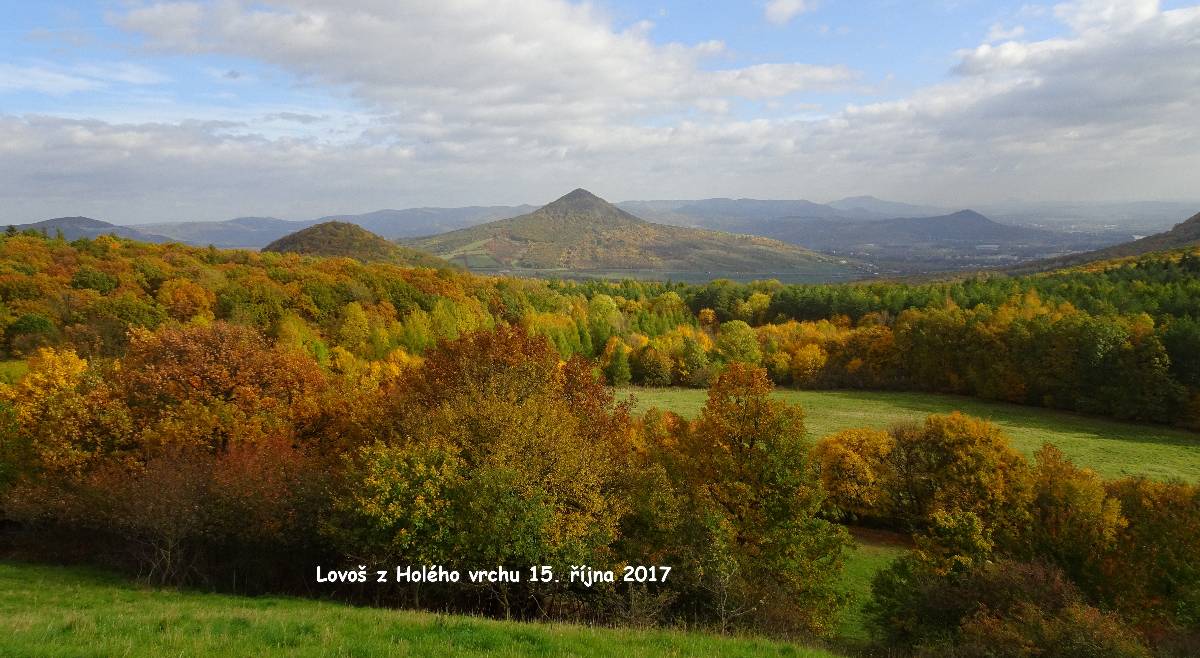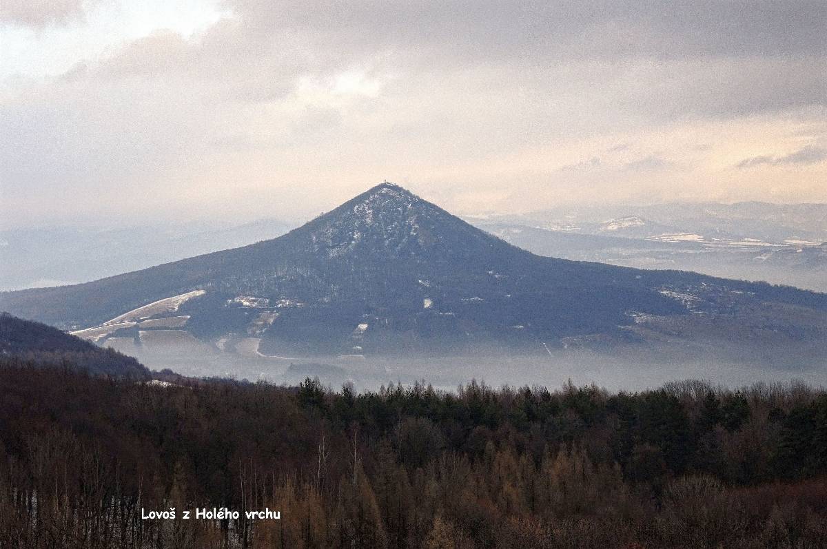 Domů se nám ještě nechce, a tak se z Borče vydáváme ještě na opodál ležící Holý vrch. Tam sice nevede turistická značka, avšak není problém tam dojít tu lesem, tu polní cestou. Výhled z Holého vrchu je v rámci možností báječný, a tak si zopakujeme svoje hurááá a jupííí z našeho podzimního výletu právě sem. Krajina pod Lovošem je při zemi zahalená do mlhy a nám nezbývá, než se do ní vrátit.