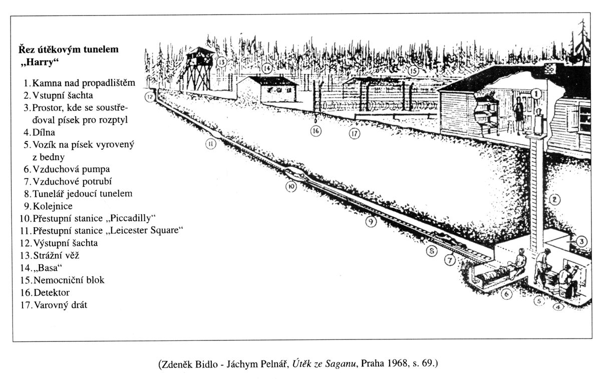 V zajateckém táboře Stalag Luft III v Saganu kopali letci celkem čtyři tunely, přičemž tunel zvaný Harry poté použili k útěku. Tábor byl v lesích, půda byla samý písek, takže se jim kopání dařilo. Velkým oříškem bylo, kam s hromadami vykopané hlíny. Vynášeli ji tzv. „tučňáci“ ve speciálně upravených nohavicích a poté roznášeli po táboře, který sloužil k internaci stovek zajatců. Bedřich Dvořák využil toho, že ve studentských letech pomáhal svému strýci, který byl krejčím v Hrochově Týnci, šít obleky, když u něho bydlíval při dojíždění do Pardubic. Civilní oděvy pro budoucí „utečence“ šil například z dek Červeného kříže.