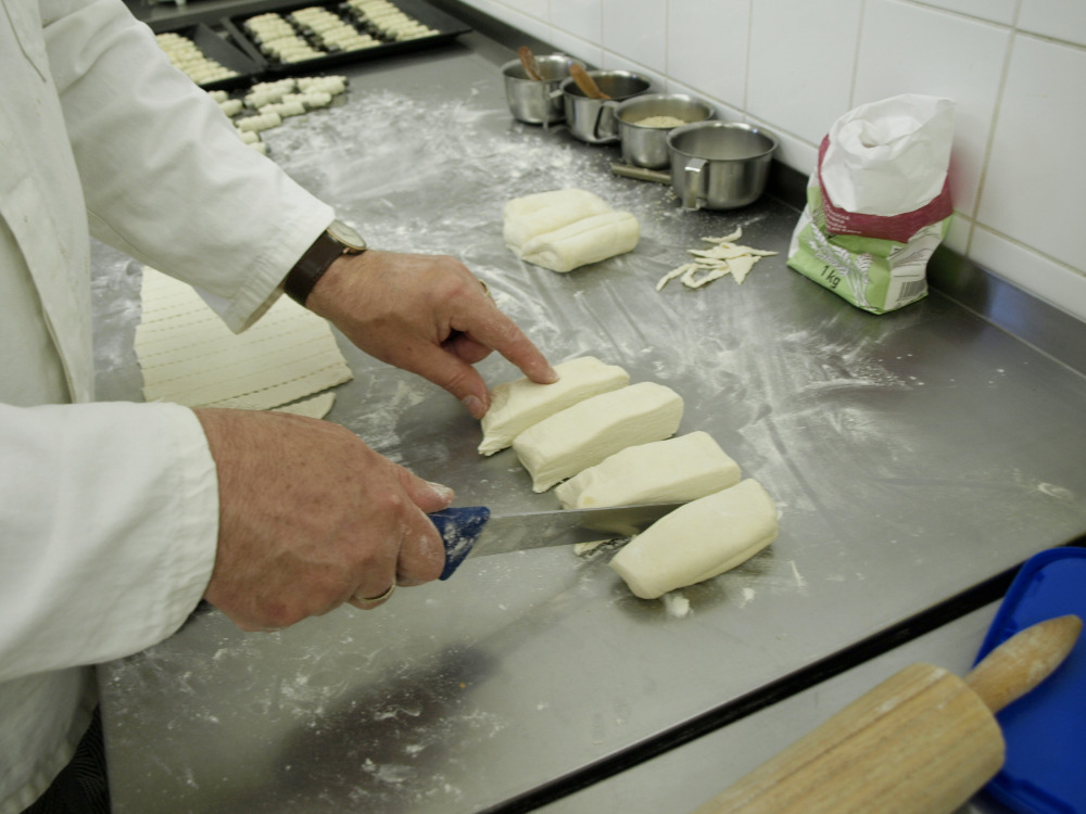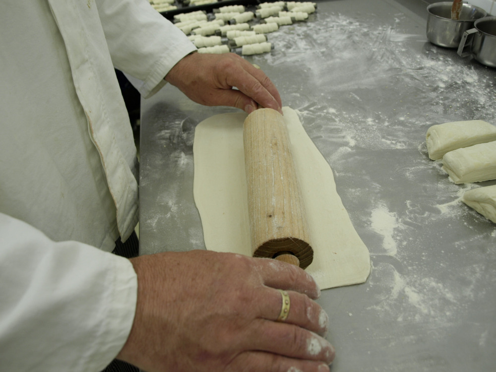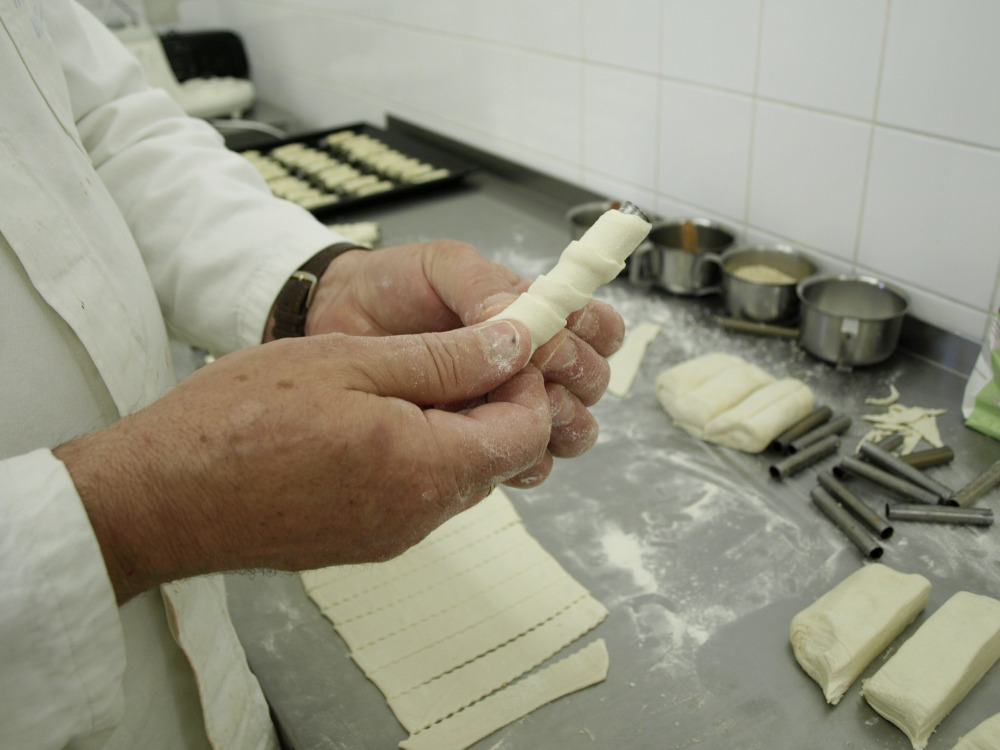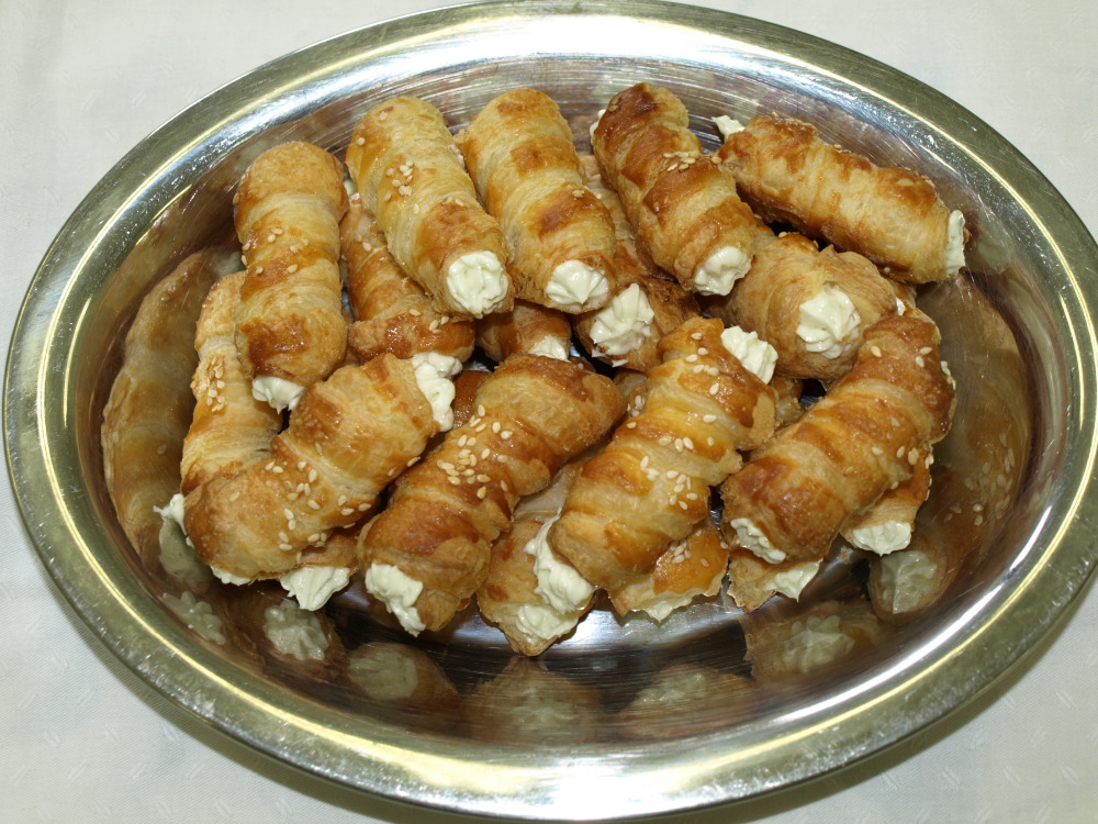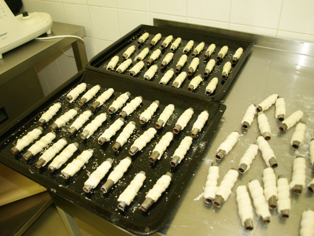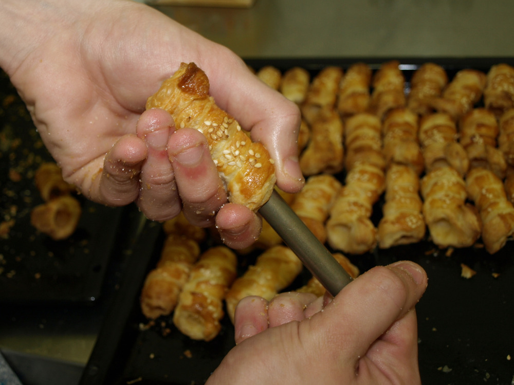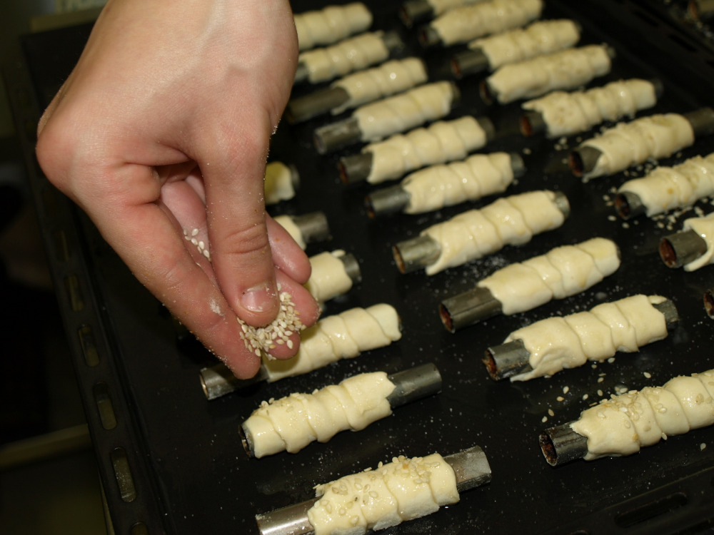 Listové těsto si rozválíme na asi deset centimetrů široké pásy na sílu stébla. Rádýlkem z nich nakrájíme dvoucentimetrové pásky, které navíjíme na malé, tukem lehce potřené kovové trubičky, které lze koupit v prodejnách s domácími potřebami. Tento polotovar potřeme rozšlehaným vejcem a posypeme sezamovým semínkem. Zprudka upečeme v rozpálené troubě na 250 st. C.