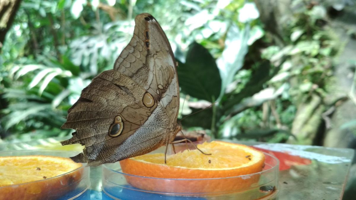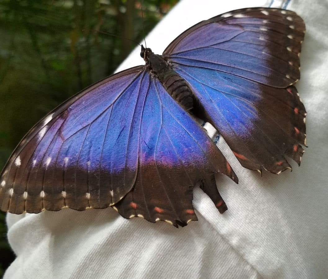 Na rameni mi usedá Morphopeleides, magický motýl z čeledi babočkovitých. Když dá k sobě křídla, vypadají jako hnědý sváteční přehoz s oranžovými kolečky. Když je roztáhne, rozehraje mi rameno blankytně modrou barvou. Už šestnáctou sezonu pestrobarevná křídla rozehrávají zelené barvy rostlin ve skleníku Fata Morgana.