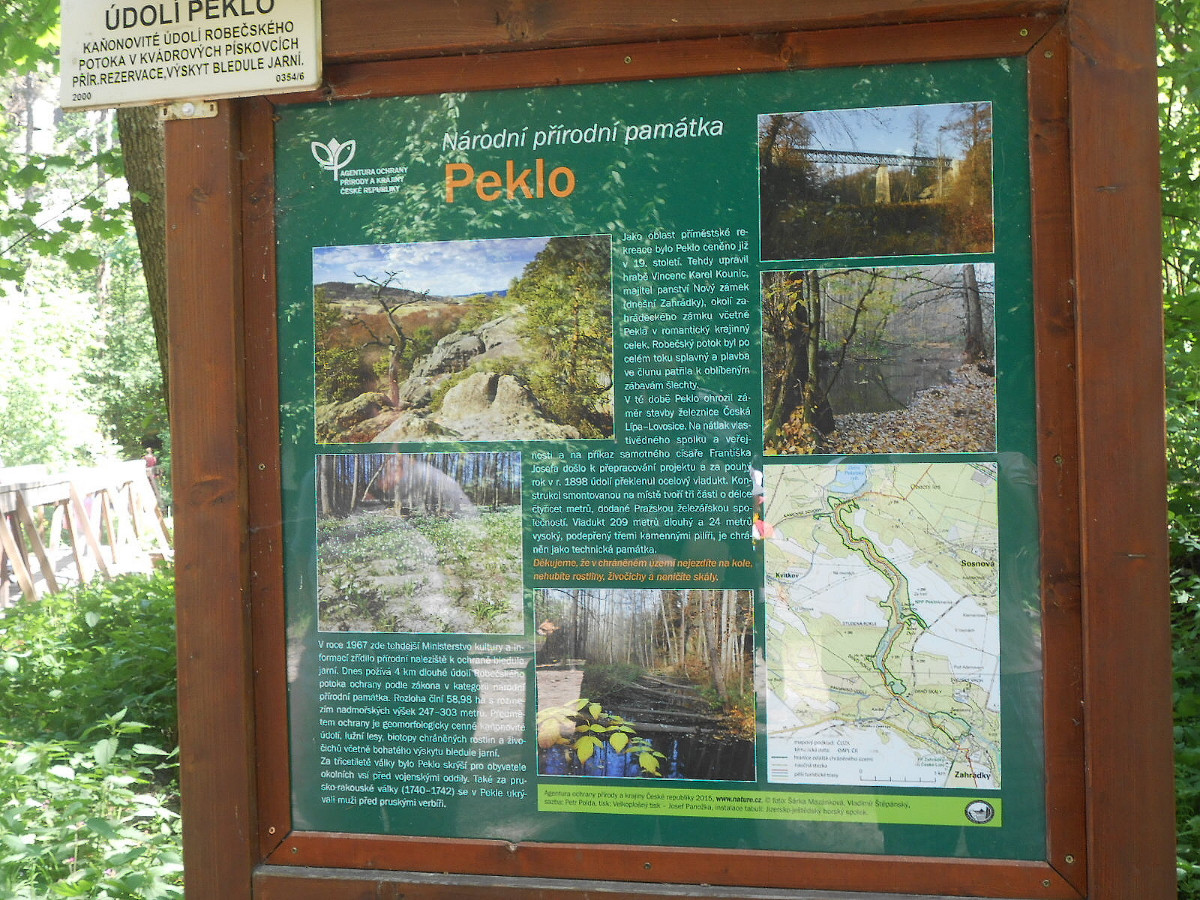 To už bylo v pohodě a my jsme zdárně všichni dorazili do Zahrádek na Českolipsku, kde naučná stezka do Pekla začíná. Jedná se o Národní přírodní památku v údolí Robečského potoka chráněnou od roku 1967 pro geomorfologicky cenné kaňonovité údolí, lužní lesy a chráněné druhy rostlin a živočichů. Je zde nejvýznamnější populace bledule jarní v Libereckém kraji. Podrobnější informace jsou dostupné na netu.