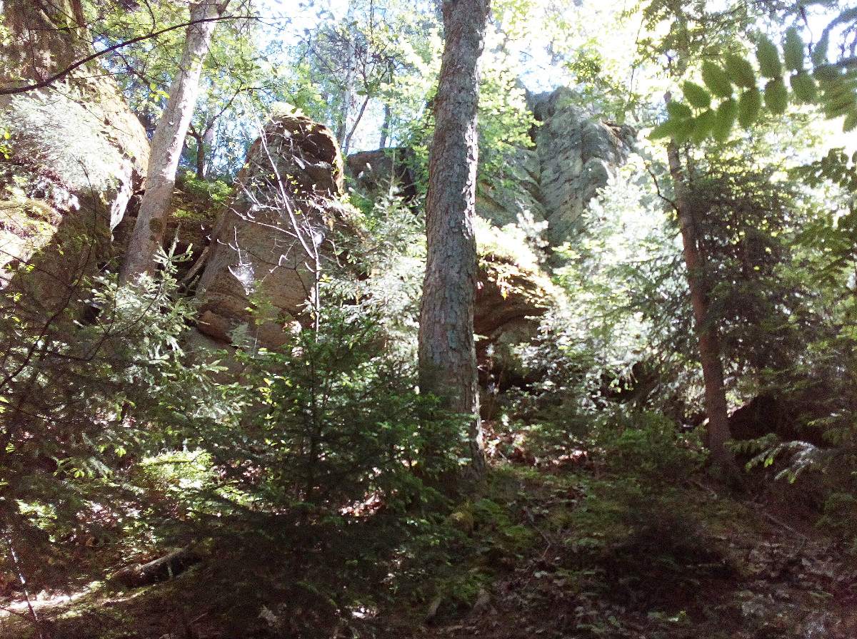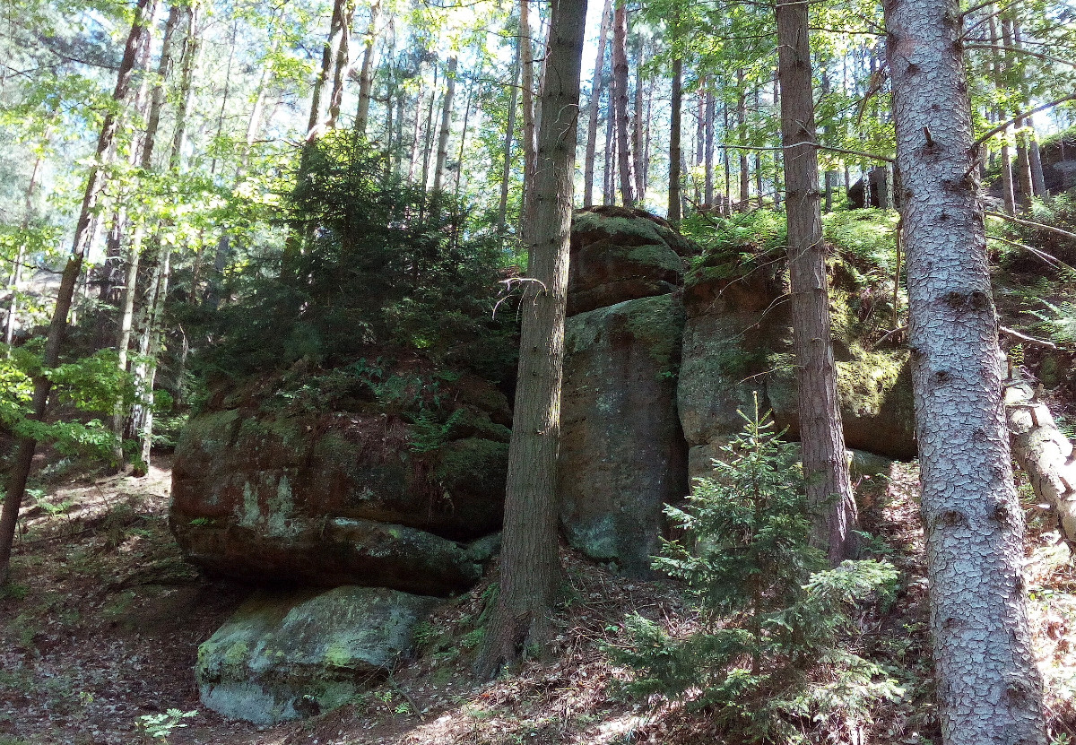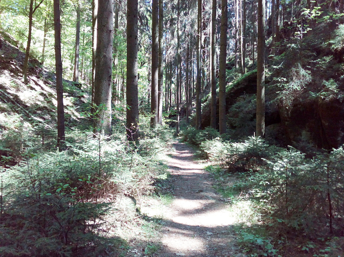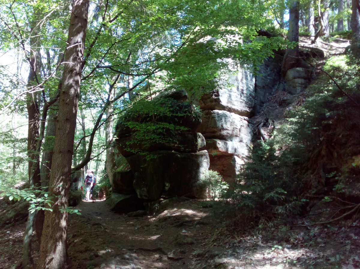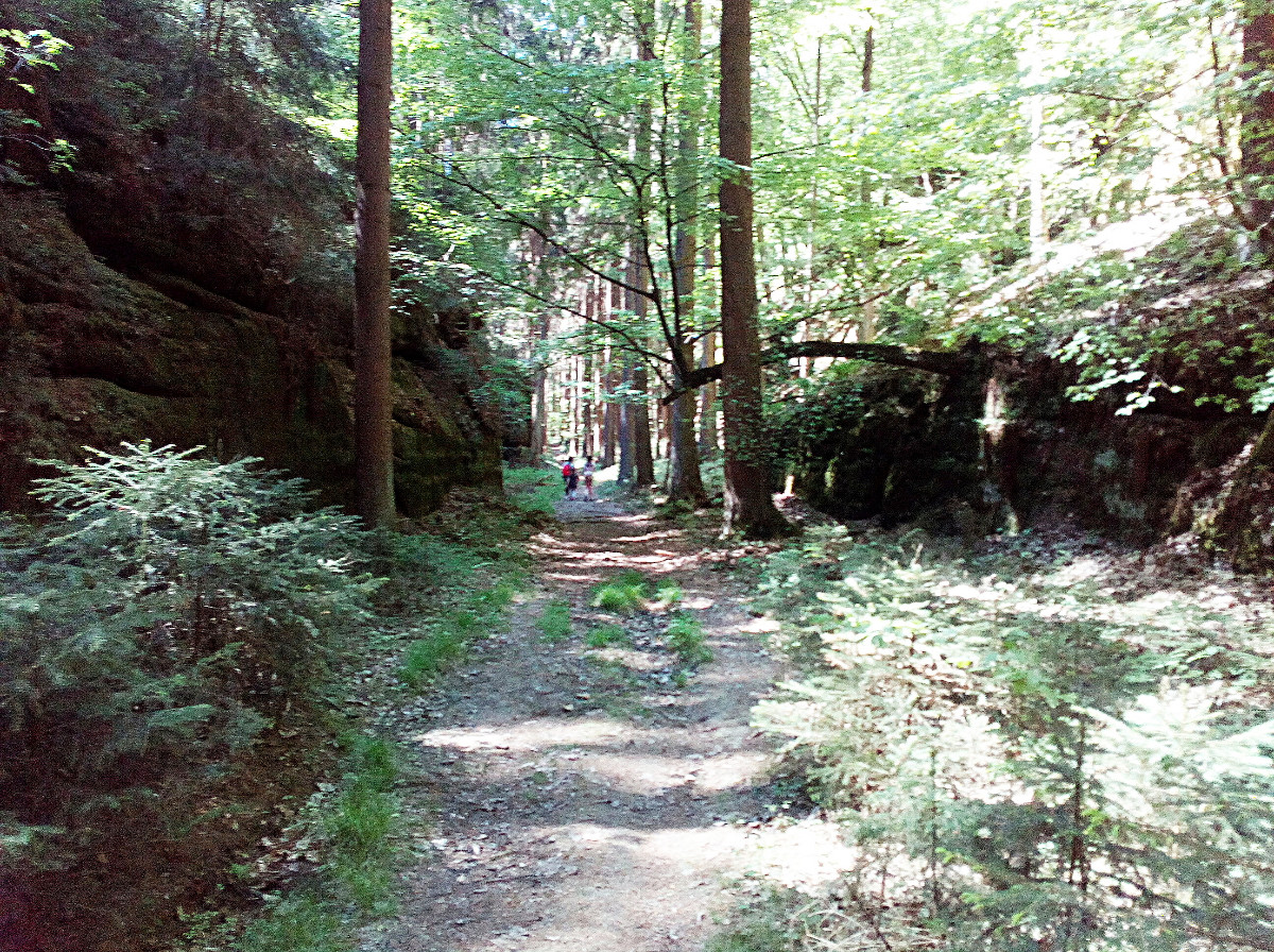 Cesta zpátky vedla mezi skalami a krásným zeleným lesem. Celková délka trasy naučné stezky je 6,5 km. My jsme asi celou neprošli, ale i tak to bylo dostačující. Dospělí, děti i pejsci si užili nádherný pobyt na zdravém vzduchu, byli jsme příjemně unaveni, cesta domů proběhla v pohodě a návštěvu Pekla mohu všem opravdu doporučit.