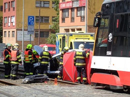 Museli odřezat dveře auta a řidiči dávali první pomoc, za červenou plentou. Rychle ho na nosítkách naložili do sanitky.
