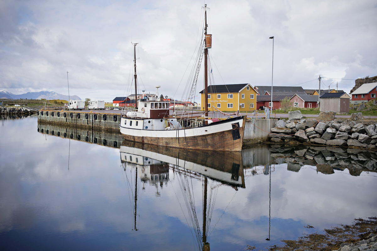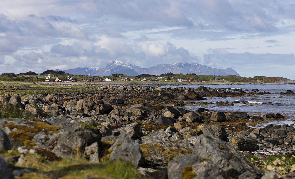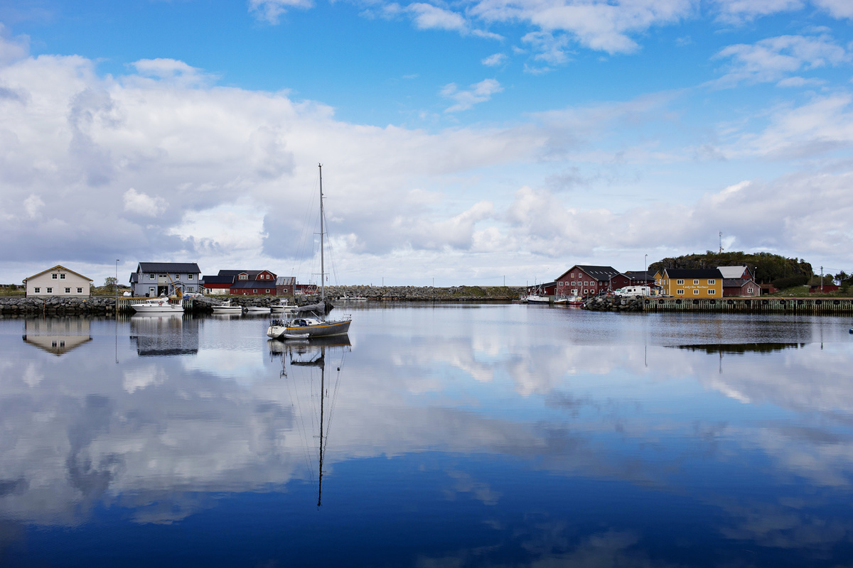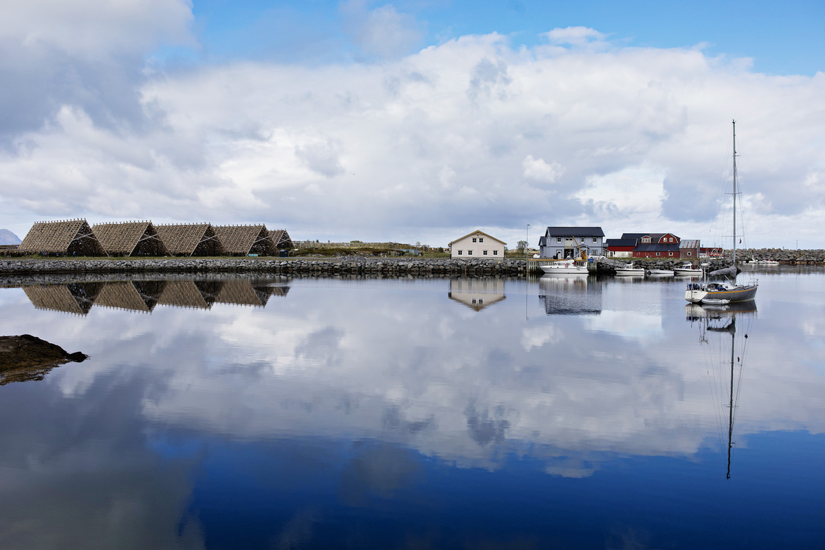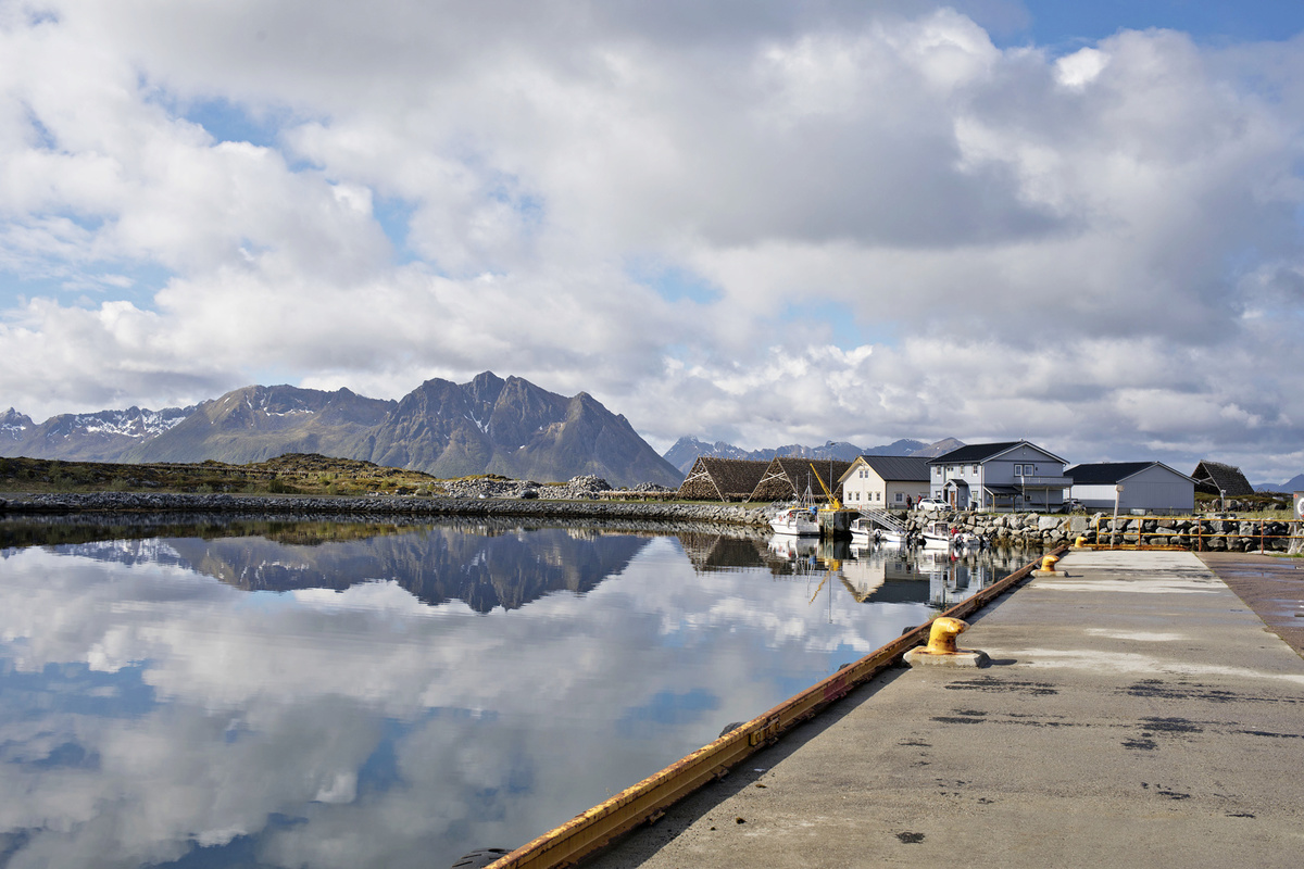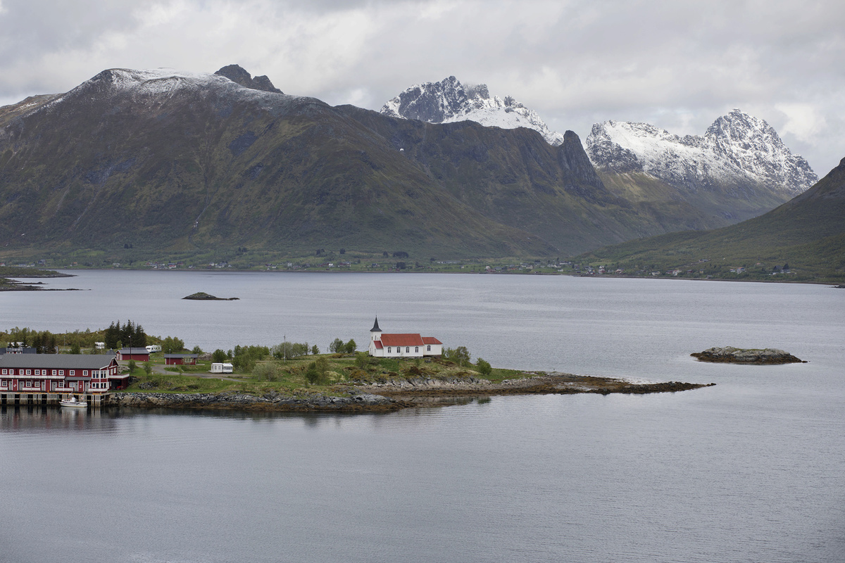 Krajina je totiž krásná, ne nadarmo se ostrovům říká „perly severního Norska“. Silnice vede mezi kopci, stáčí se přes fjordy, které projíždíme po mostech. Zelené louky jsou tady tak nějak zelenější, šedomodrou hladinu střídají zátoky s tyrkysovou vodou a bělostnými písčitými plážemi, která lemují skaliska. V zátokách „parkují“ rybářské loďky a nad nimi jsou posazené červené či modré domečky místních, což dělá z krajiny mimořádný kýč. Kýč, který si zamilujete a budete ho fotit pořád dokola. A nad tím vším se dramaticky pnou vysoké štíty hor.