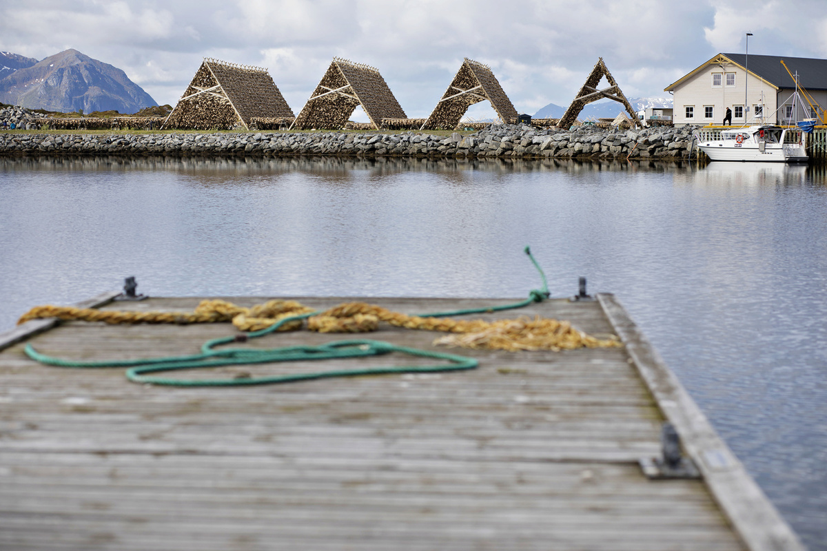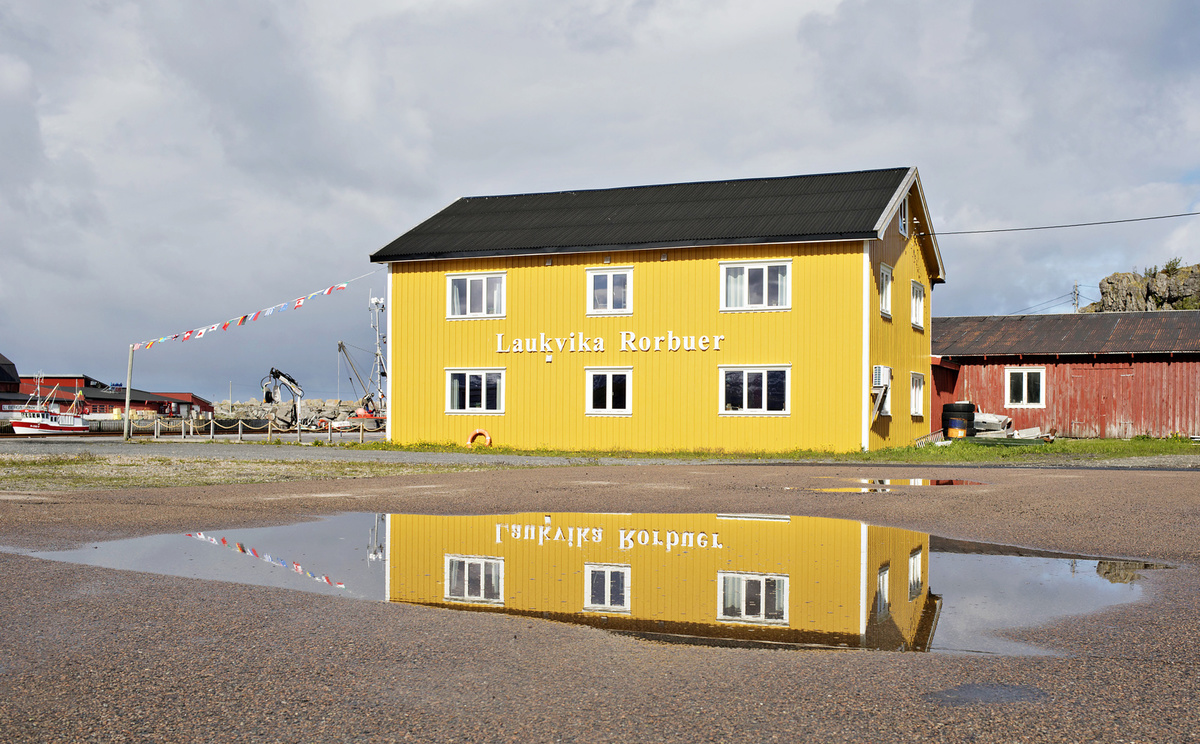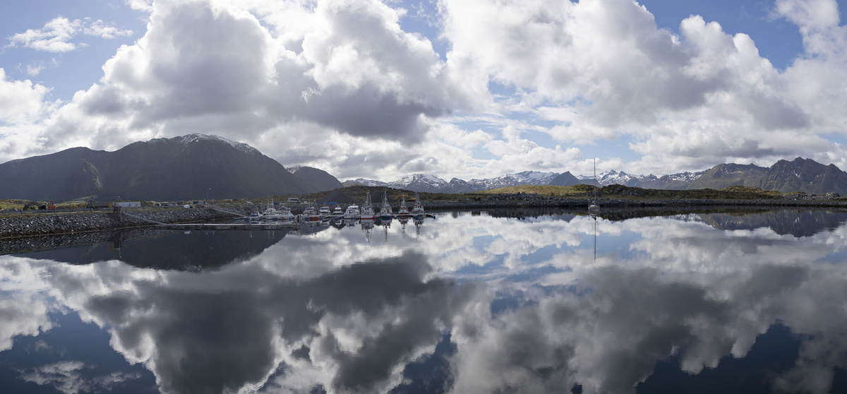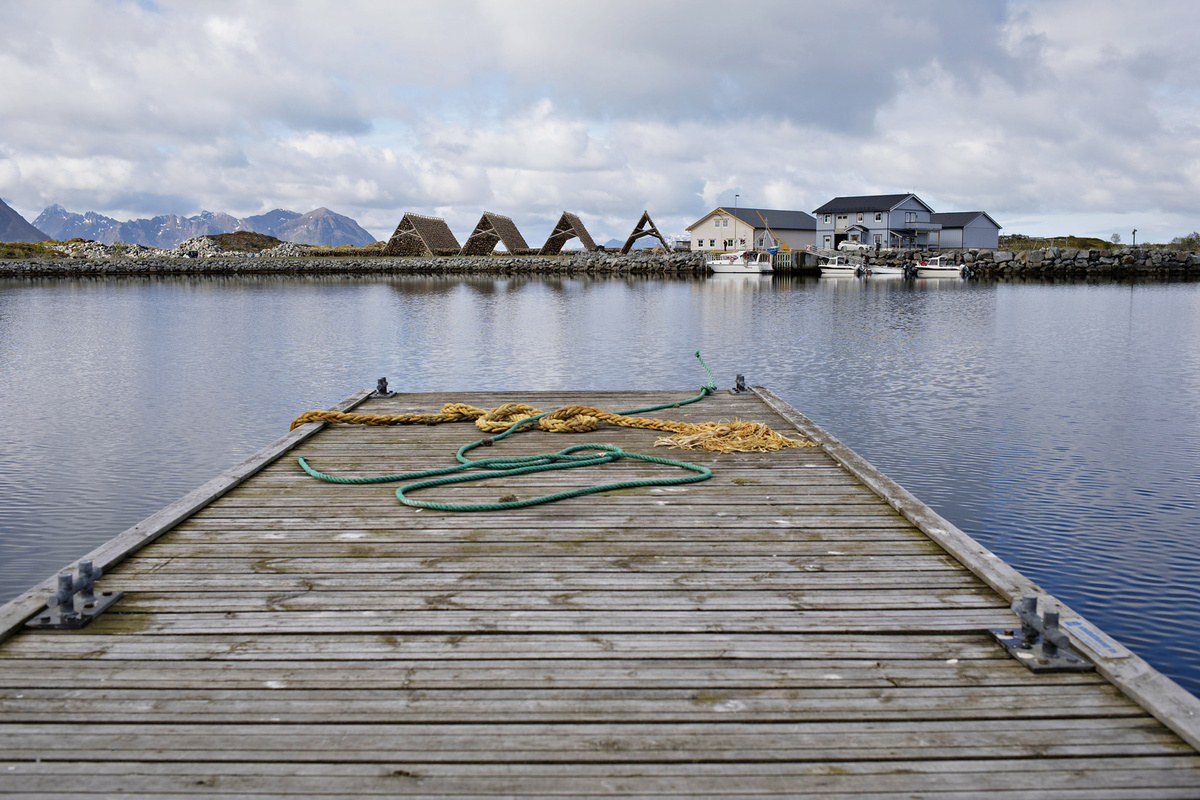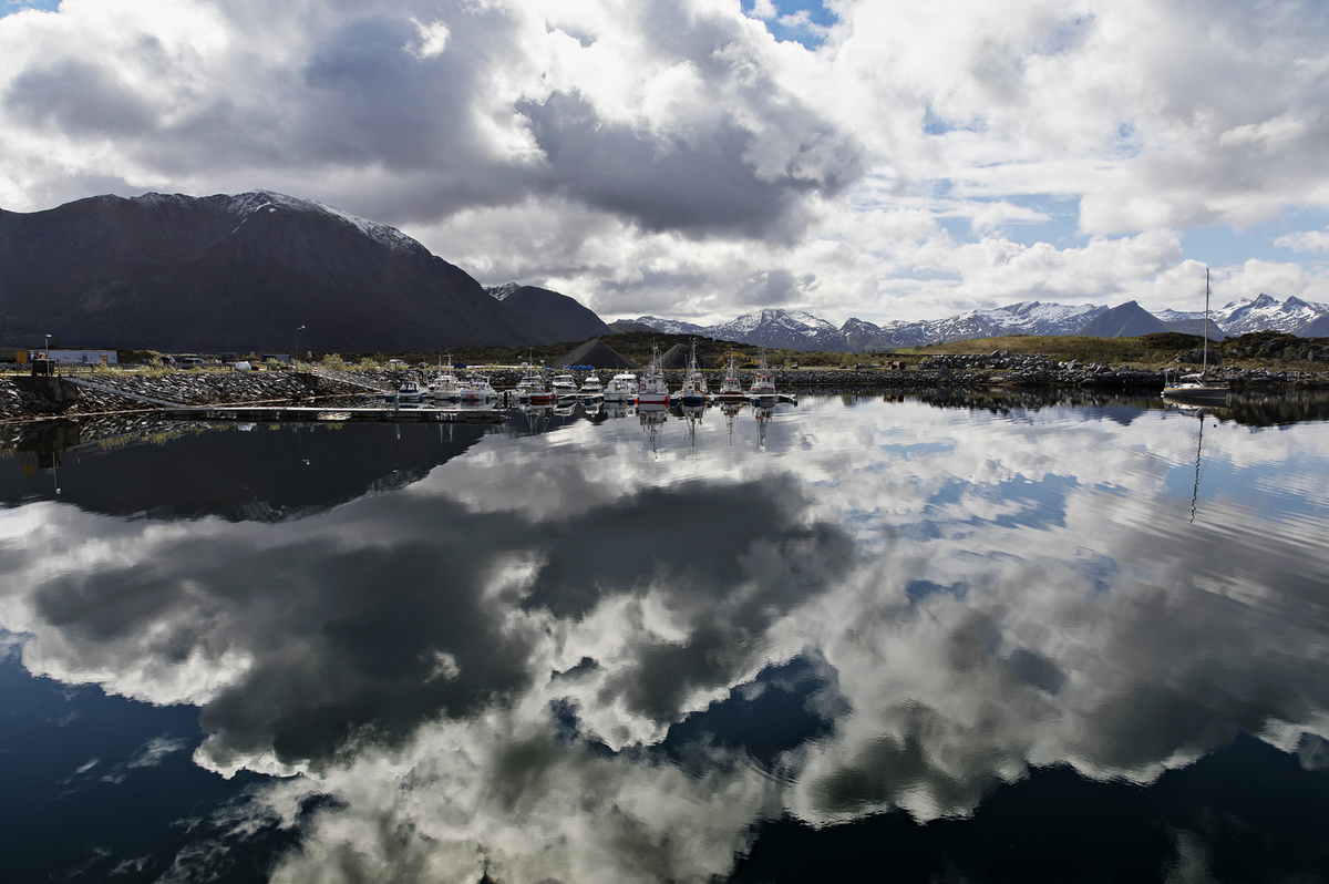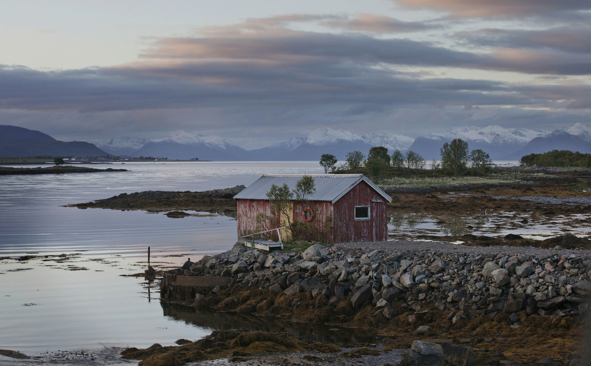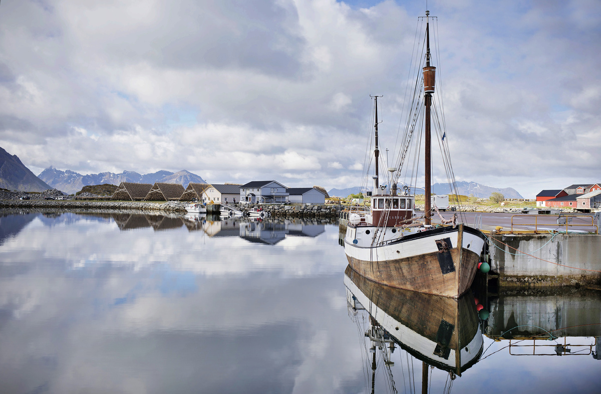 Krajina je totiž krásná, ne nadarmo se ostrovům říká „perly severního Norska“. Silnice vede mezi kopci, stáčí se přes fjordy, které projíždíme po mostech. Zelené louky jsou tady tak nějak zelenější, šedomodrou hladinu střídají zátoky s tyrkysovou vodou a bělostnými písčitými plážemi, která lemují skaliska. V zátokách „parkují“ rybářské loďky a nad nimi jsou posazené červené či modré domečky místních, což dělá z krajiny mimořádný kýč. Kýč, který si zamilujete a budete ho fotit pořád dokola. A nad tím vším se dramaticky pnou vysoké štíty hor.