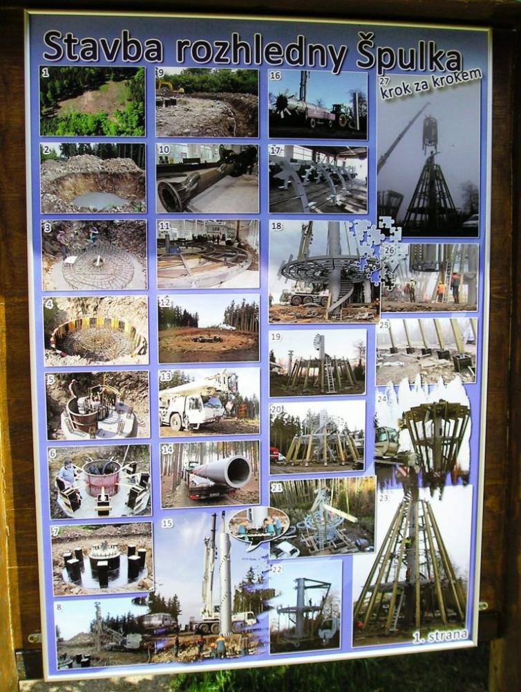 Je tam možno také „jako“ vylovit ryby, poučit se o včelkách a pak si všímat jednotlivých zastavení na „Ptačí stezce“, která Vás dovede až k rozhledně. Jistě oceníte i ekologický záchod – zelená kabinka, která je udržovaná v čistotě a nachází se v lese, asi v polovině cesty. - Mezi stromy se Vám za chvíli kráska Špulka ukáže v plné parádě. Je ze stříbřitého kovu a zábradlí kolem dokola je od zdola až nahoru z masivního dřeva, které jí přidává na kráse. Zajímavá je i kamenná plocha pod rozhlednou. Kameny jsou poskládány tak, že vyznačují hranice všech 21 obcí, za jejichž podpory vznikala. Každá ta obec zde má i svůj informační panel. Špulka tak i symbolicky vyznačuje jakési vzájemné propojení nitkami mezi všemi obcemi zde zastoupenými.