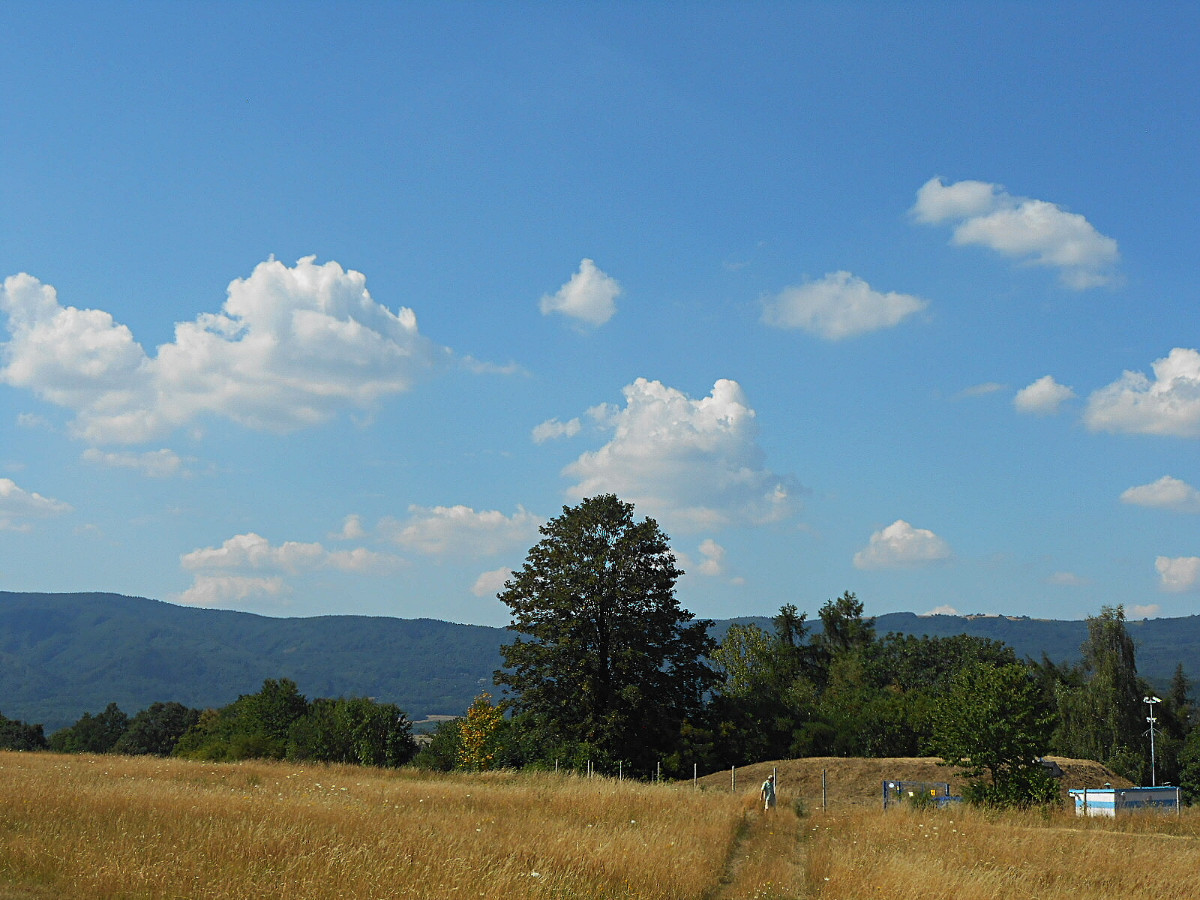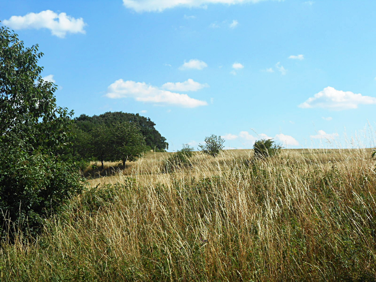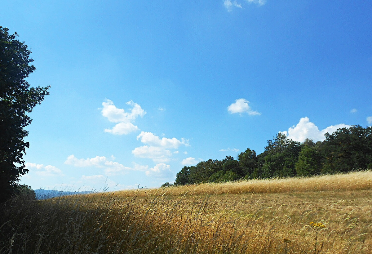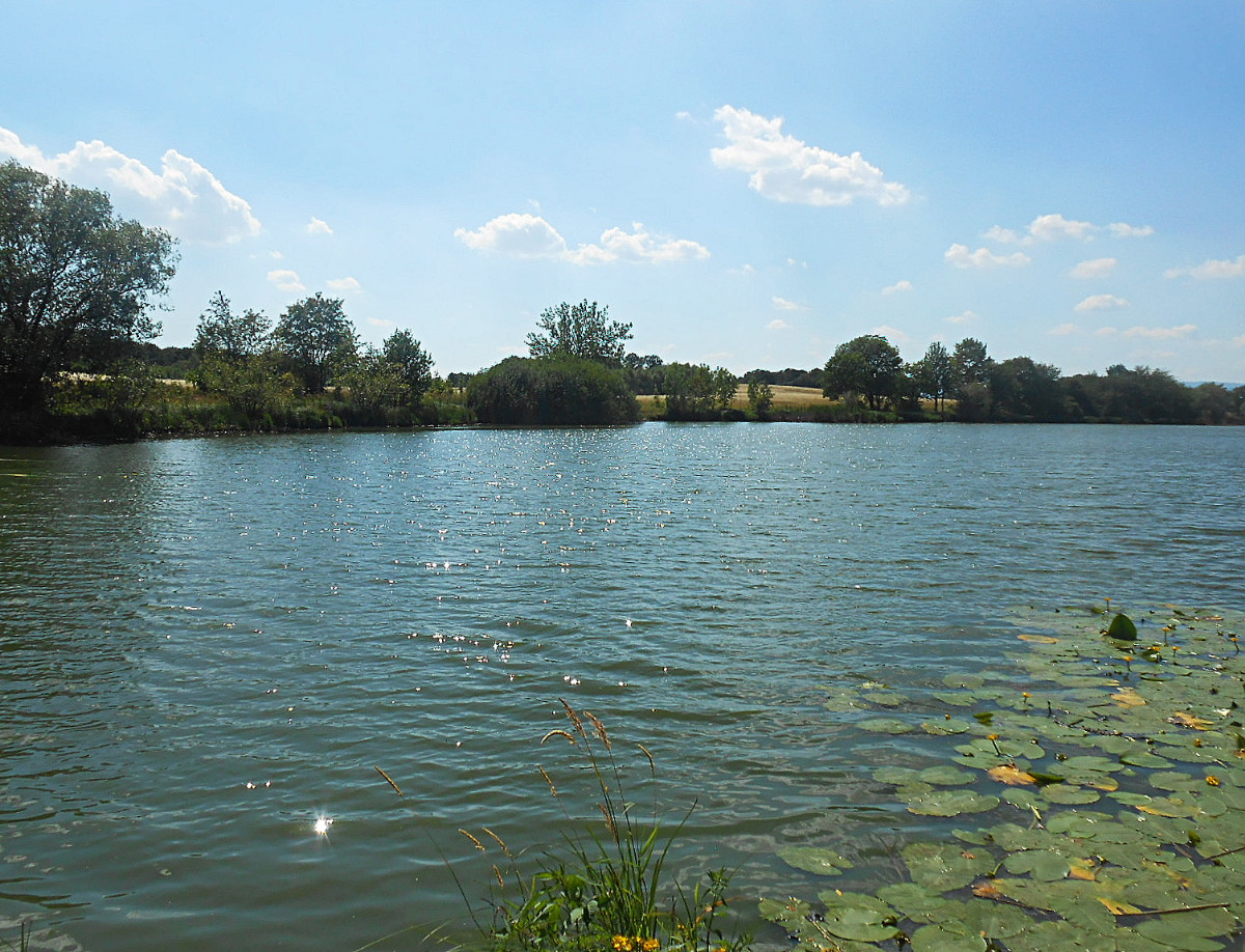 Nabízím nejen modré nebe, bílé obláčky, protože mraky se tomu dnes říkat nedalo, sluncem se lesknoucí vodní plochu rybníka se žlutými blatouchy, zeleň stromů, ale i krásnou barvu suché trávy.