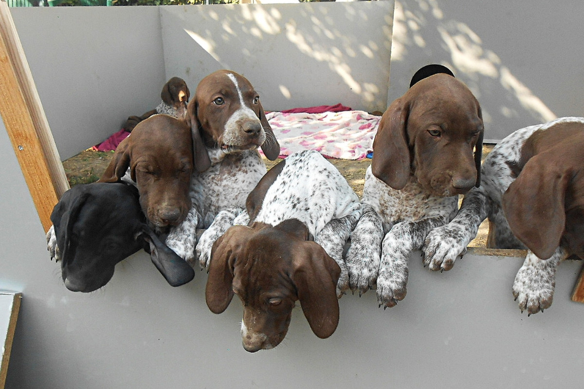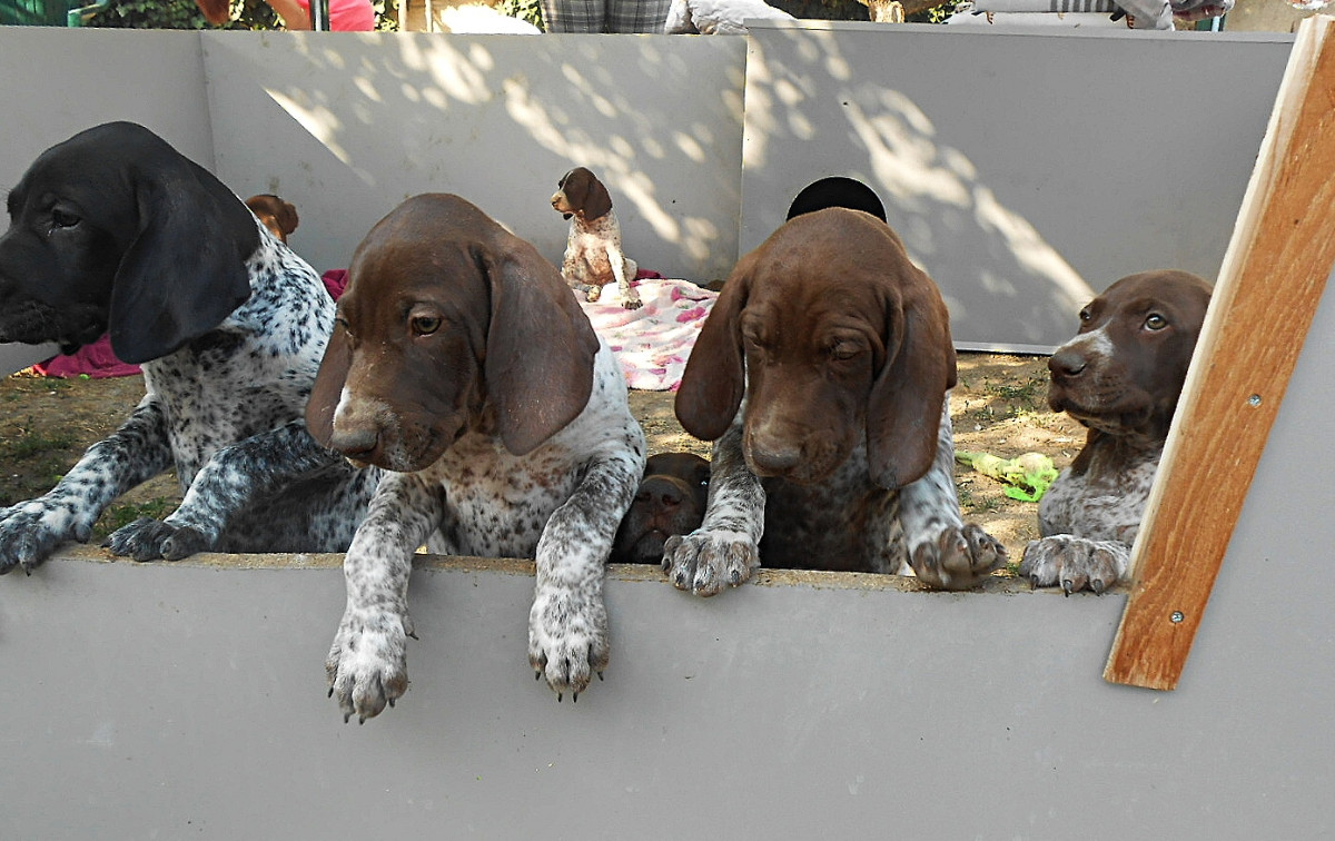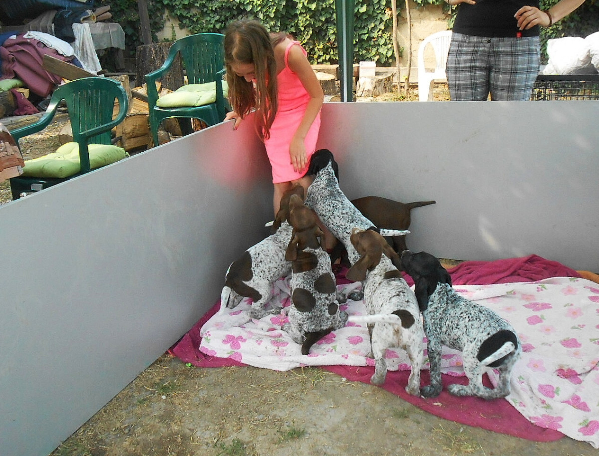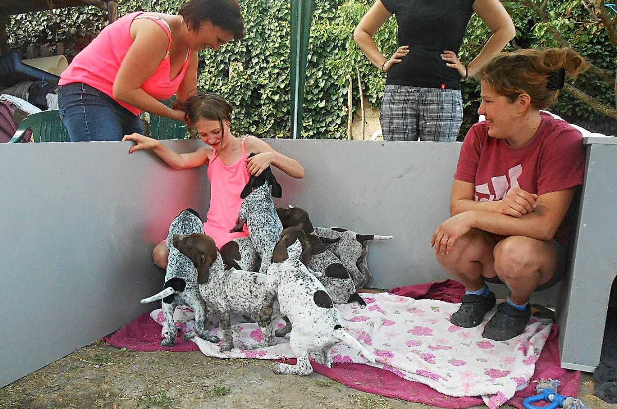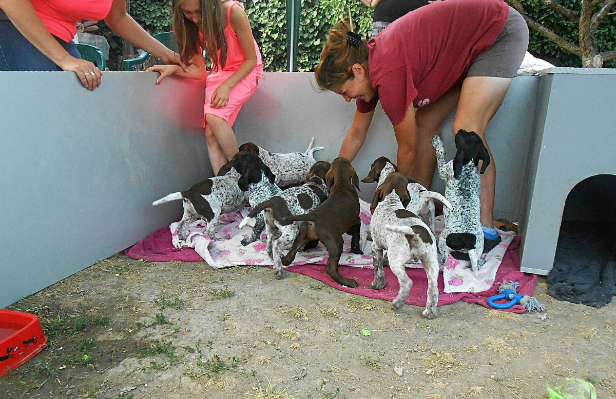 Ve středu 18.7. jsme se konečně mohli jet podívat k dceřině kamarádce do Miřejovic na štěňátka. Je chovatelkou německého ohaře a letos má 9 kousků, 6 fenek a 3 psíky. Je to vždycky velká legrace, protože vyfotit 9 rozběhaných a rozpustilých štěňat je snad horší, než pytel blech. Ale pytel blech bych opravdu nechtěla. Jména ještě nemají, ale musí být od D, tak nezávidím to vymýšlení.