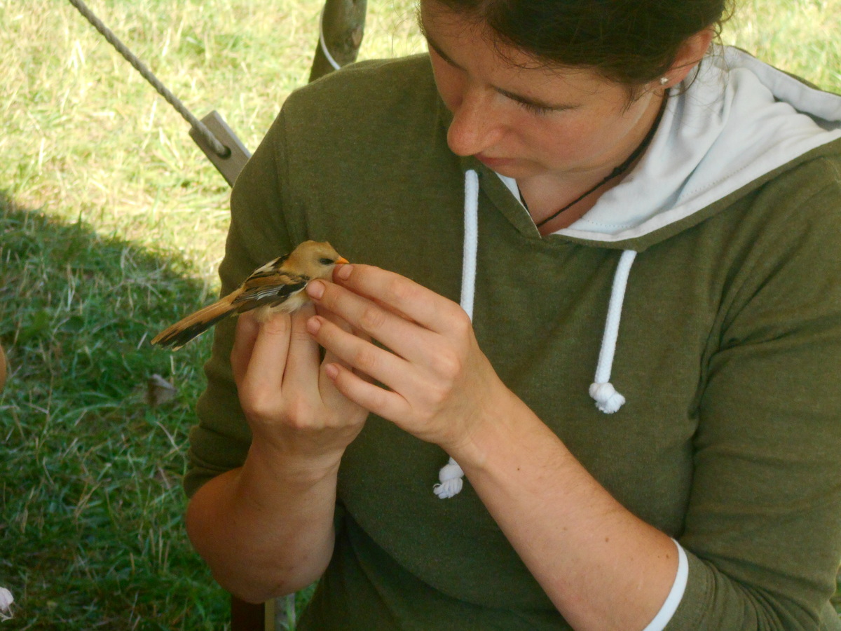 V ranních hodinách jsem se vydala na kole na rybník Řežabinec, do tábora ornitologů z Prácheňského muzea v Písku. Probíhal zde již 42. ročník výzkumu a kroužkování ptactva. Rybník je obrostlý rákosím a zde v určitých místech se natáhne 220 m lehounkých sítí na záchyt. Po ránu se jich nejvíce zachytí, vyprostí a donesou v plátěných pytlíčkách do tábora.