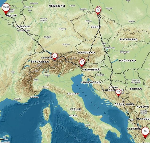 Takže to zopáknu: Startuje se v neděli v noci v Belgii za svitu pochodní. Přesně ve 22,00. Závodníci vyjedou nahoru a pak již každý pokračuje svou vlastní cestou do Řecka. Trasu si zvolí podle svého uvážení, jen musí povinně navštívit čtyři kontrolní body. Jeden z nich je blízko hranice ČR a Polska – na krkonošské Špindlerovce. Tam by se mohl Leoš dostat zhruba příští sobotu. Dáme vědět.