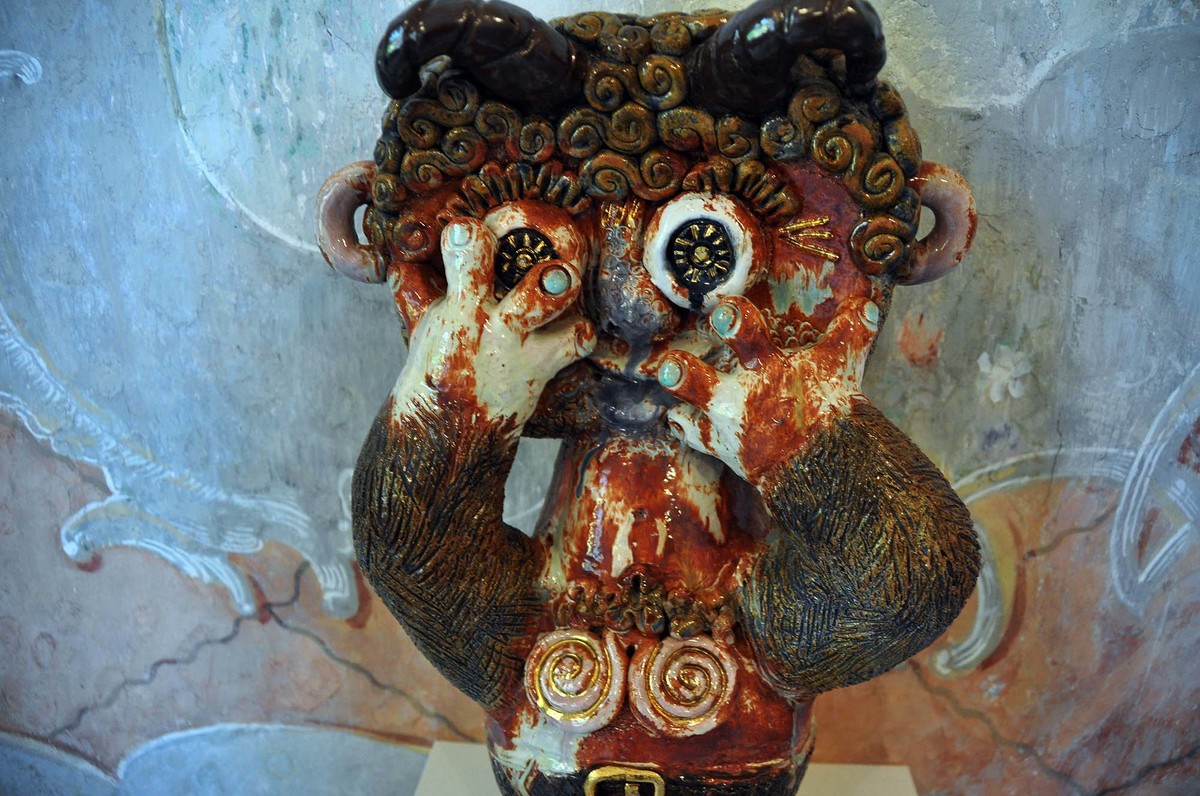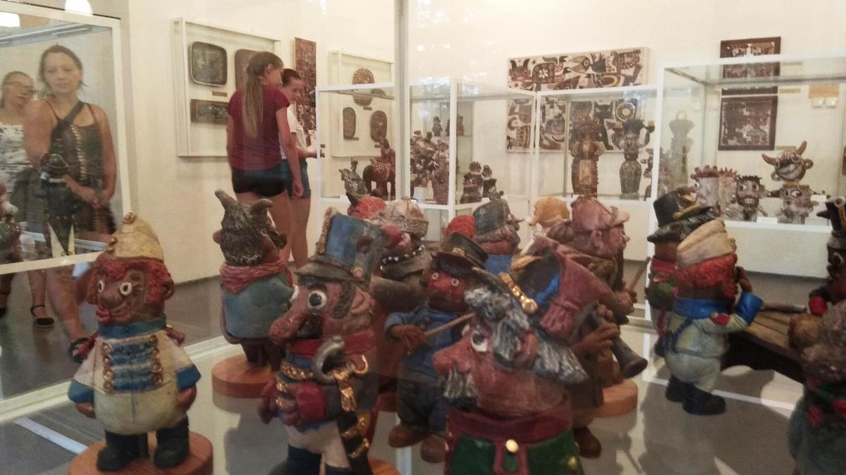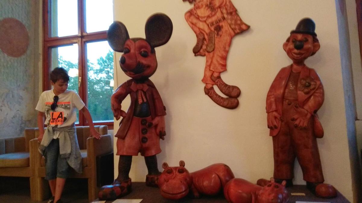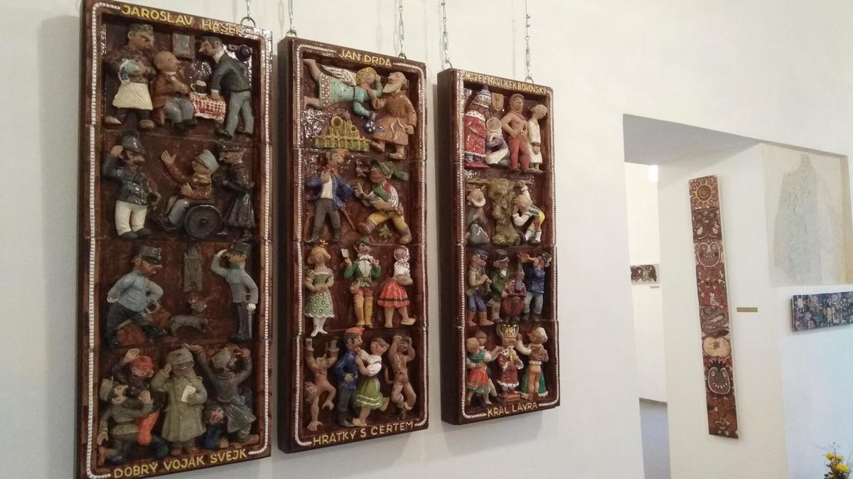 V další místnosti zaujmou fantaskní, přitom prý ovlivněné každodenní situací, díla Vladimíra Vítečky, který spojuje keramickou hlínu s kovem. Pak návštěvníky pohladí po duši dřevořezby manželů Milady a Jaroslava Kundrátových z Bukovan. Tvorbě ze dřeva se věnovali třicet let, začali vyřezávat pohádkové bytosti, například parádního Mickey Mouse, později se vrhli na zvířátka. Takže po čarodějnicích, vodnících, ježibabách, čertech, cirkusácích a klaunech si můžete prohlédnout i hrochy, pejsky, kočky i žirafy.