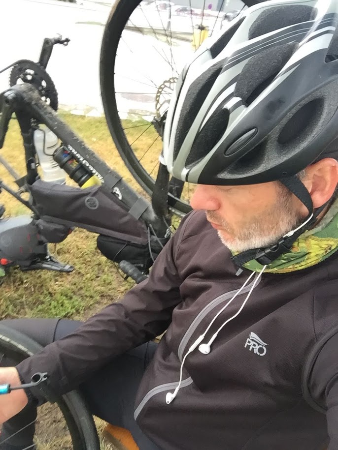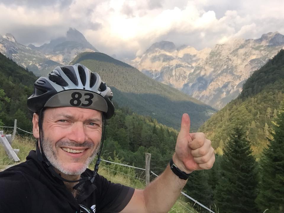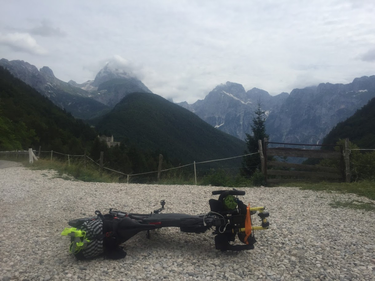 Zdvižený palec je někde od Triglavu v sobotním ránu. Kolo na cestě = další Leošova „náladovka“. Pak detail, když opravuje kolo. Titulní fotka z Alp je moje, fotil jsem to v červnu v údolí, kterým Leoš projíždí (proto tam vidíte oblačnost, kdežto oni mají většinou krásnou oblohu).
