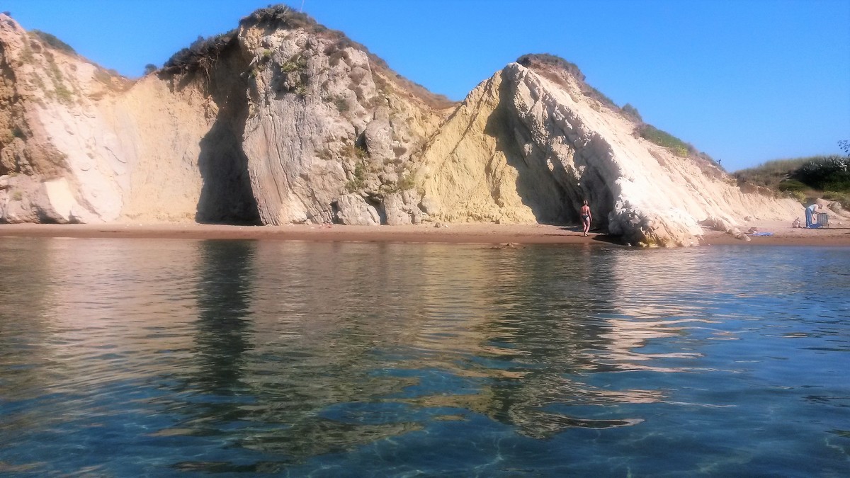 Když se dáte naopak doprava, uděláte další velké: Ach. Uvidíte velký skalní masiv, přesněji hromadu gigantických kamenů zřícených při jednom z zemětřesení. A mezi nimi jsou úchvatné malé plážičky, jeskyňky. Působí to, jako by člověk byl na některé z těch odlehlých pláží, na které se jezdí auty a pak schází po spoustě schůdků nebo se dají dosáhnout po úctyhodném turistickém výkonu, jenže my jsme na pláži, která je pár metrů od hotelu, od centra letoviska. Je to neuvěřitelně krásné místo a je zajímavé, že nikdy není přeplněné tak, aby to bylo nepříjemné. Spíše než turisté ty písčité  plážičky využívají místní řecké rodinky. Brodíte se bosky ve vodě, která sahá jen ke kotníkům, jdete dál a dál, vidíte další zátočinky a pak zase písečnou pláže, která, zdá se, vůbec nekončí. Po písku se tam dá  jít další desítky metrů, kdekoli sebou plácnout na ručník, vlézt do moře, které je pořád stejně plytké, teplé, čisťounké a plné mušlí.