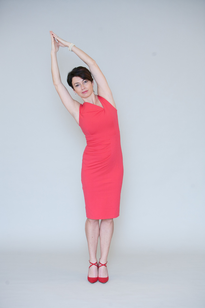 Zůstaňte ve stoji a obě ruce vzpažte. Chodidla mohou být u sebe nebo mírně rozkročená. Spojte si dlaně nad hlavou, nadechněte se a s výdechem vytáhněte spojené paže mírně do strany. Pohyb je vedený nejprve vzhůru a pak stranou. S dalším nádechem vraťte paže nad hlavu a s výdechem cvik proveďte na druhou stranu.